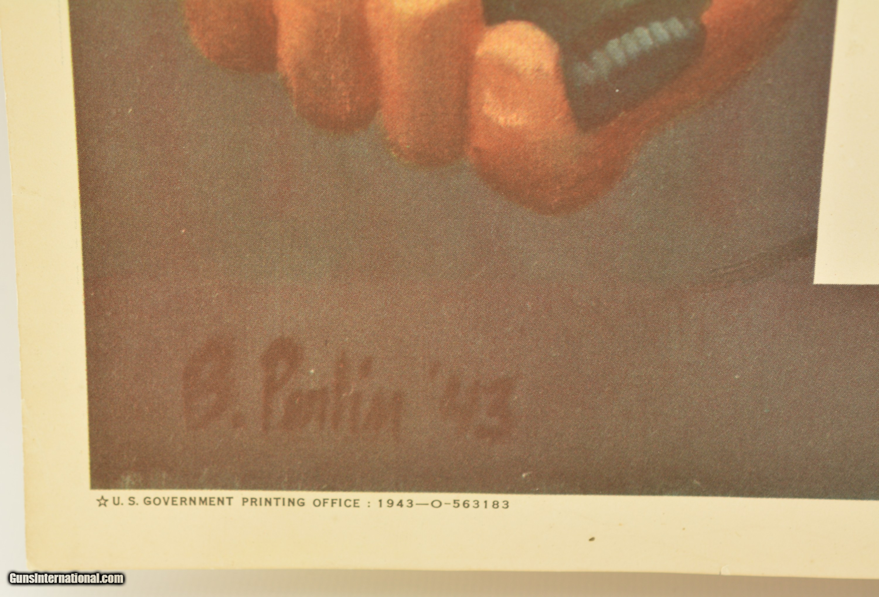 Description: This original poster shows a soldier preparing to throw a grenade under the heading "Let 'em have it" "Buy extra bonds" U.S. Govt. Printing Office 1943 -0-563183-official U.S. Treasure Poster-WFD 879A. Excellent condition with folding creases from the original mailer. This was a "Personal Appeal" piece which were considered to be most effective. This work was done by Bernard Perlin who worked for Life and Fortune magazine. Poster measures 20x28". A great piece shown on page 204 of "Posters of WWII" by Peter Darman. SOLD Manufacturer: U.S. Model: Poster |
