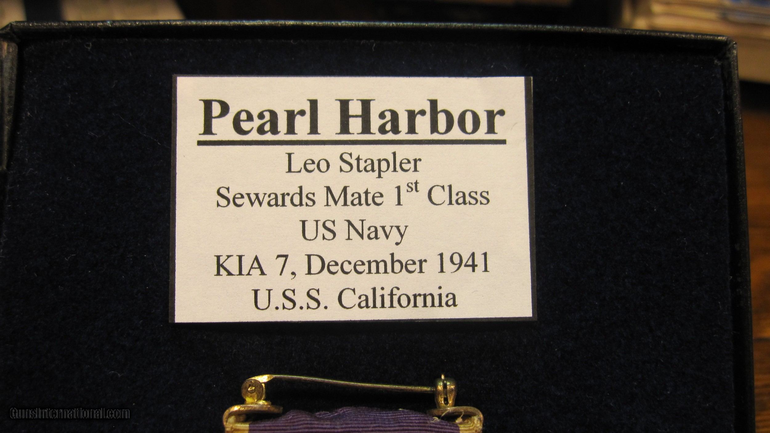 Description: This Purple Heart was awarded to the family of 21 year old Leo Stapler who was KIA aboard the USS CALIFORNIA on 7 DEC 1941 at PEARL HARBOR. He was one of 102 men to lose their lives that day on the sinking of the CALIFORNIA. please call 973-214-3407 with questions SOLD |