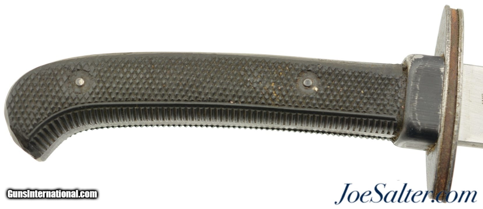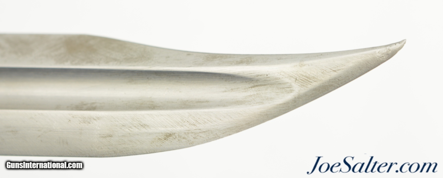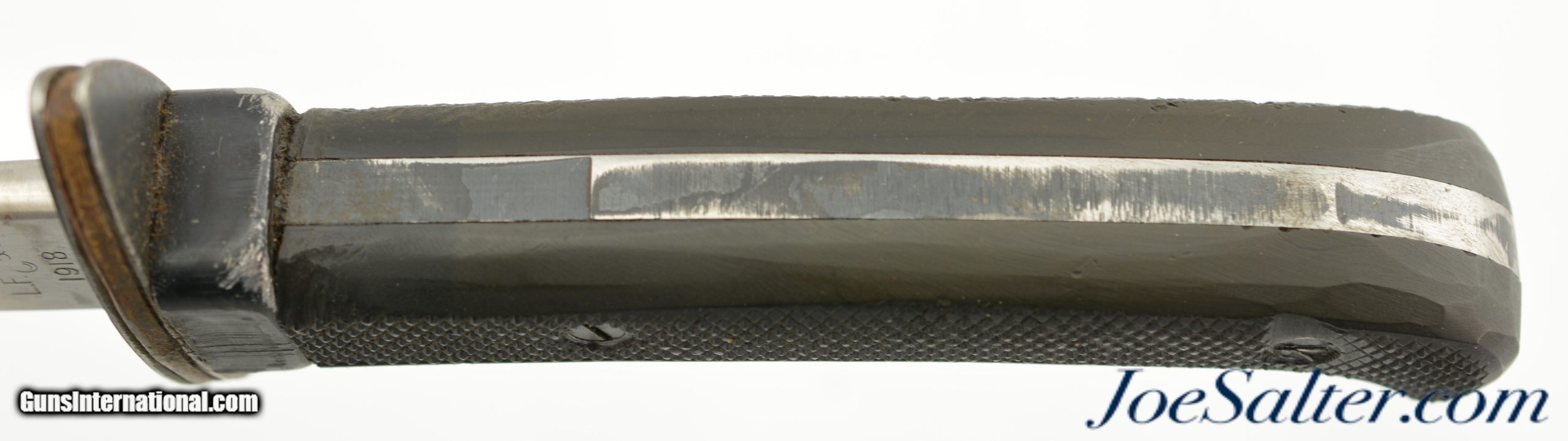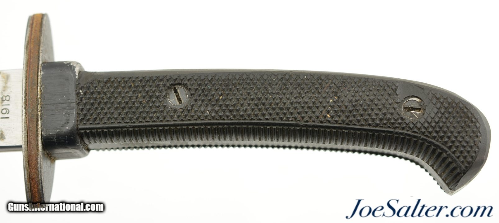 Description: This is an amazingly rare US WWII San Antonio Iron Works Fighting Knife with leather Scabbard. This fighting knife was produced from a 1913 Patton Cavalry Saber at the San Antonio Iron Works, San Antonio TX. The original sword was produced by "L.F. & C." (Landers Fray & Clark) with approximately 93,000 produced by them and 35,000 by Springfield Armory. The 8 1/16" blade is in excellent condition with what appears an original SAIW ground edge and tip. It is marked on the ricasso "L.F. & C." 1918 and on the reverse "US" over N0. 13 with Eagle Head. The guard and tang are excellent with only the lightest of surface oxidation. The sheath is also correct and marked with the soldiers name and number on the back. It remains in excellent condition with fine patina and strong tooling. This information can be referenced on page 184 of Bill & Debi Wright's book, "Theater Made Military Knives of WWII" and page 185 of M. H. Cole's book "U.S. Military Knives Book III". This is a great opportunity to own a are WWII fighting knife. SOLD |