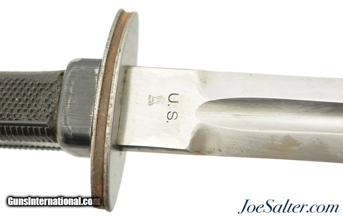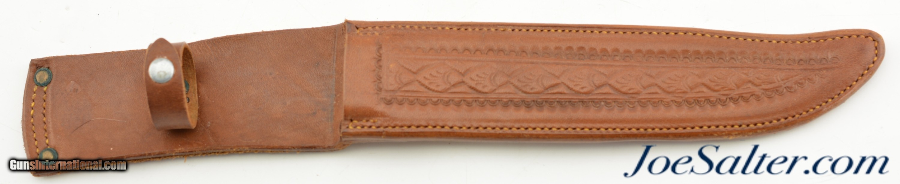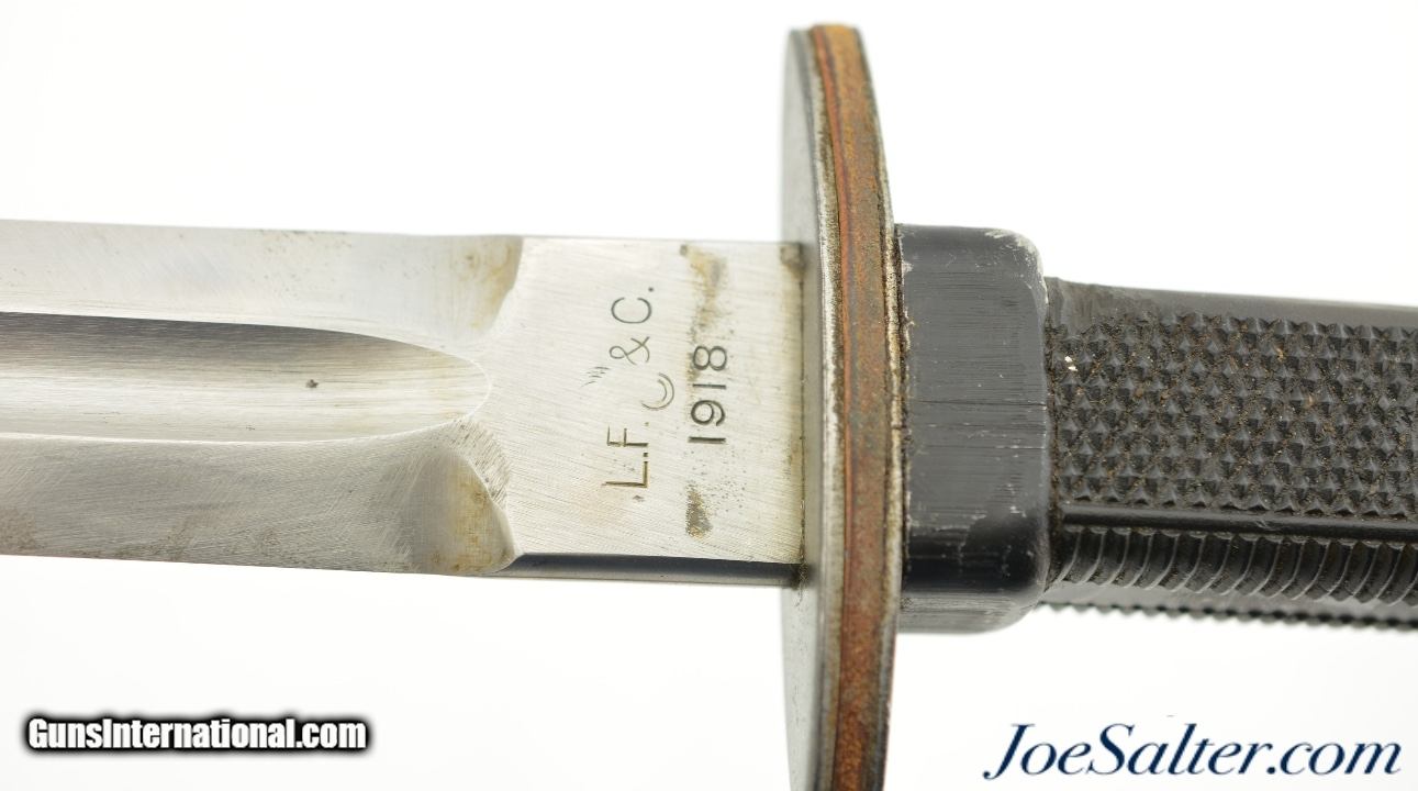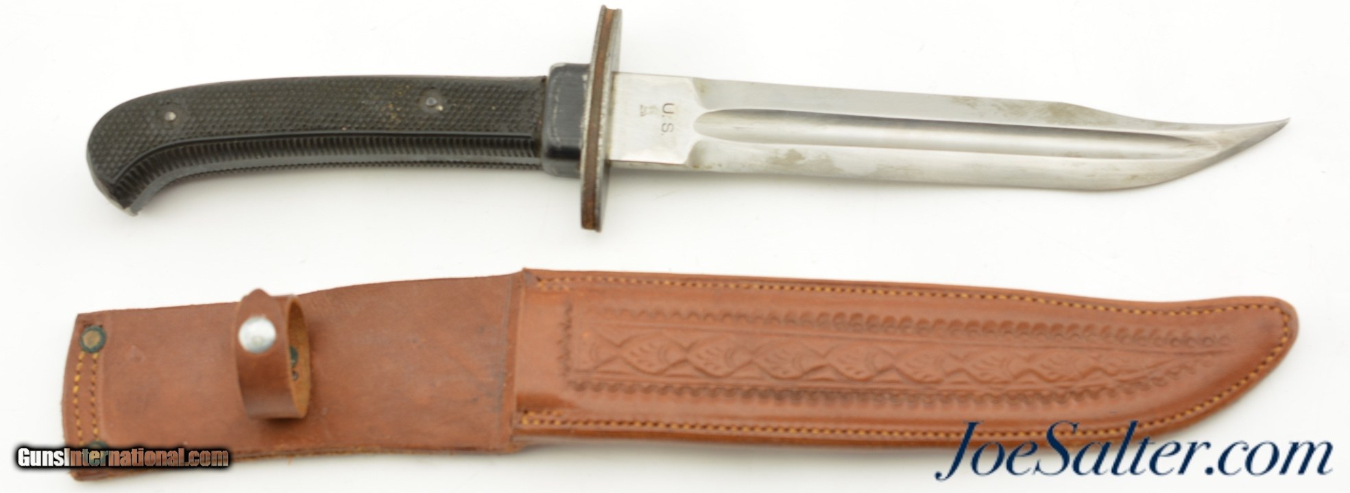 Description: This is an amazingly rare US WWII San Antonio Iron Works Fighting Knife with leather Scabbard. This fighting knife was produced from a 1913 Patton Cavalry Saber at the San Antonio Iron Works, San Antonio TX. The original sword was produced by "L.F. & C." (Landers Fray & Clark) with approximately 93,000 produced by them and 35,000 by Springfield Armory. The 8 1/16" blade is in excellent condition with what appears an original SAIW ground edge and tip. It is marked on the ricasso "L.F. & C." 1918 and on the reverse "US" over N0. 13 with Eagle Head. The guard and tang are excellent with only the lightest of surface oxidation. The sheath is also correct and marked with the soldiers name and number on the back. It remains in excellent condition with fine patina and strong tooling. This information can be referenced on page 184 of Bill & Debi Wright's book, "Theater Made Military Knives of WWII" and page 185 of M. H. Cole's book "U.S. Military Knives Book III". This is a great opportunity to own a are WWII fighting knife. SOLD |