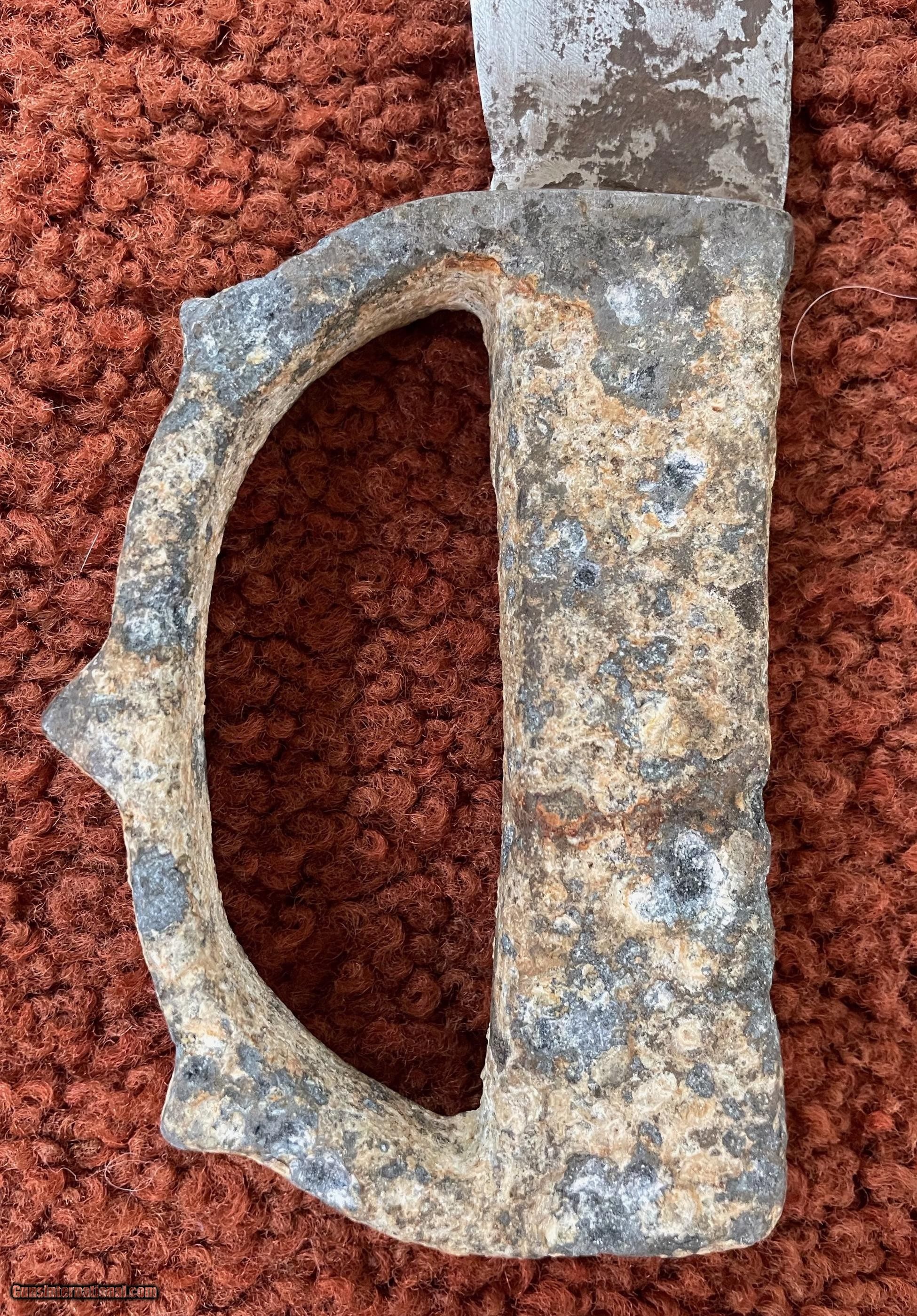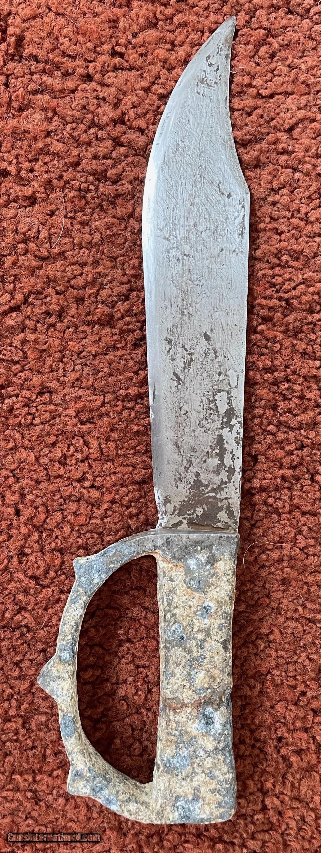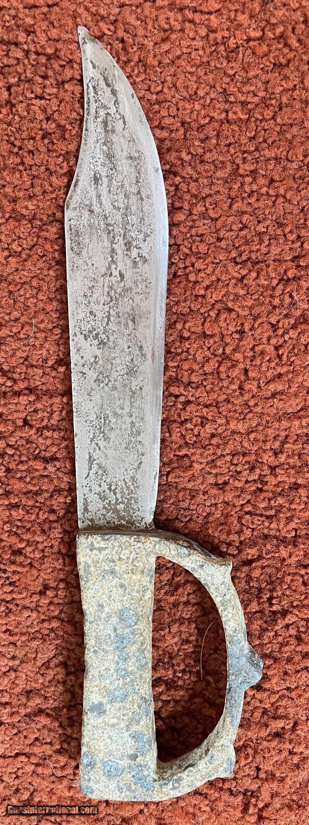 Description: Handle possibly cast by Keech Castings of Sidney and the blade provided by Geg Steel Products Overall length 14.25". Blade 9.25 Aluminun handle is heavily coroded and the blade has been cleaned and there is no sheath present. This exact style knife is pictured and discussed on pages 247 and 248 of the book Knuckle Knives Of The Second World War by Greg Aloisio See photos for condition. We do not ship outside of to U.S. SOLD |
