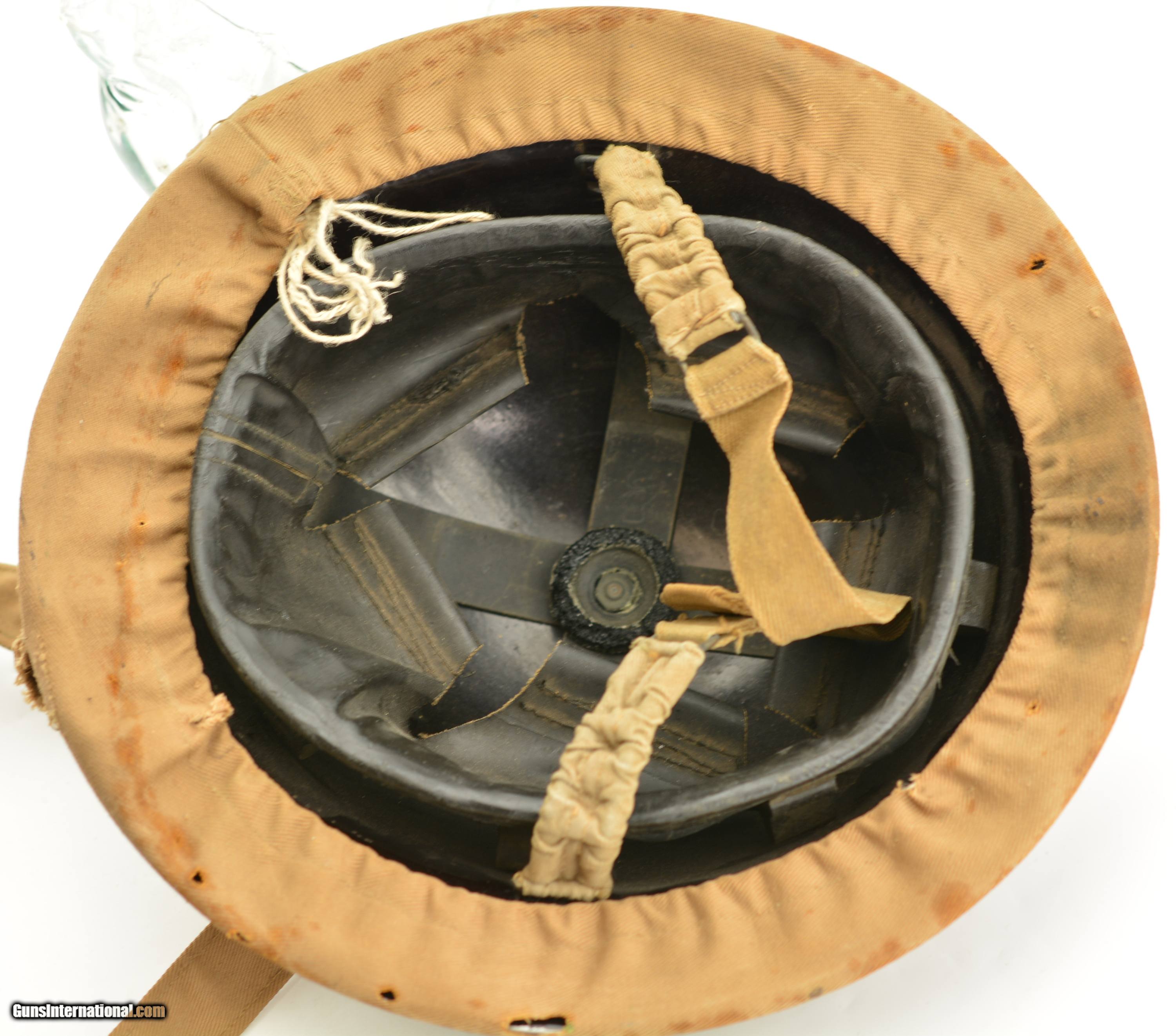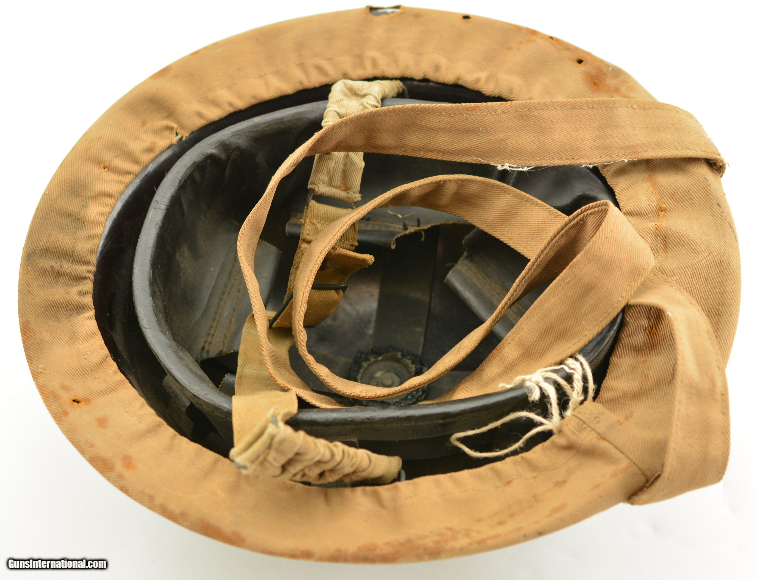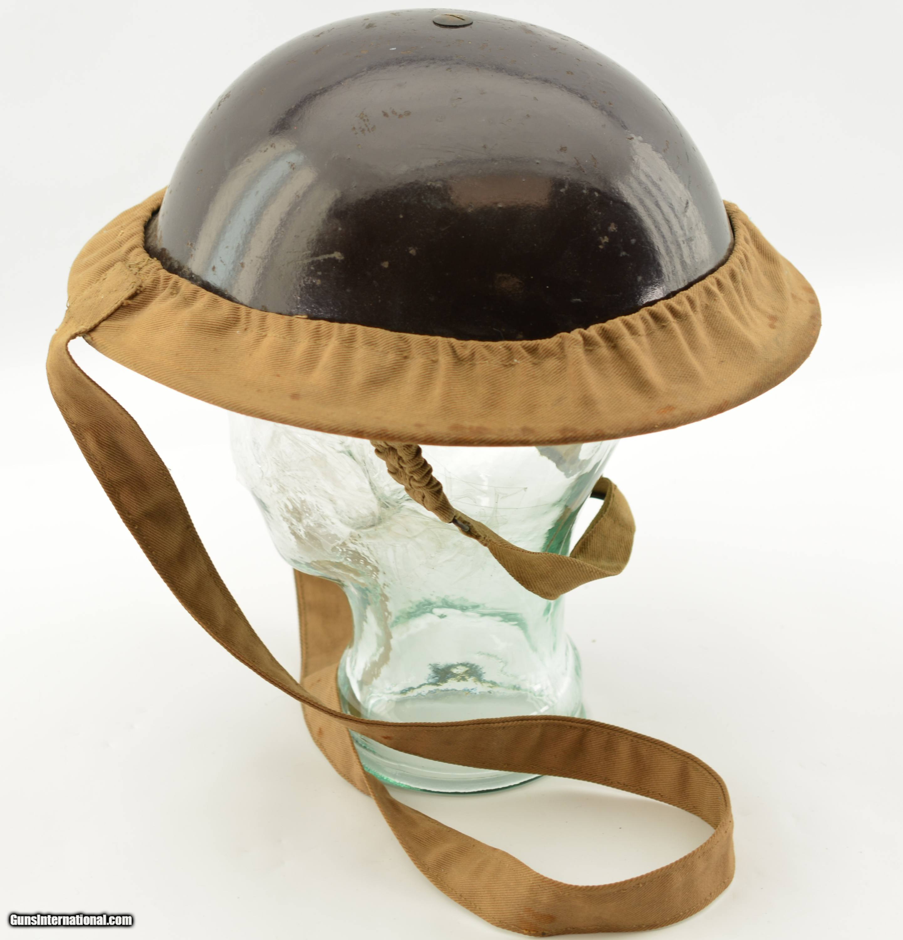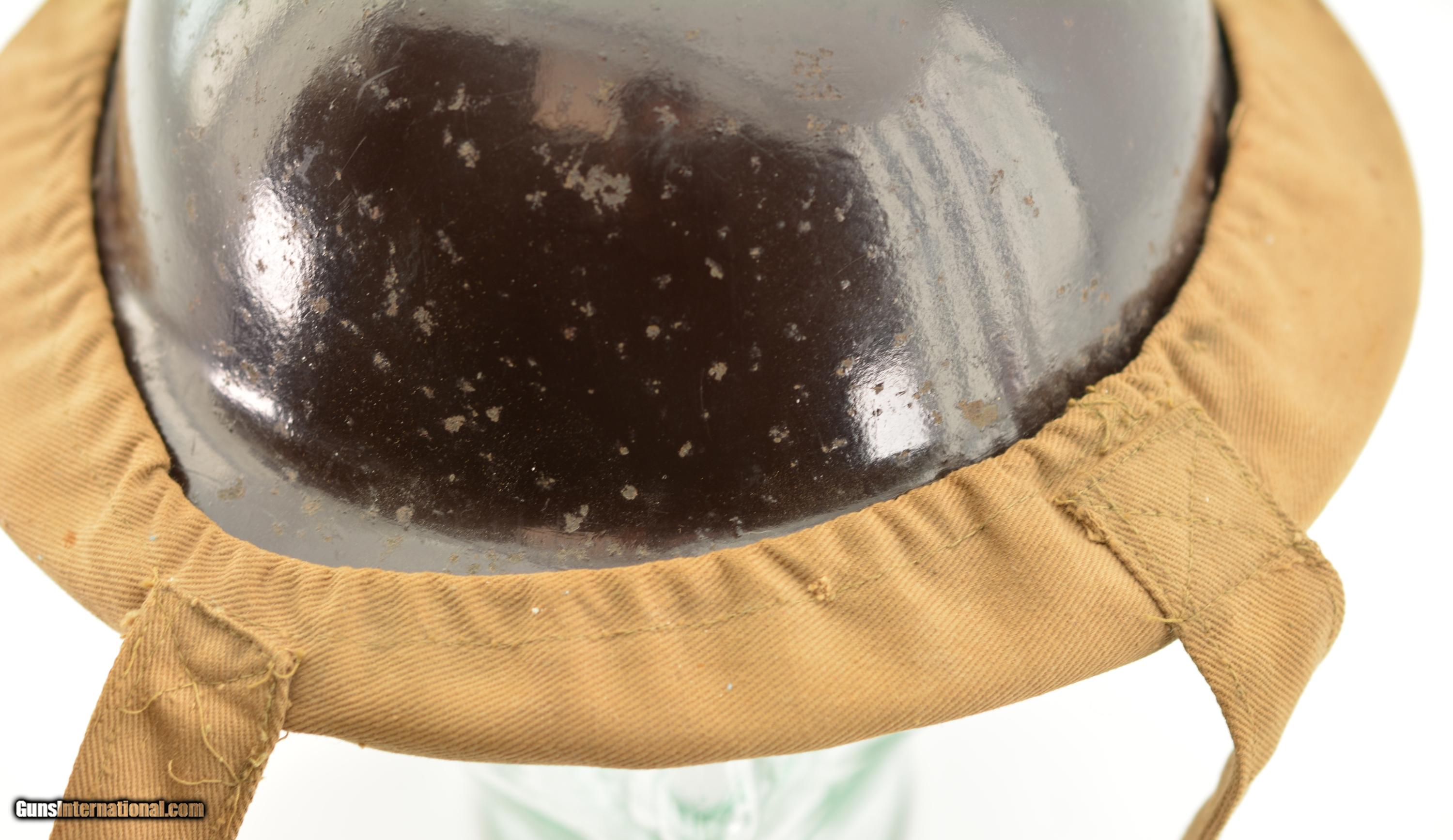 Description: This is a typical WW2 era Brodie helmet that has a dark brown painted finish consistent with those used by the Auxiliary Fire Service during the Blitz. The metal retains 90-92% of the original paint, with minor flaking to the underlying metal throughout. The rubberized cloth suspensionis in excellent condition, and the original elastic chinstrap is still flexible and pliable. The brim of the helmet is held within an extremely rare, original canvas carrier, designed to loop around the wearer’s neck (much like a gas mask carrier). The carrier is in very good-near fine condition, but does have some age discoloration, scattered small insect damage, and one of the neck loop attachments has partially let go. These helmets are fairly uncommon, at least in the US, but the carriers are extremely rare. This example is in very good condition, and would make a great addition to any collection. SOLD Manufacturer: British Model: Helmet |