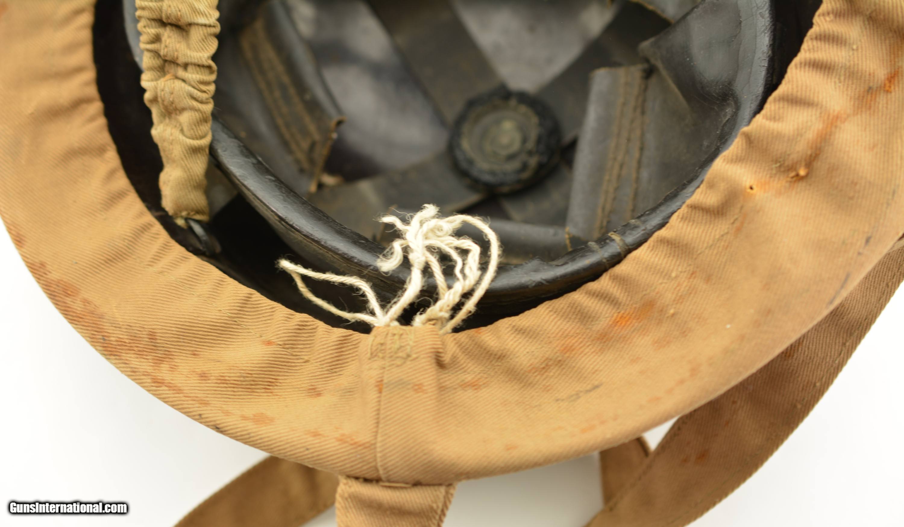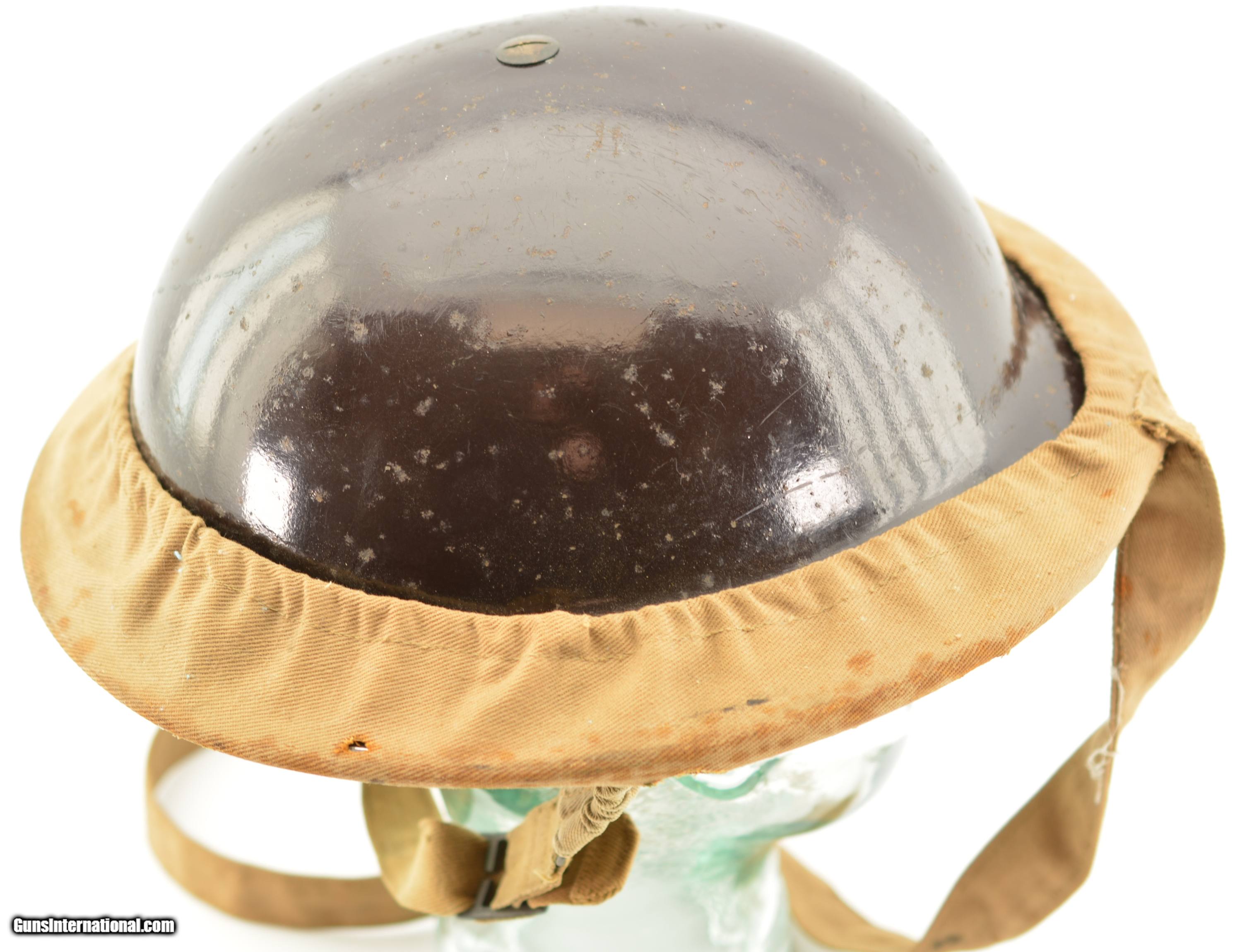 Description: This is a typical WW2 era Brodie helmet that has a dark brown painted finish consistent with those used by the Auxiliary Fire Service during the Blitz. The metal retains 90-92% of the original paint, with minor flaking to the underlying metal throughout. The rubberized cloth suspensionis in excellent condition, and the original elastic chinstrap is still flexible and pliable. The brim of the helmet is held within an extremely rare, original canvas carrier, designed to loop around the wearer’s neck (much like a gas mask carrier). The carrier is in very good-near fine condition, but does have some age discoloration, scattered small insect damage, and one of the neck loop attachments has partially let go. These helmets are fairly uncommon, at least in the US, but the carriers are extremely rare. This example is in very good condition, and would make a great addition to any collection. SOLD Manufacturer: British Model: Helmet |