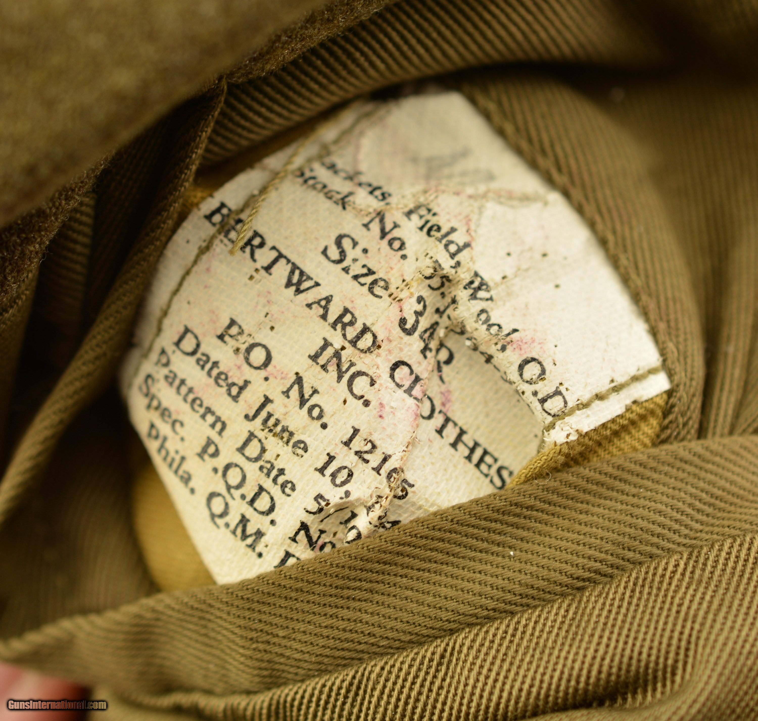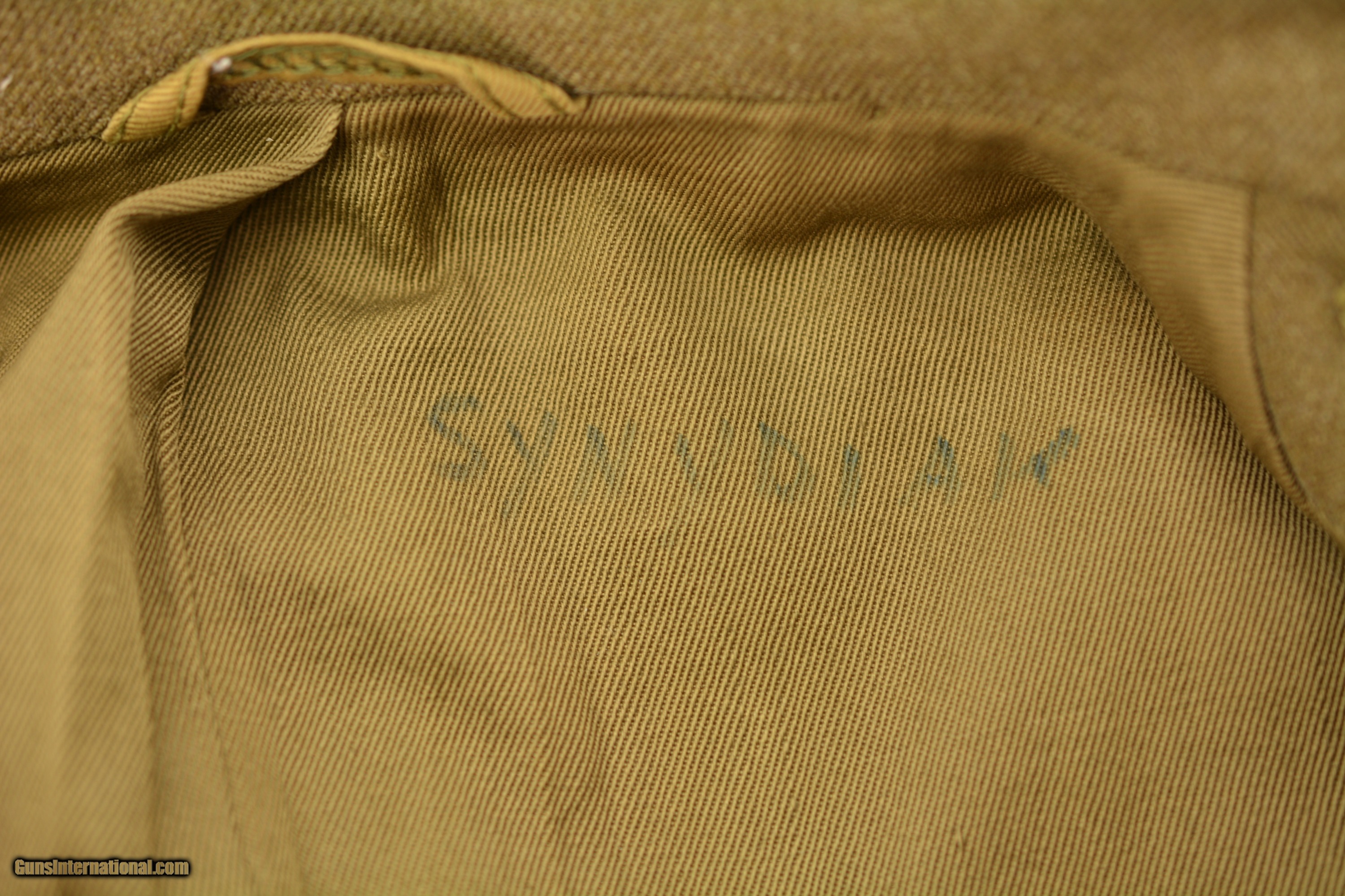 Description: This is an issue jacket (1944-dated Philadelphia Quartermaster Depot label sewn into the right interior breast pocket), size 34R, and made of olive drab gabardine wool, and matching twill lining. The jacket itself is in excellent shape, with practically no visible wear or staining, and there are no rips or areas of moth damage either. What could be the owner’s name is written in ink on the lining below the collar: "SYNYDIAK". The jacket has brass enlisted US insignia on the lapels, the Persian Gulf Command patch on the left shoulder, Amphibious Command patch on the right shoulder, Master Sergeant’s stripes on both sleeves, an Amphibious Engineer patch on the left breast pocket, Meritorious Unit Commendation patch on the right cuff, and five overseas bars with single service stripe on the left cuff. The six ribbon bar over the left breast pocket contains: US Campaign Medal, Certificate of Merit Medal, Asia-Pacific Campaign Medal, European-African-Middle East Campaign Medal (with two stars), WW2 Victory Medal, and Army Good Conduct Medal. This is a fantastic WW2 US Army uniform jacket, with some rarely seen and very desirable patches and insignia. SOLD Manufacturer: US Military Model: Ike Jacket |