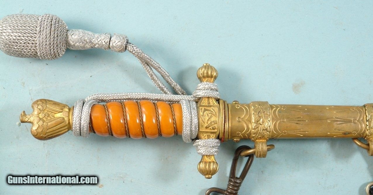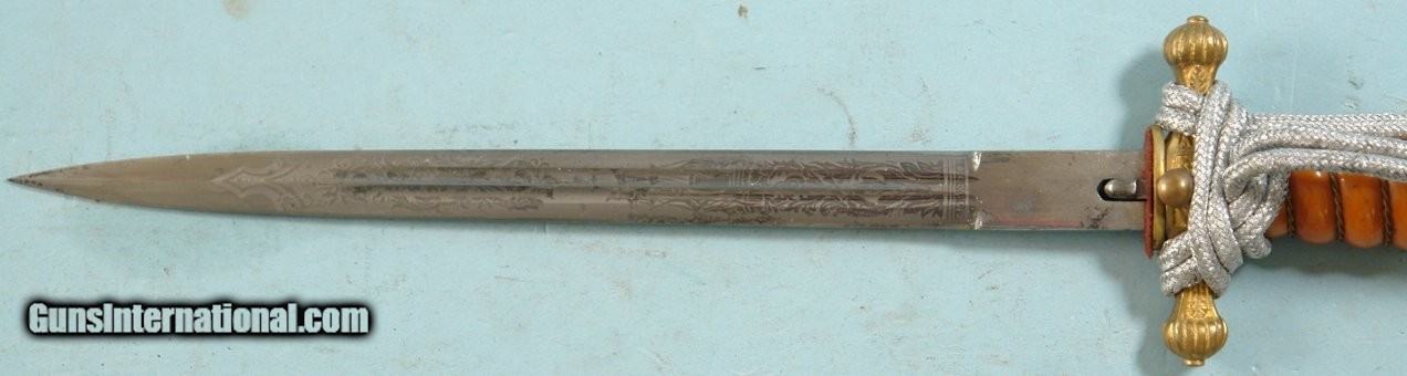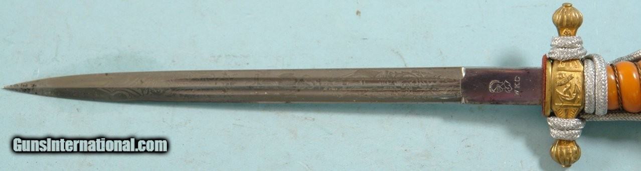Description: WW2 WWII W.K.C. WKC GERMAN NAVY OFFICER’S DAGGER W/SCABBARD, PORTAPEE, HANGERS AND BELT. Exceptional condition and quality overall. Etched blade maker stamped “W.K.C.” with helmet logo. Excellent plus overall. SOLD |