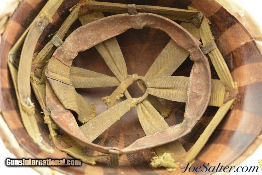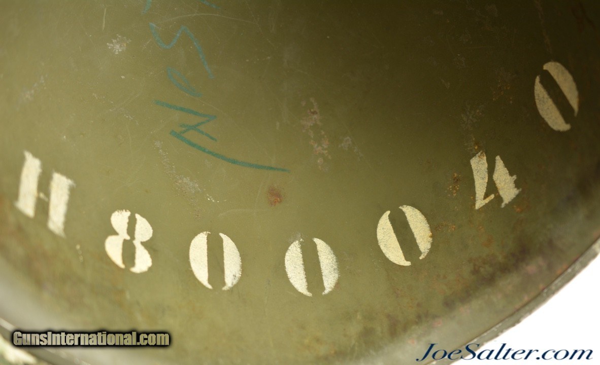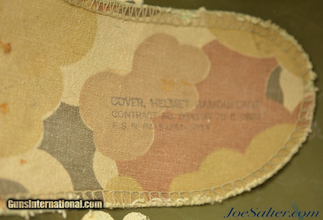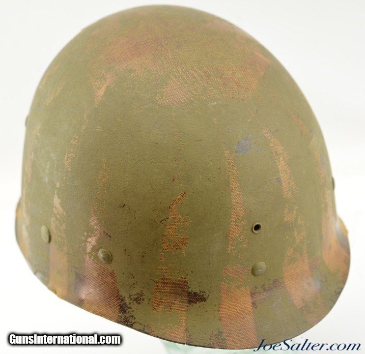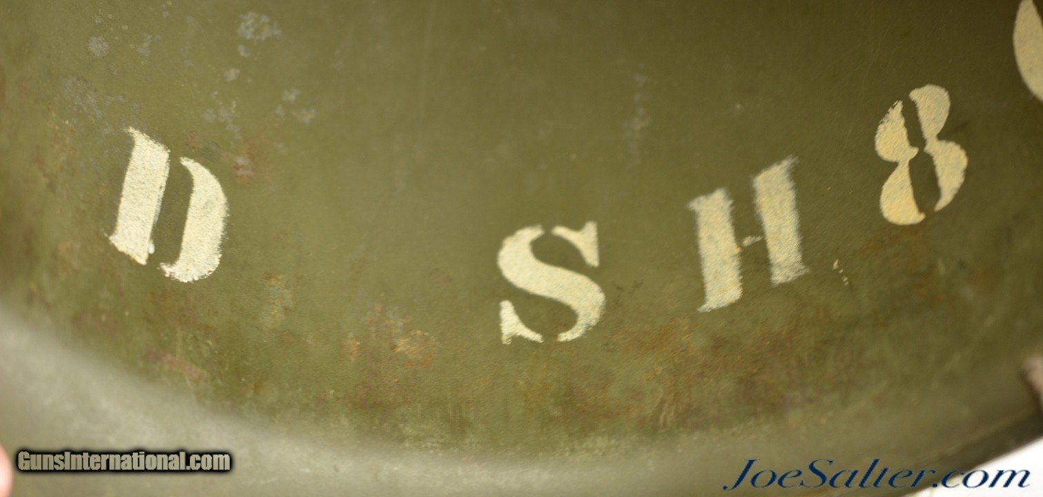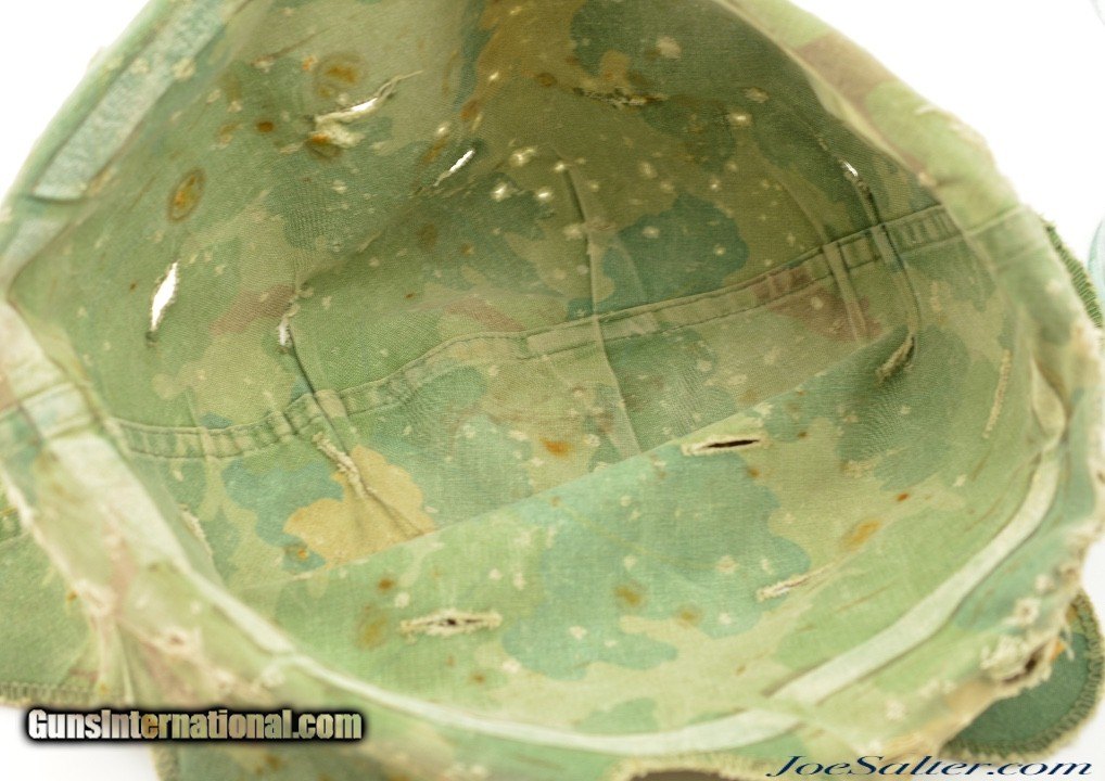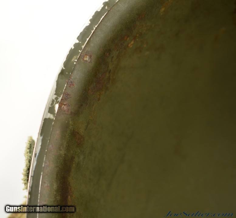 Description: This is a very nice example of an original WWII Front-Seam Fixed Bale M1 Helmet made by McCord Radiator, with a Mine Safety Appliance liner. This helmet is early war 1942-43 made. This is a correct McCord front seam, steel production number 259C with "D SH 800040" painted around the inside with the name Wilson, the crown has quite a dent and one of the bails has broken off, one OD strap with brass hardware correct chin strap with a light presence of oxidation on the surface interior. This MSA liner was Manufactured in Pittsburgh, Pennsylvania this "high pressure" M-1 helmet liner is identified by an embossed "MSA" in the crown. Mine Safety Appliance started M-1 helmet liner delivery to the US Army in September 1942. They produced approximately between 2 - 4 million M-1 helmet liners and discontinued production around August 17, 1945 when the war ended. This liner has a near complete suspension system in good condition with some oxidation on the metal parts and dried leather and one part of the band ripped. The outside of the helmet is covered with a two tone camouflage wrap "DSA No. 10070 C 0822" contract date of 1970. This helmet may have had a very long service life if the helmet cover was issued to this helmet. Price: $285.00 Contact Seller |