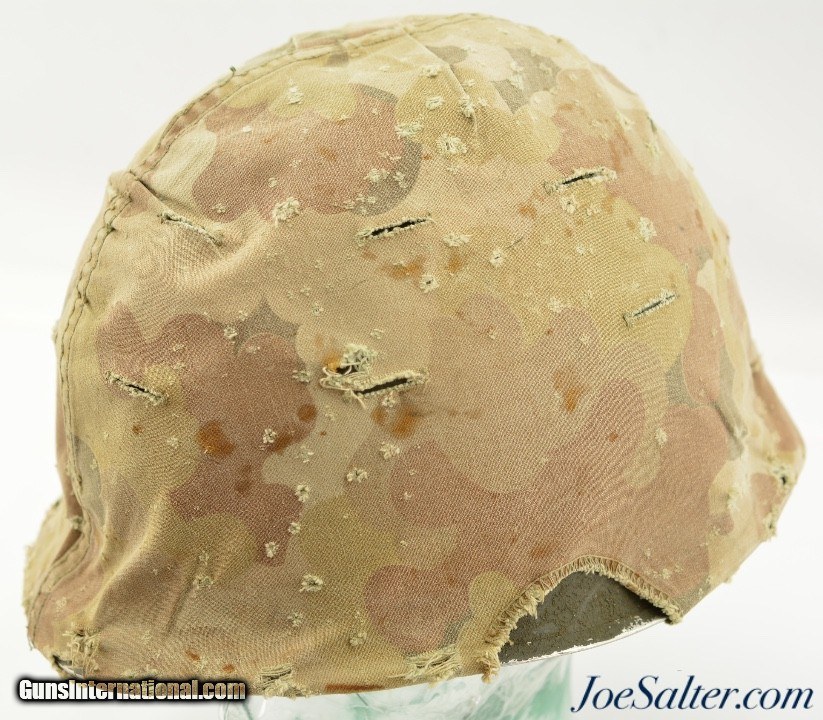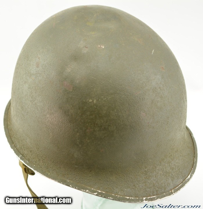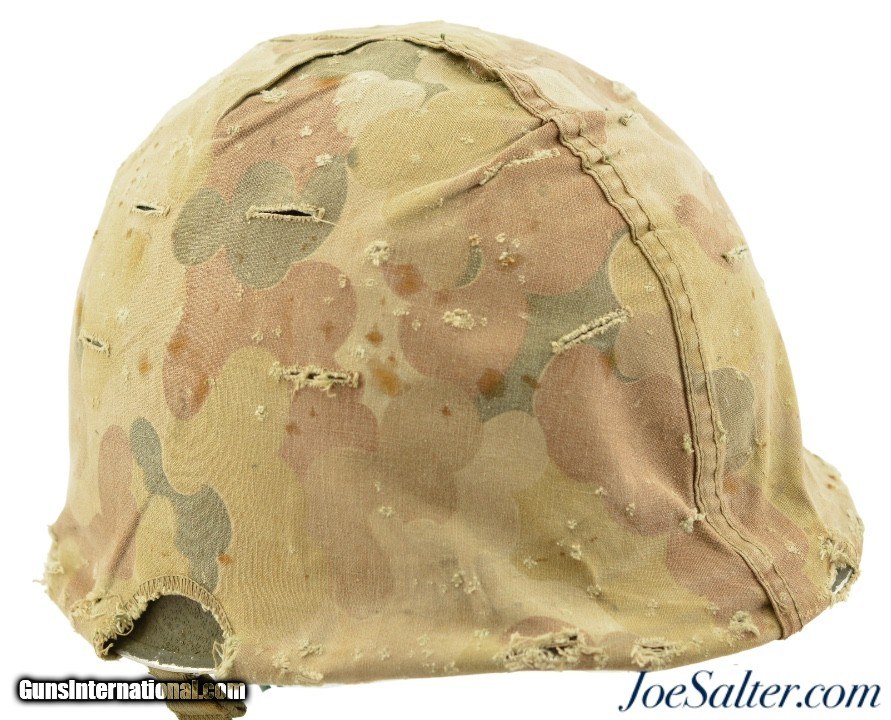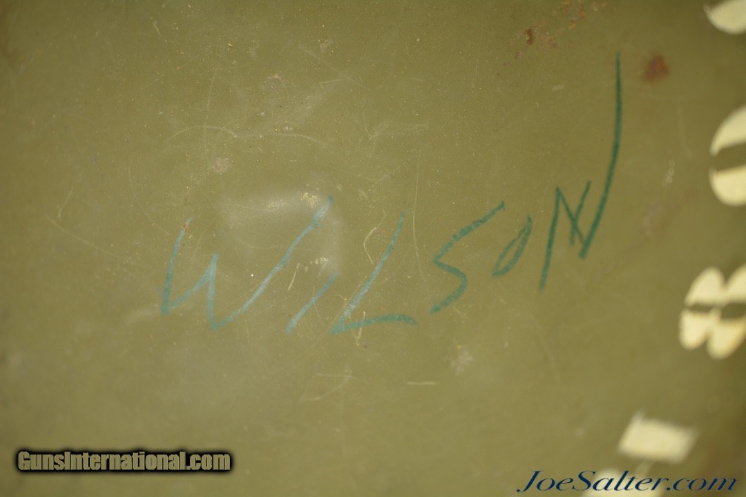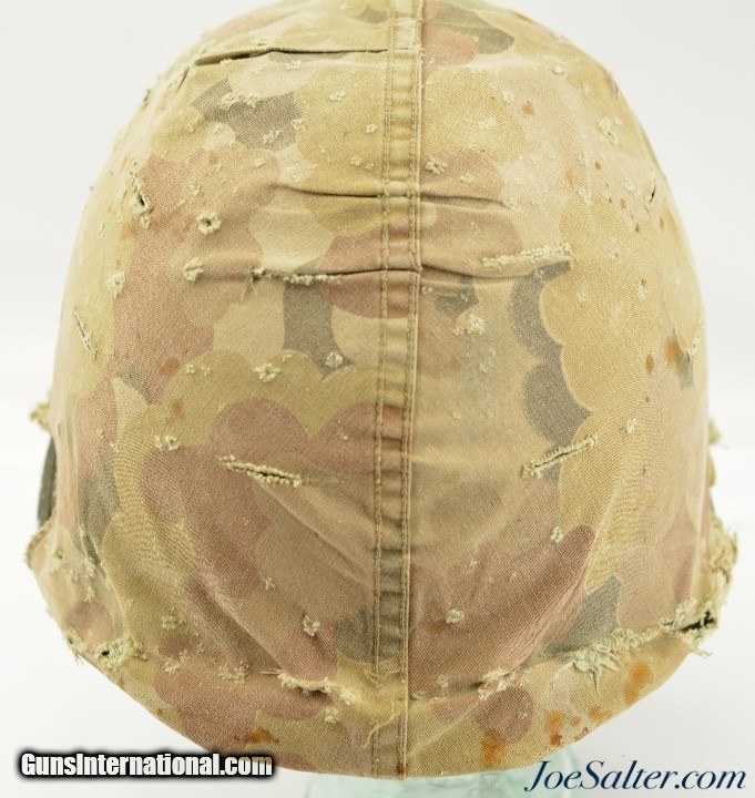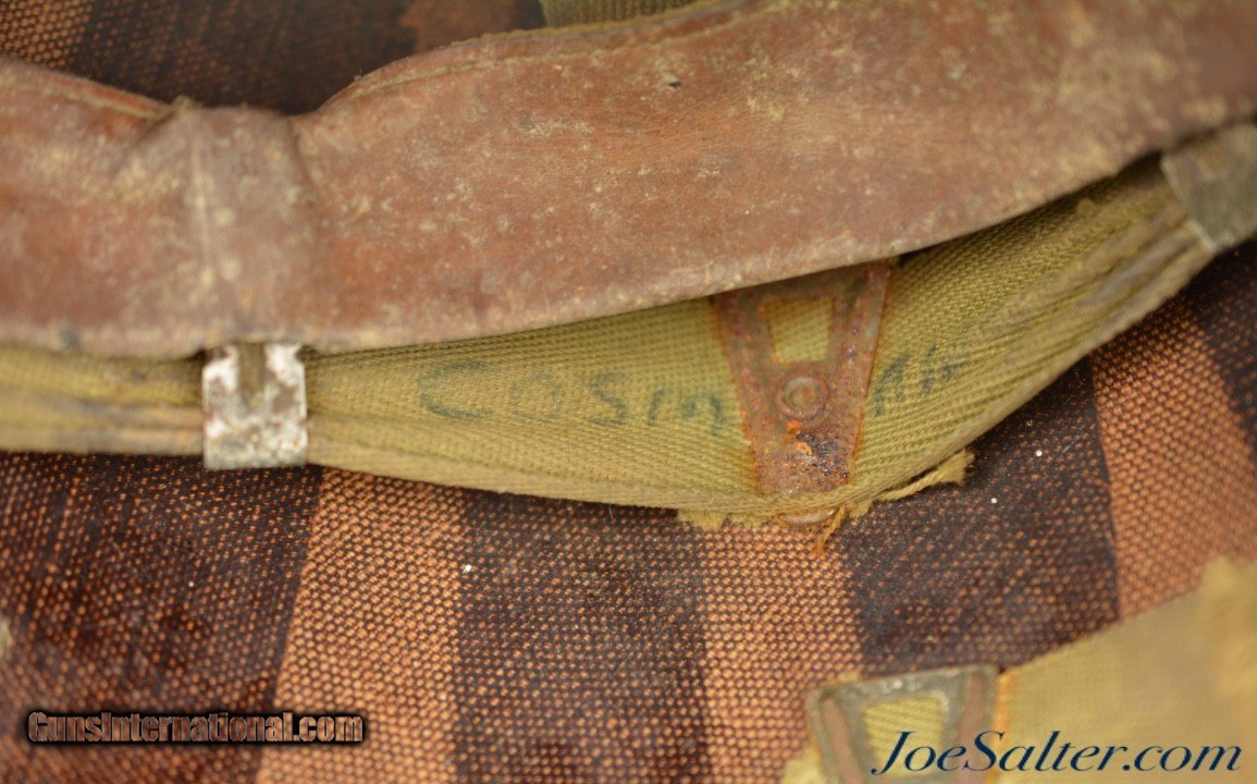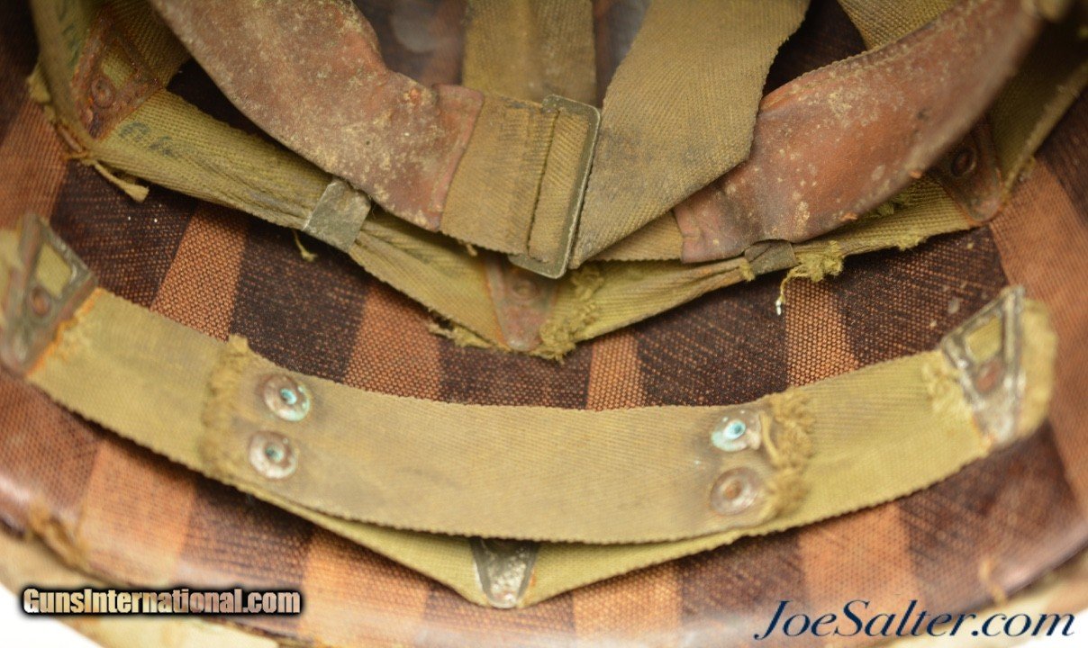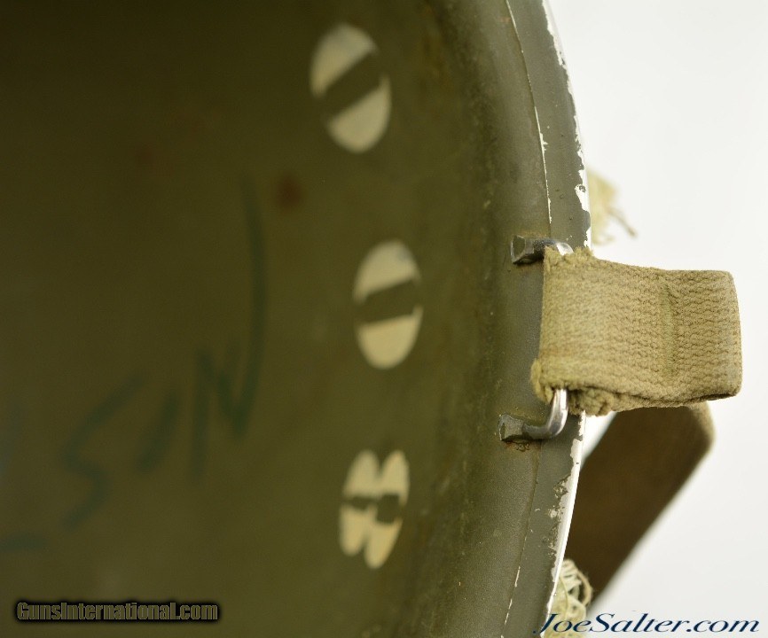 Description: This is a very nice example of an original WWII Front-Seam Fixed Bale M1 Helmet made by McCord Radiator, with a Mine Safety Appliance liner. This helmet is early war 1942-43 made. This is a correct McCord front seam, steel production number 259C with "D SH 800040" painted around the inside with the name Wilson, the crown has quite a dent and one of the bails has broken off, one OD strap with brass hardware correct chin strap with a light presence of oxidation on the surface interior. This MSA liner was Manufactured in Pittsburgh, Pennsylvania this "high pressure" M-1 helmet liner is identified by an embossed "MSA" in the crown. Mine Safety Appliance started M-1 helmet liner delivery to the US Army in September 1942. They produced approximately between 2 - 4 million M-1 helmet liners and discontinued production around August 17, 1945 when the war ended. This liner has a near complete suspension system in good condition with some oxidation on the metal parts and dried leather and one part of the band ripped. The outside of the helmet is covered with a two tone camouflage wrap "DSA No. 10070 C 0822" contract date of 1970. This helmet may have had a very long service life if the helmet cover was issued to this helmet. Price: $285.00 Contact Seller |
