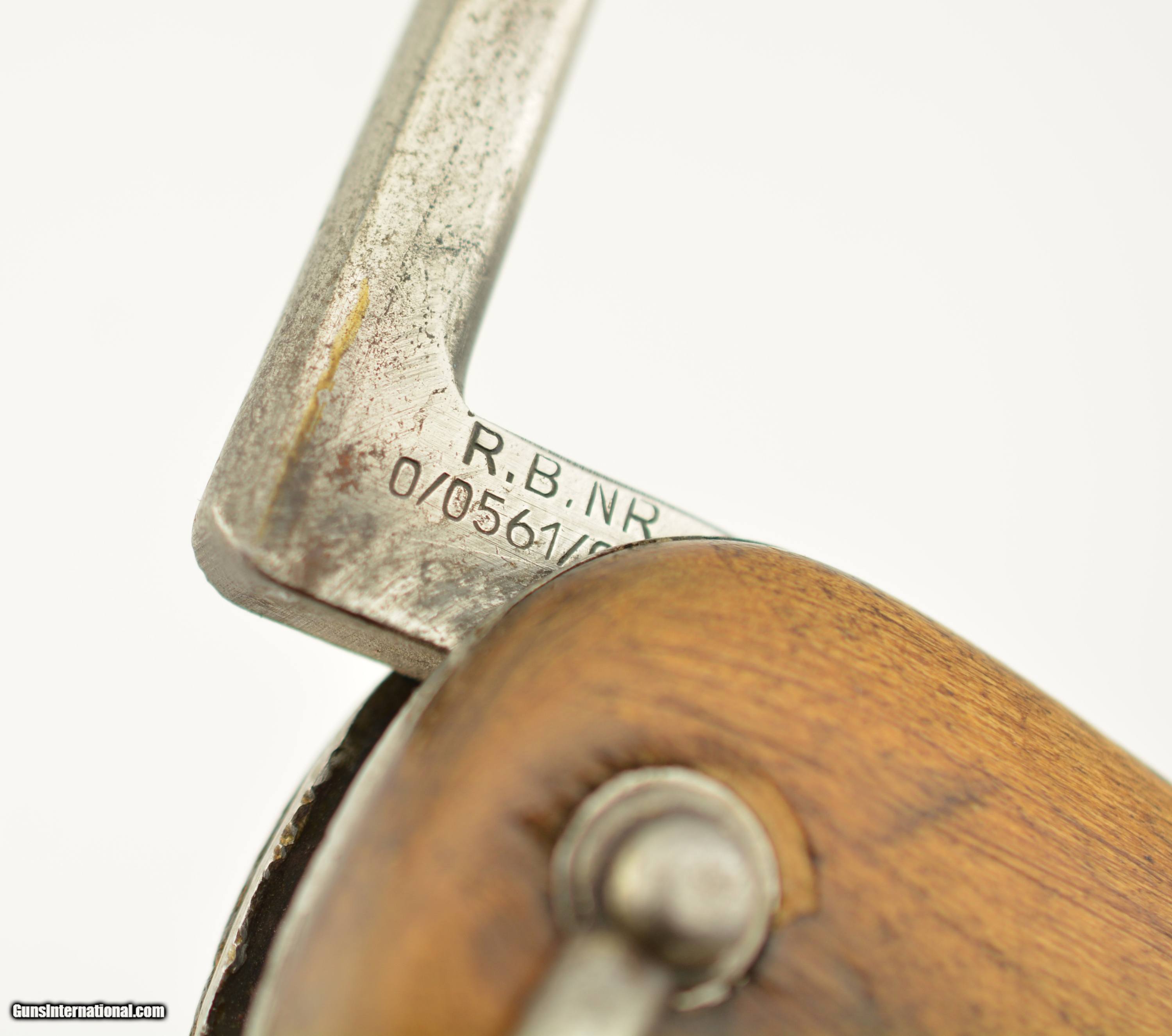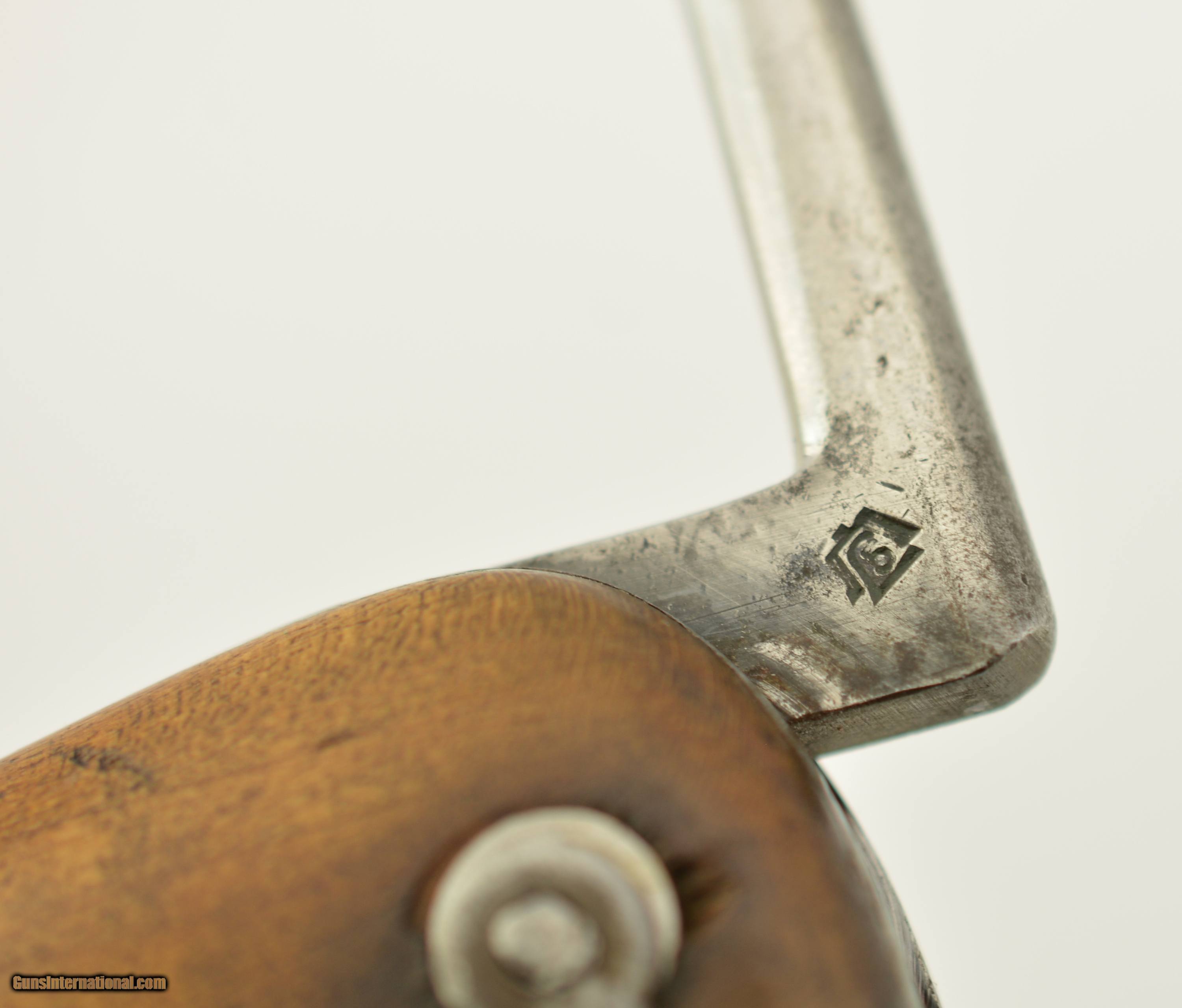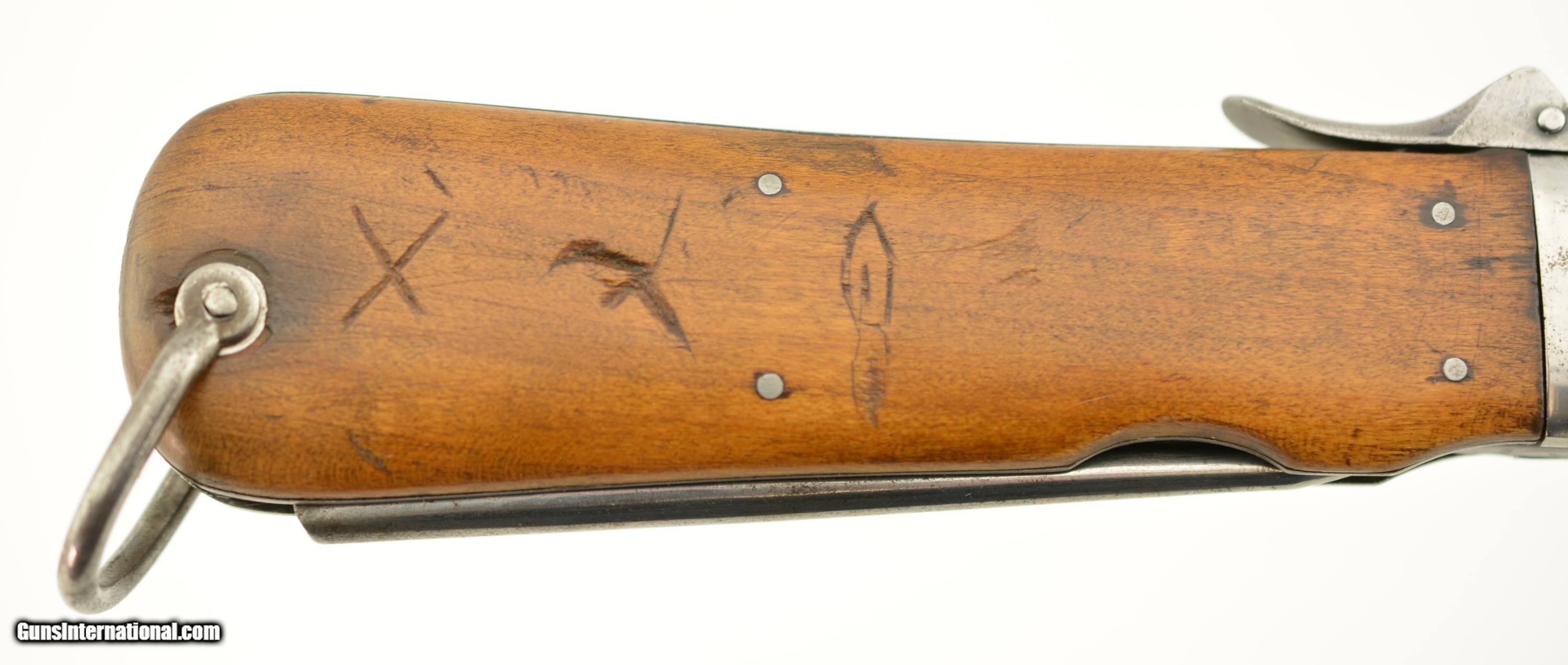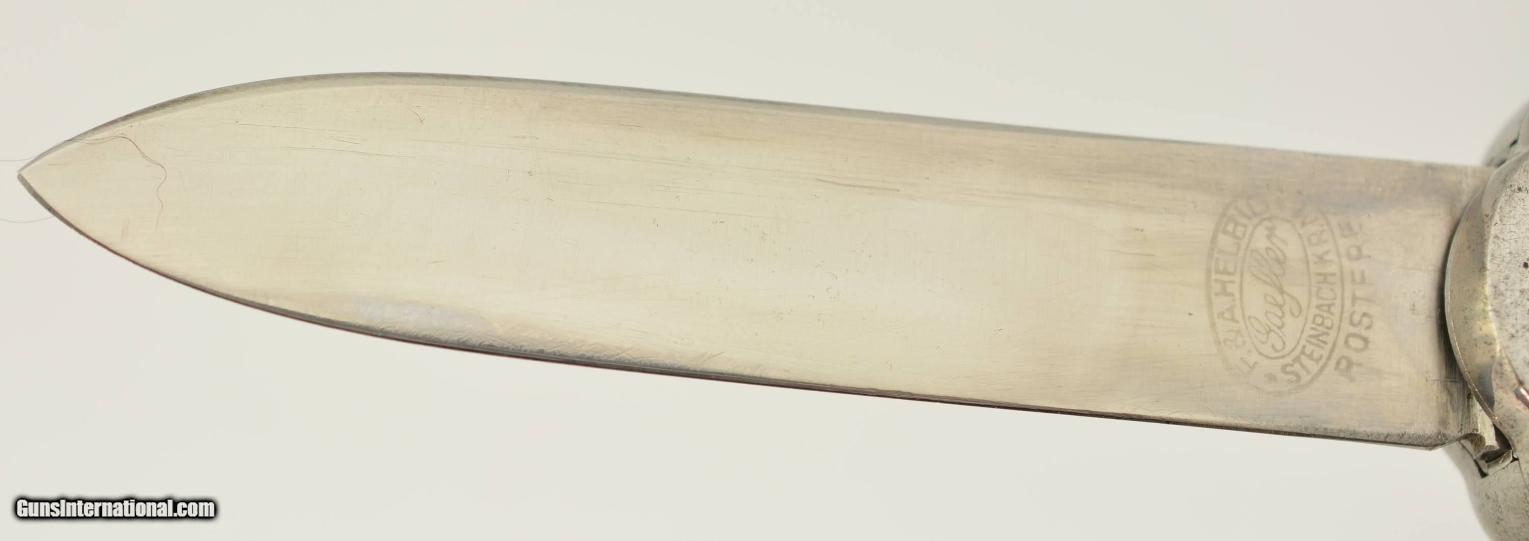 Description: This is a Type II LW gravity Flieger-Kappmesser/Paratrooper Knife comprised of the blade, a fine stainless steel "ROSTFREI" 4 1/8 inch cutting blade SN# 6875 which was manufactured from 1938 to 1940 by the knife maker F&A Helbig Garfler Steinbach Kr.M which only produced Type I knives. According to Bruning’s book only 2100 of these Helbig knives where made. The body of this knife was manufactured by SMF, Metall Warenfabrik and is a Type IIA. This example is in vey good to excellent original condition with very good makers marks with matching frame #286 and bolster and correct R.B NR 0561/0019 and #5 inspection mark, Solingen. This knives wooden scales are in very good condition with normal wear and some old etchings. The spike is excellent and has the original point. According to Pattarpzzi’s book, it is not uncommon to find parts from one maker on another makers knife. As we have on this knife the blade, which is original, is used on another original body. No way to tell when this was done, war time or later. SOLD Manufacturer: German Model: Knife |