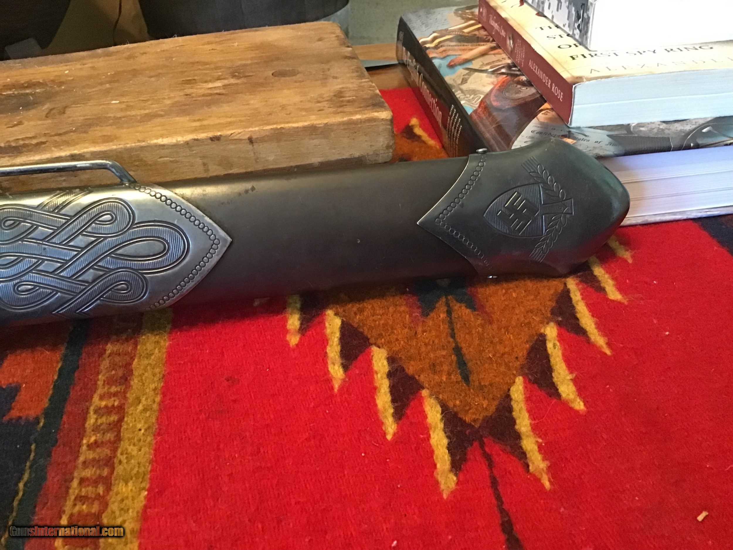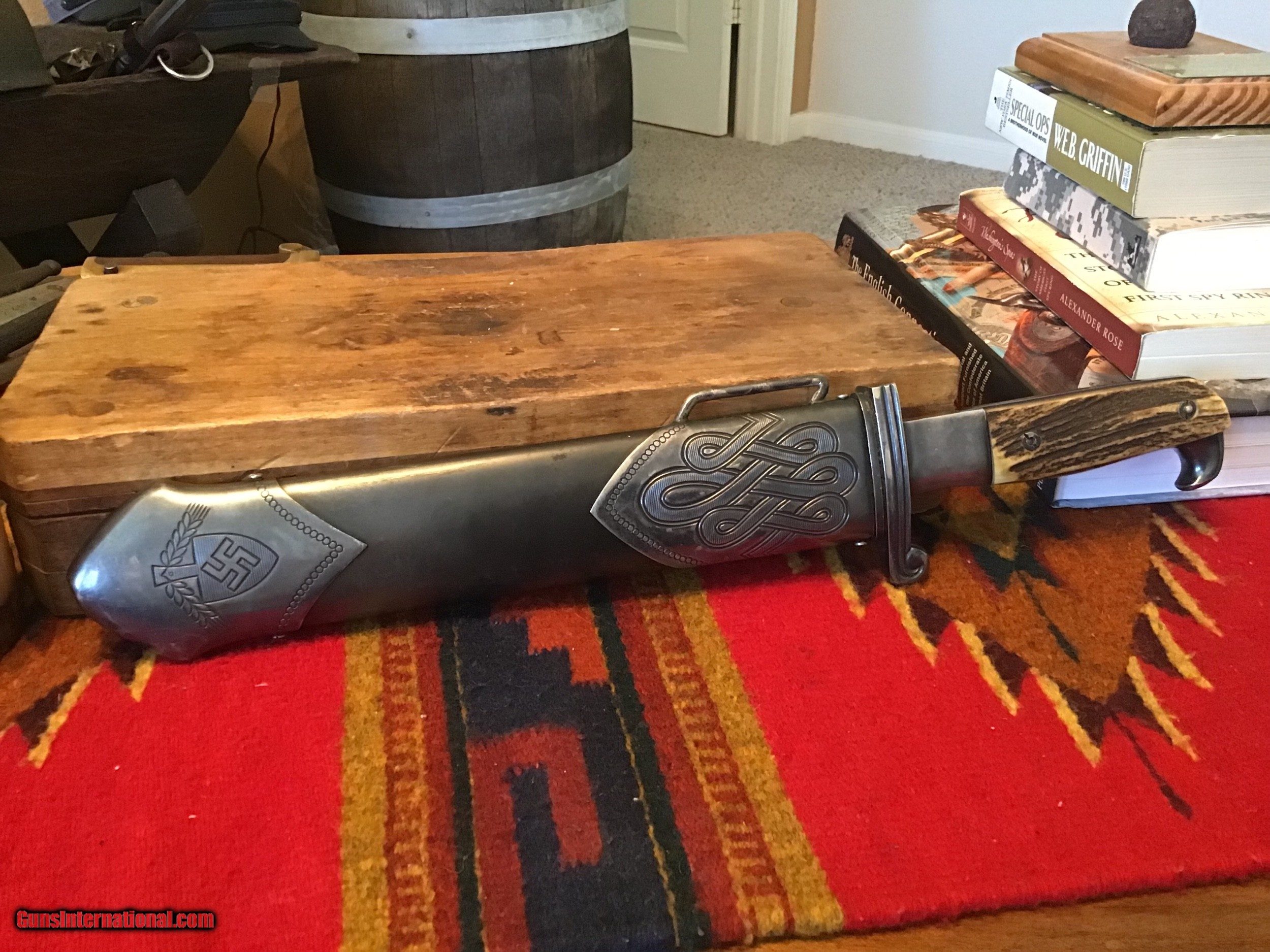 Description: Very good condition and guaranteed original WWII Nazi German RAD (Reichsarbeitdienst-Nazi Labor Corps) hewer that has the early Carl Eickhorn manufacturer trademark on the left side of the blade. Blade has nice original bright finish and light sharpening marks. Edge has a few small nicks. Right side has nice clear engraved “Arbeit Adelt” (Work Enables) motto. Hilt has original silver finish with attractive patina. Stag grips have a good tight fit and no damage. Fitted in correct original steel scabbard. Body has original black anodized finish showing some wear to attractive plum brown patina. Throat and tip have original silver finish with attractive patina. A really nice original RAD hewer that will make an excellent addition to a collection. Persona Note: Just received a phone call unknown number from someone cussing me out for selling German WW2 items. I collect WW1, WW2, and Civil War. All sides. I do not condone atrocities by anyone but do appreciate the historical value of relics. SOLD |