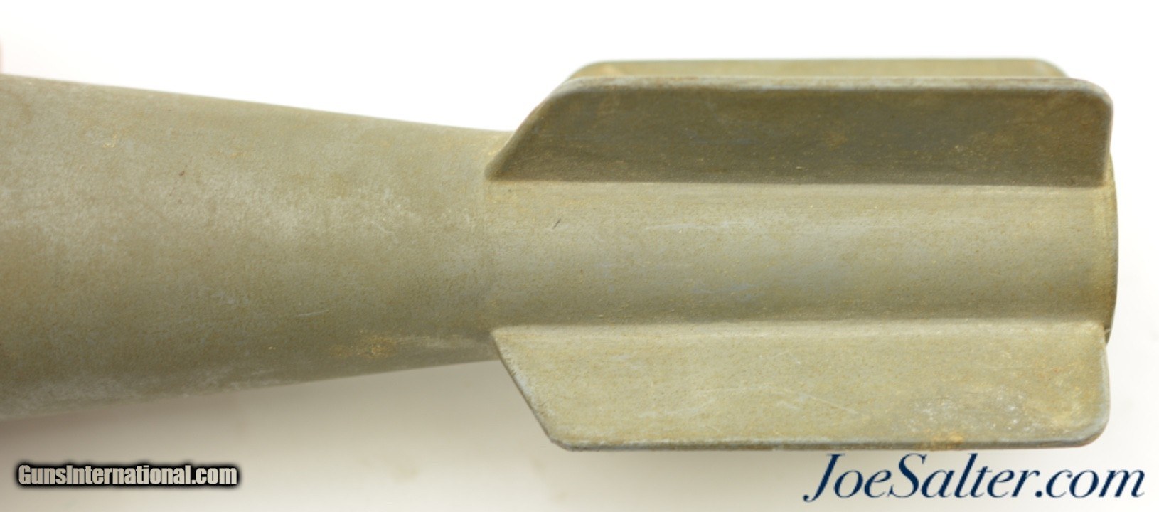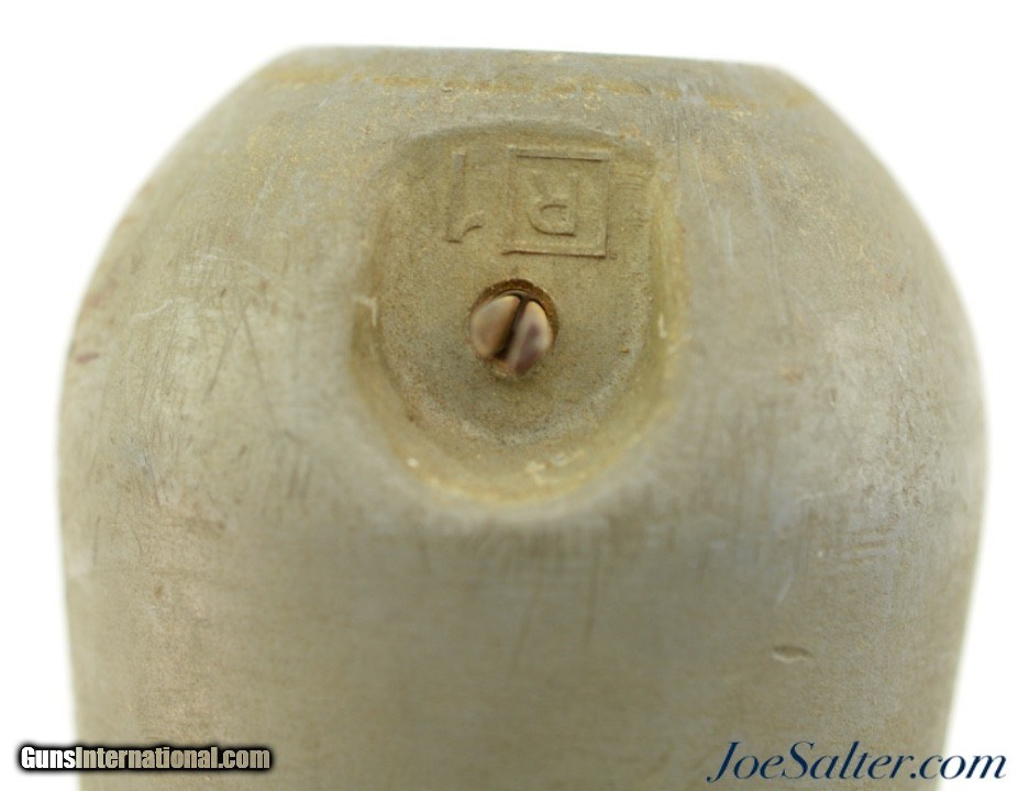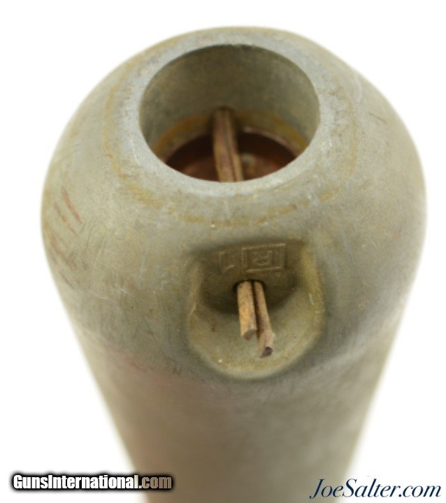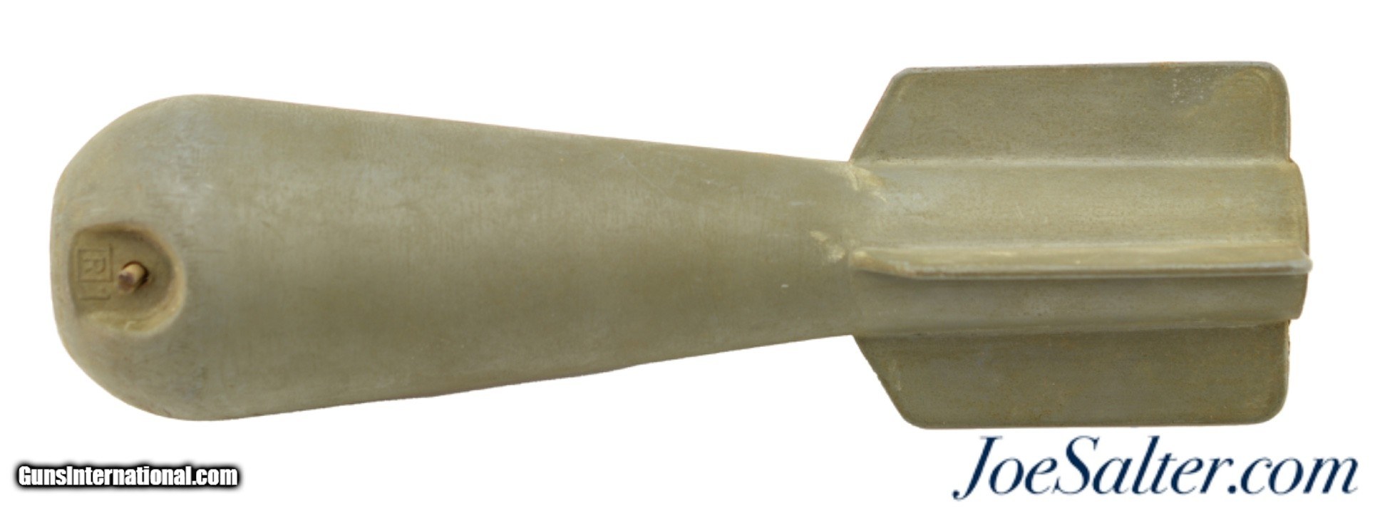 Description: This is a AN MK-5 practice bomb, which was one of three similar miniature practice bombs used for low-altitude horizontal or dive bombing practice during WWII. Most examples of these practice bombs I have seen are the MK-23 cast iron version. The MK-5 is the much less common version which was the most expensive to produce using war time scares zinc-alloy. This MK-5 has an overall length of 8.25" and is made of zinc-alloy. The diameter at its largest point is 2.18". The fins are 2.5" in length. The weight, without the signal, but with the firing pin is approximately 2 lbs-9 oz. and when armed is approximately 2 lbs-11 oz. Inside this practice bomb was a AN MK-4 spotting charge, which consisted of an extra long 10-gauge blank shotgun shell that was inserted into the hollow chamber of the bomb. As was common, this bomb does not have any marking except for a R1 near the top. This example uses the two steel cup construction firing pin assembly, which is removable, which with inertia fired the MK-4 spotting charge on impact. This MK-5 is in excellent condition with scuffs and marks from storage with the firing pin assembly showing light surface corrosion and the cotter pin in very good condition. Price: $95.00 Contact Seller |