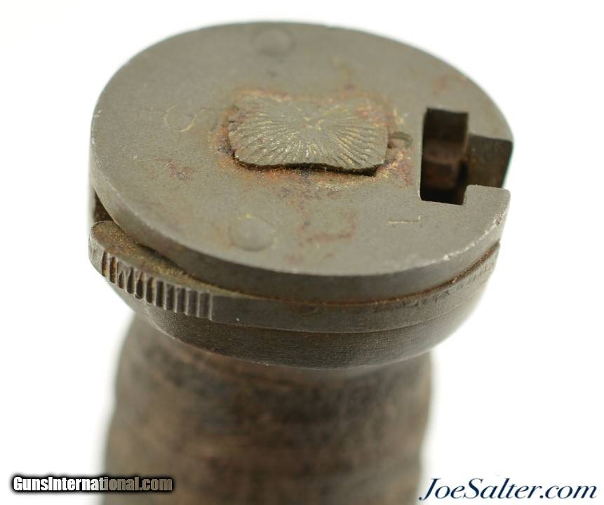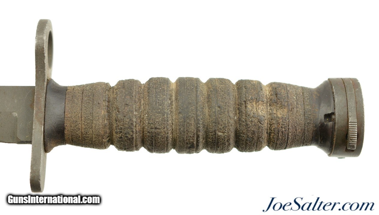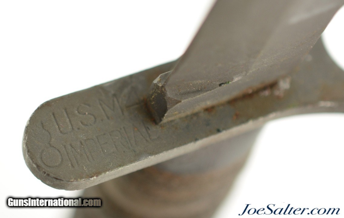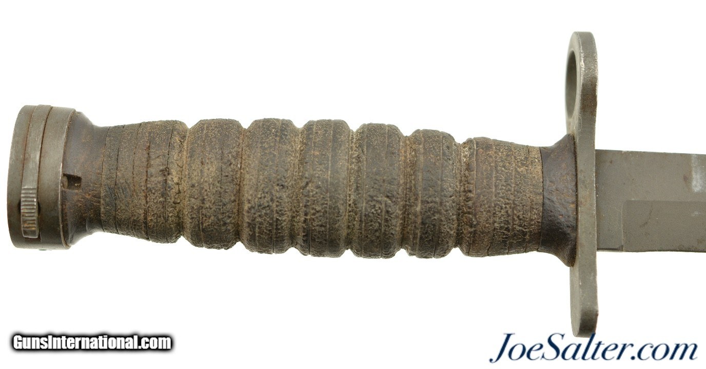 Description: Originally designed for the M1 Carbine, the M4 bayonet was issued from 1944 onward. Manufactured by Imperial Knife Co., paired with an original, 1969-70, TWB M8A1 scabbard, complete with black painted canvas hanger and reinforced steel toe. The bayonet features a parkerized 6 5/8" blade, untouched and factory edged, with the USM4, flaming bomb and Imperial Co. maker’s mark stamped on the cross guard. The pommel is marked "SP" (Standard Products Co.) and lot number "120", indicating it was heat-treated by Standard Products. The leather grip and plastic spacers are in well used, very good condition, with tightly stacked washers. The M8A1 scabbard, made by The TWB (The Working Blind) Home, manufacturer’s mark, retains its original finish, with the US markings crisp and legible, and thebelt loop and strap button still functional. It is interesting that this bayonet could have served in three wars.; Price: $269.00 Contact Seller |