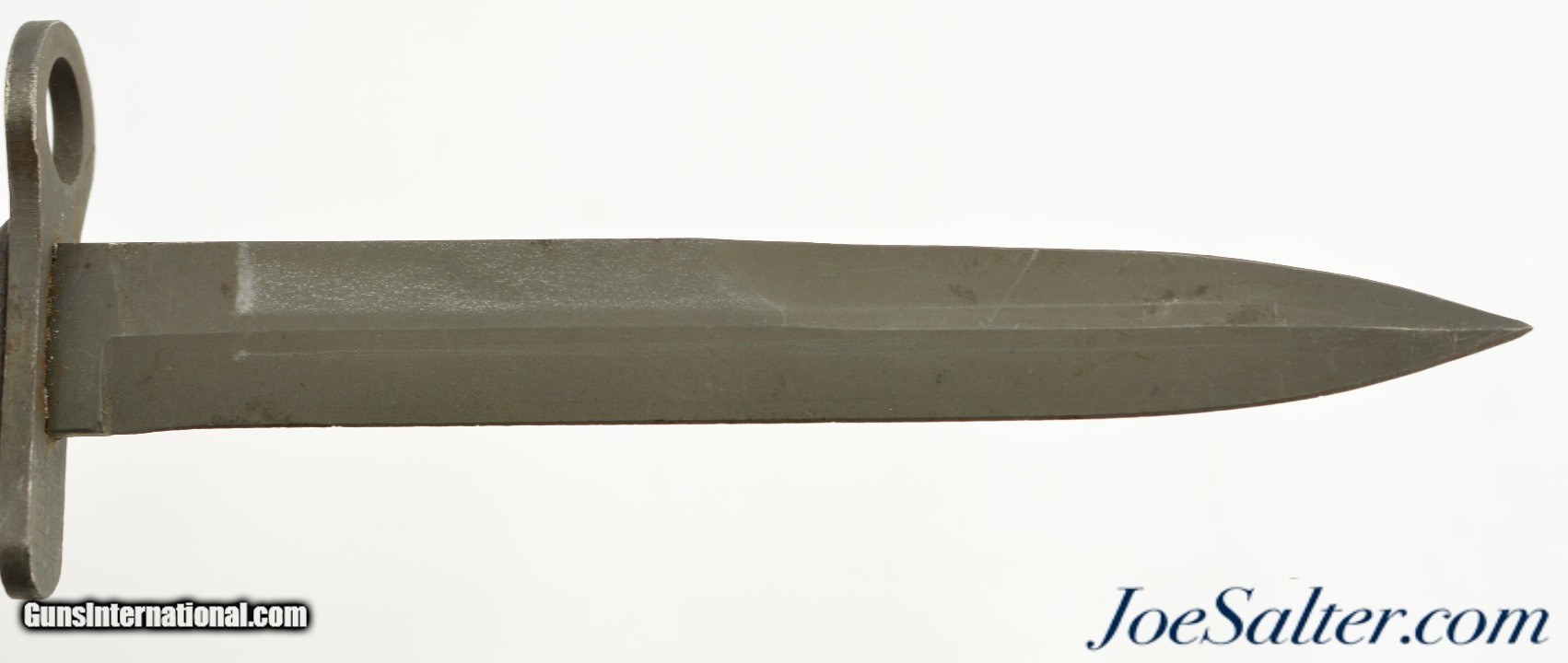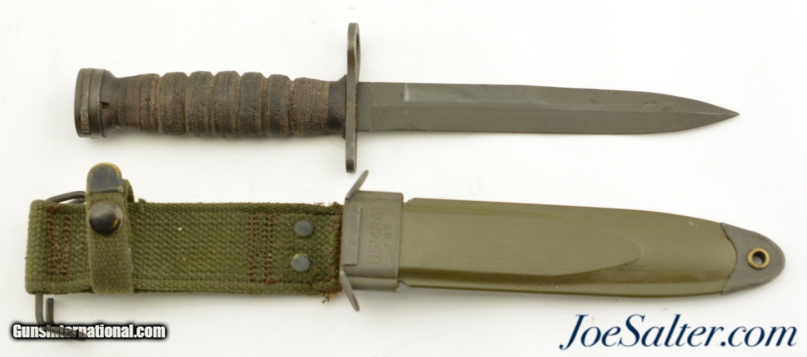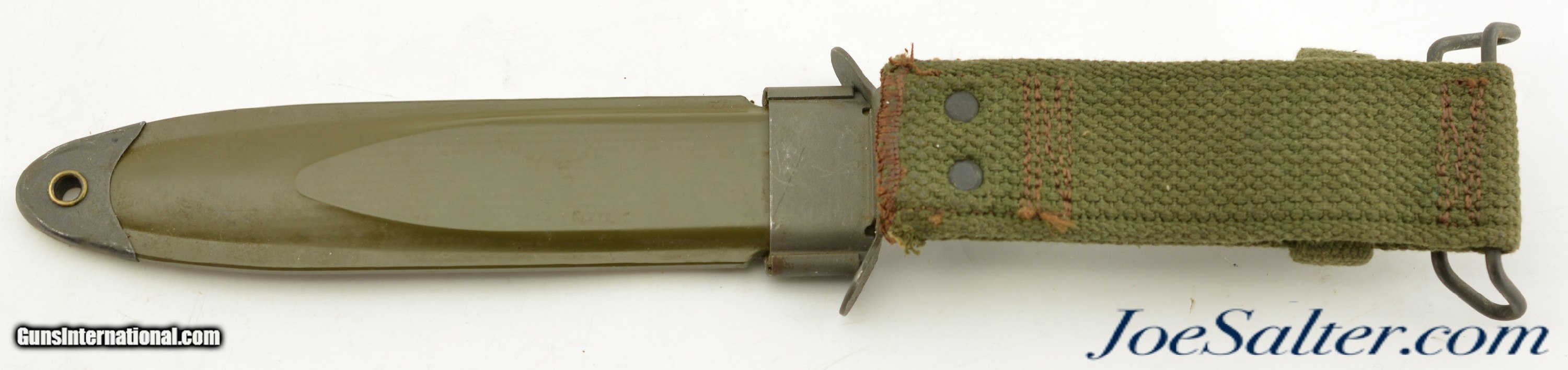 Description: Originally designed for the M1 Carbine, the M4 bayonet was issued from 1944 onward. Manufactured by Imperial Knife Co., paired with an original, 1969-70, TWB M8A1 scabbard, complete with black painted canvas hanger and reinforced steel toe. The bayonet features a parkerized 6 5/8" blade, untouched and factory edged, with the USM4, flaming bomb and Imperial Co. maker’s mark stamped on the cross guard. The pommel is marked "SP" (Standard Products Co.) and lot number "120", indicating it was heat-treated by Standard Products. The leather grip and plastic spacers are in well used, very good condition, with tightly stacked washers. The M8A1 scabbard, made by The TWB (The Working Blind) Home, manufacturer’s mark, retains its original finish, with the US markings crisp and legible, and thebelt loop and strap button still functional. It is interesting that this bayonet could have served in three wars.; Price: $269.00 Contact Seller |