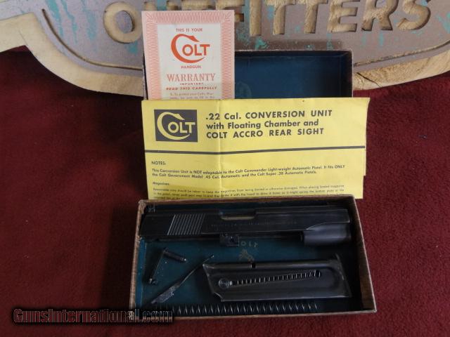 Description: Colt Series 70 22 LR Conversion unit. This kit is complete along with original warranty and factory owners manual. The papers are in very good to excellent condition. This comes in the original box which also is in very good condition. The 22 cal barrel is in excellent condition. All blued finishes have approximately 97% original finish. Unique addition to any Colt 1911 Collection in above average condition. Probable late 1950's era. SOLD |