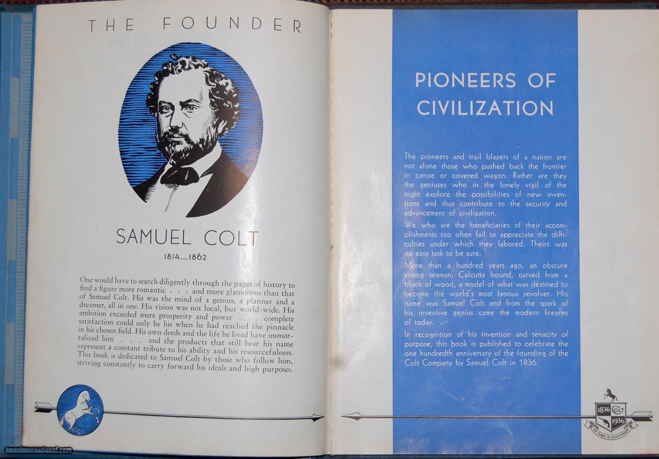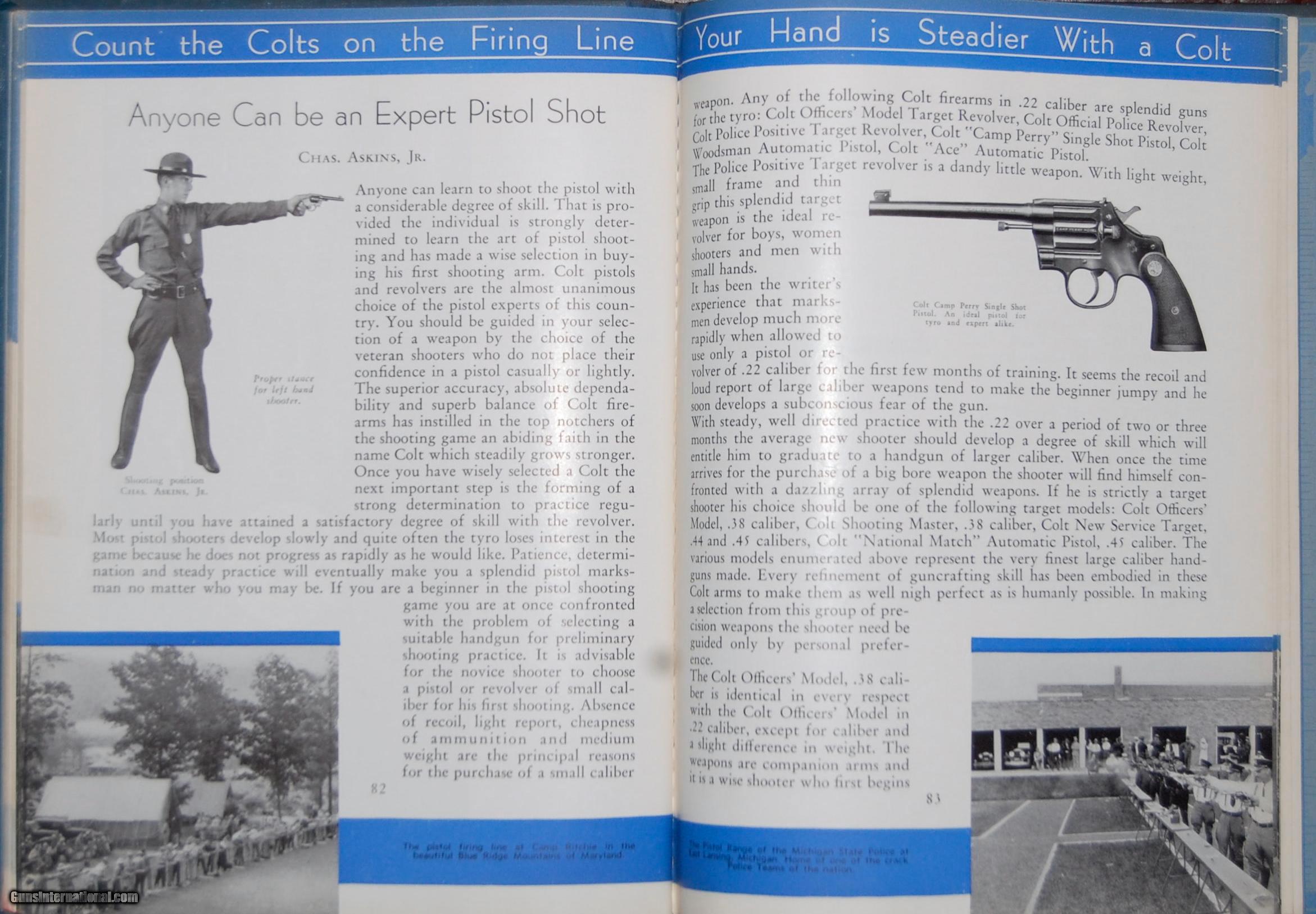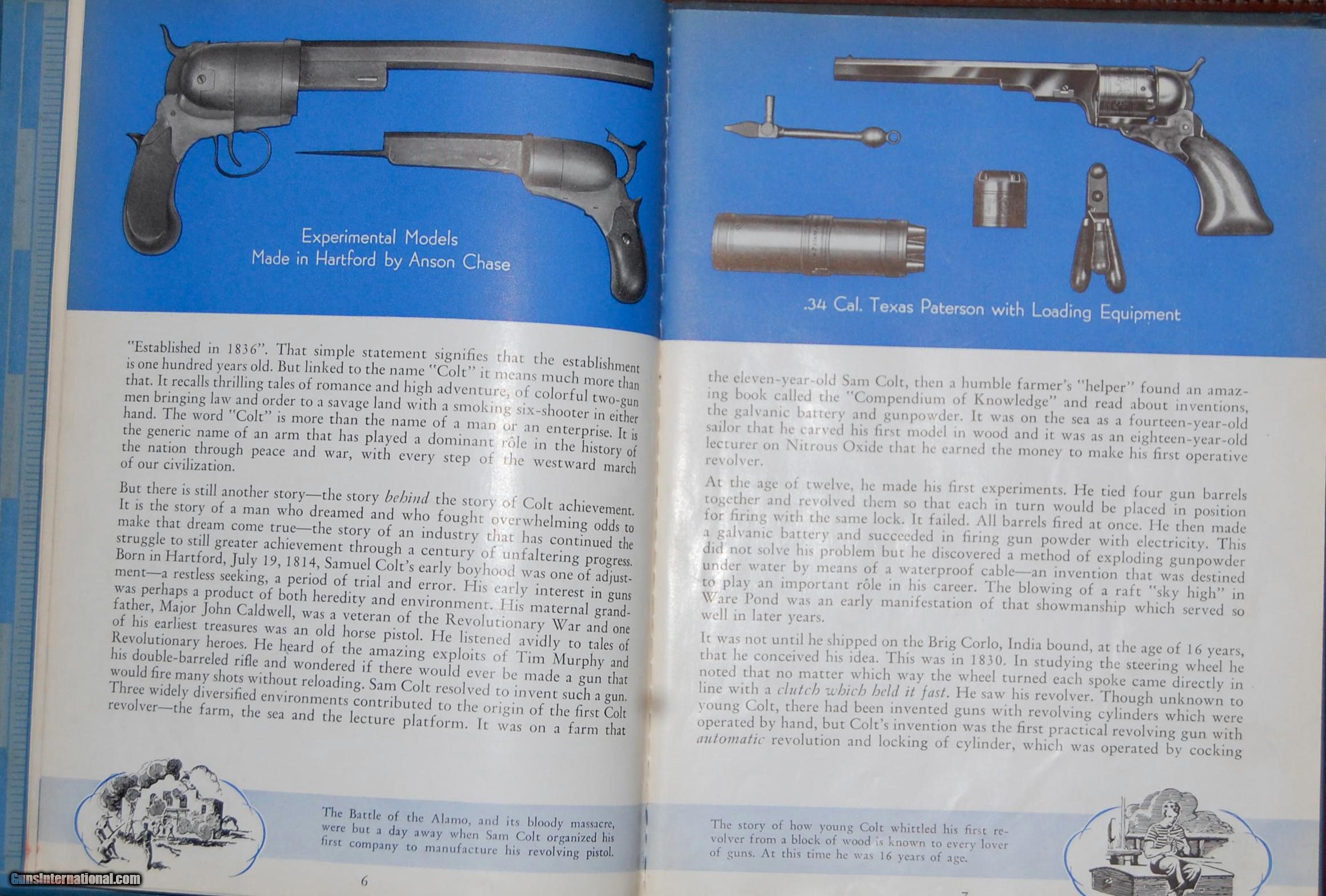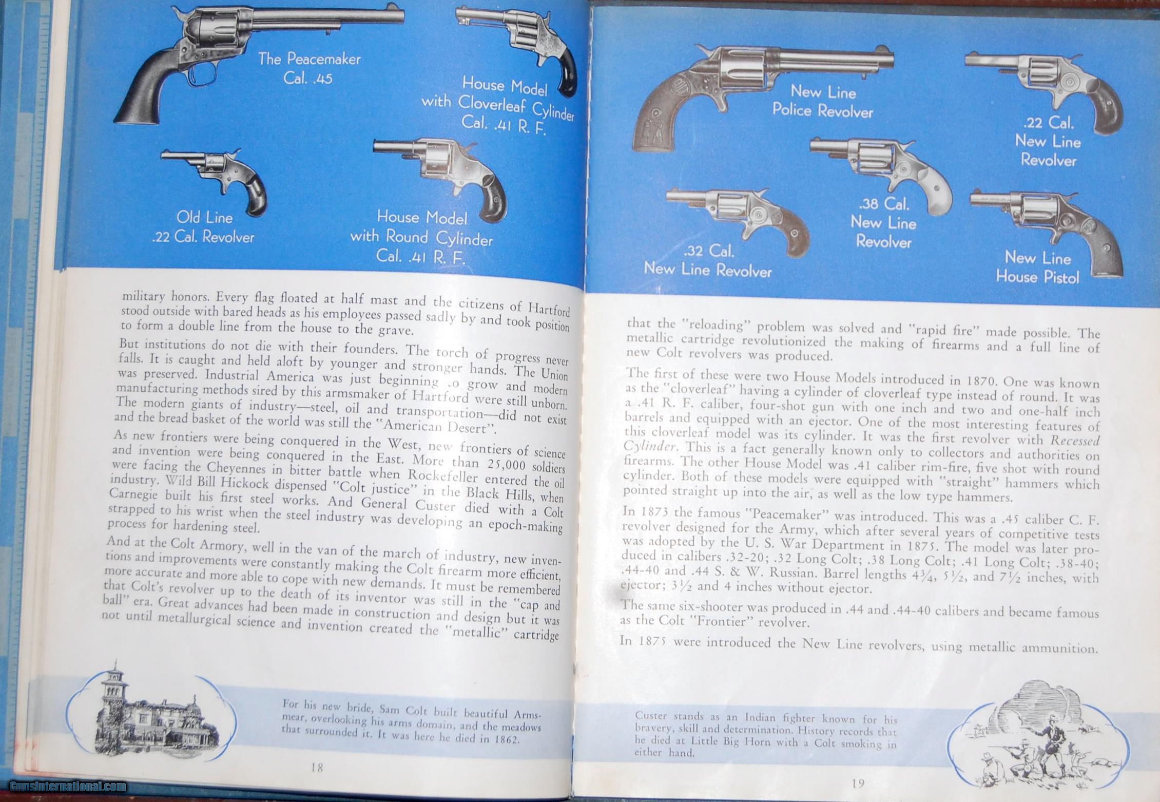 Description: A very hard to find original Deluxe embossed hardback edition of Colt's 100th anniversary catalog.Published in 1937,this 96 page catalog gives a detailed history of the company from its founding in 1836 through 1936.There are detailed photos and discussions of every firearm Colt built in that period.There is also a photo and written tour of the factory and discussions of their manufacturing processes.Also included is an article by Col.Charles Askins on how to become an expert shot.There are ballistics tables and info on all the cartridges Colt built for at the time.This copy is in very good condition with only a slight bit of wear on the corners.There is the name "A.H.Reupke 2608 LeClarie St. Davenport,Iowa" written in pencil on the title page.The book is otherwise unmarked.This is the ultimate reference book on early Colts and the deluxe editions are hard to find in good condition.There were many paperback editions printed,but the deluxe embossed books were saved for good customers,distributors,and VIPS.A must for the serious Colt collector. SOLD |
