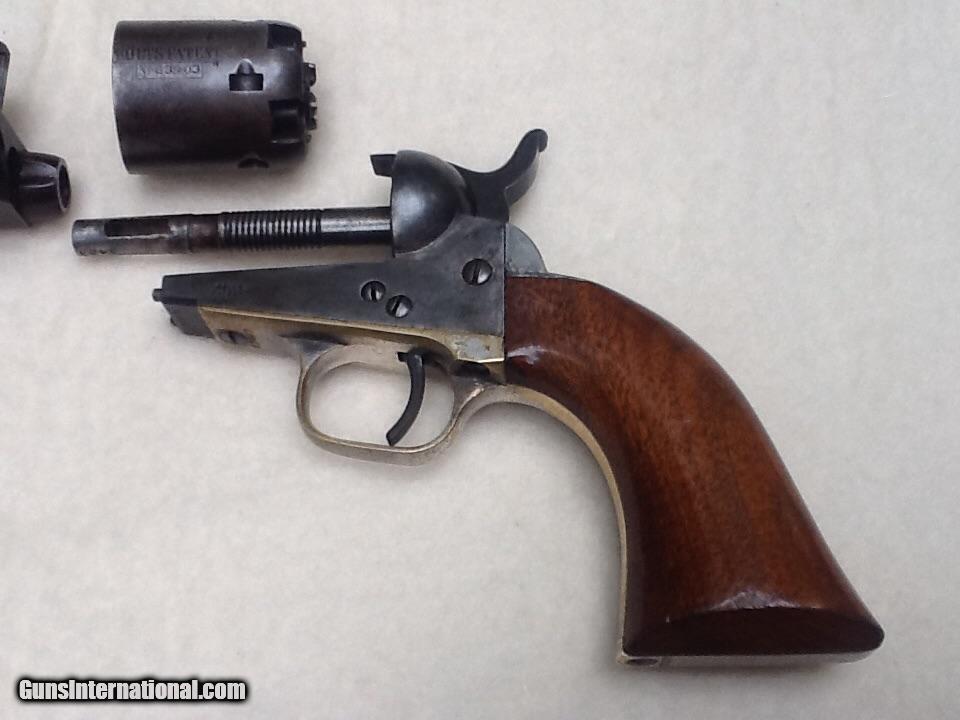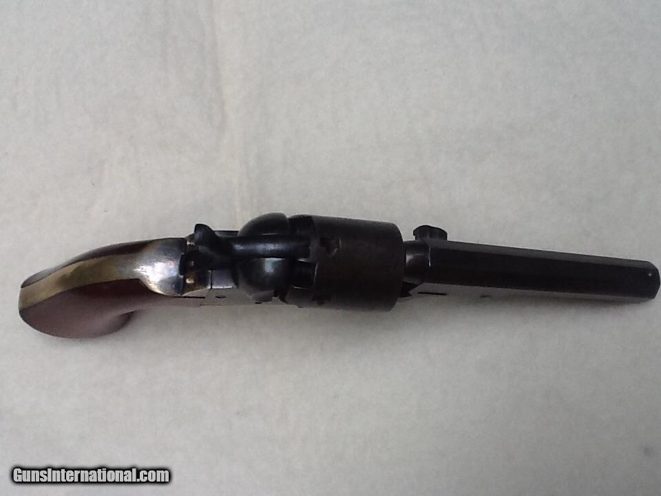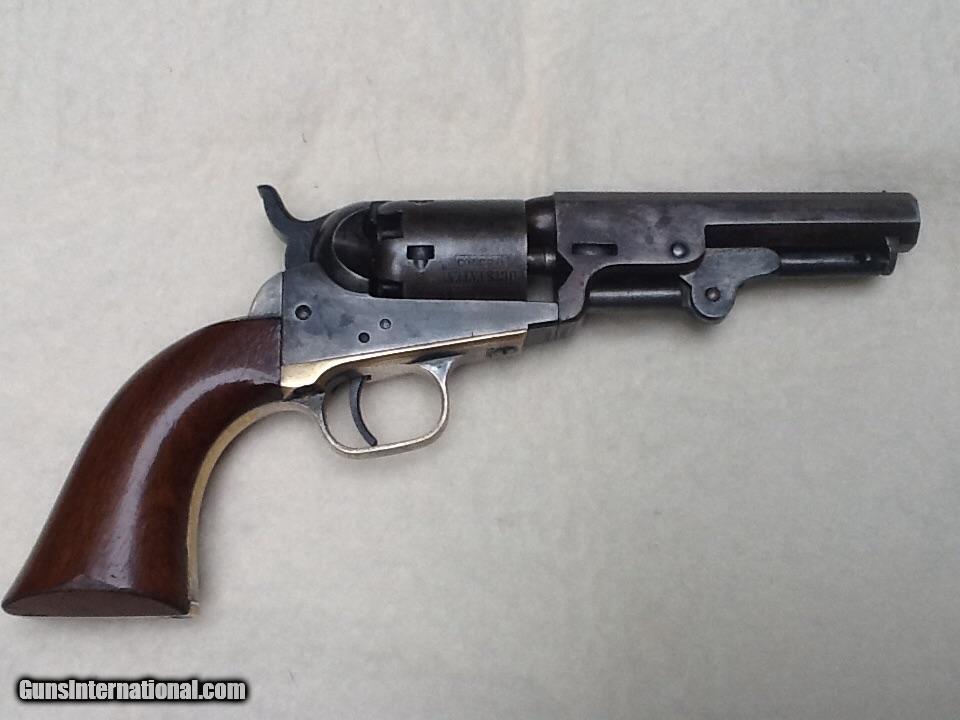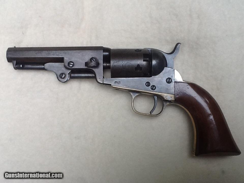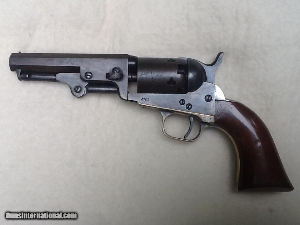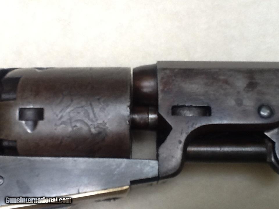 Description: COLT MODEL1849 Pocket 31 Caliber with 4 " barrel. This early version pocket was made in 1851 as indicated by the serial number, and has the first style loading cut out in the barrel and the small trigger guard. All serial numbers match including the wedge and cylinder. The cylinder stagecoach scene is sharp, and the 5 safety pins on the rear are all present. The barrel address is the two line early New York City version. All the metal is rust and pit free and faded to blue. The brass grip frame has trace silver remaining. Bore condition and cylinder chambers are as new. The walnut grips have original varnish and no cracks. Please examine the photos closely to determine physical condition. N.J. residents will have to comply with state law. Shipping will be $25.00 in the CONUS? SOLD |
