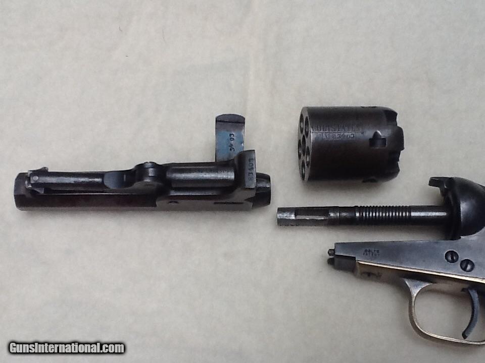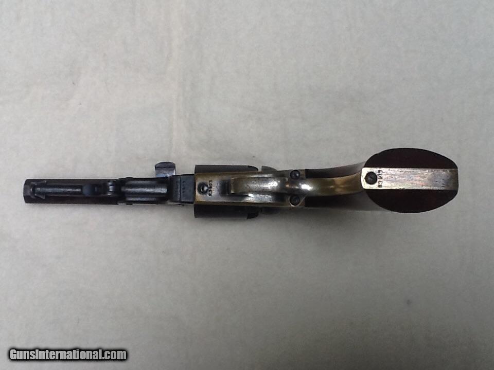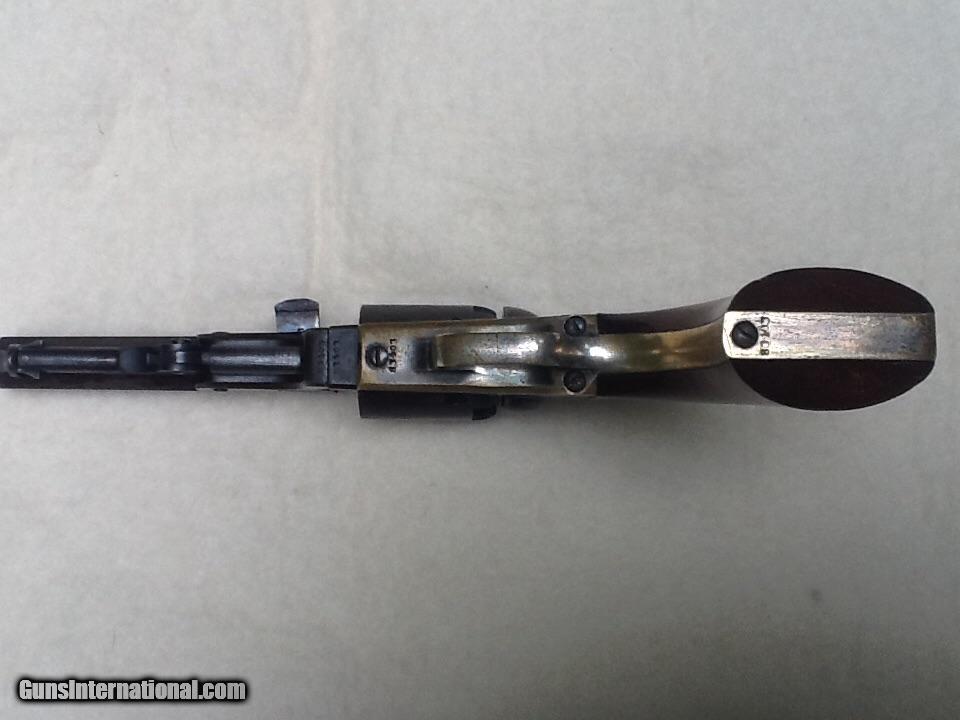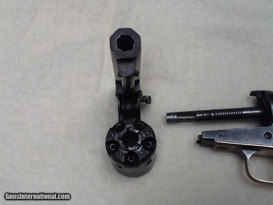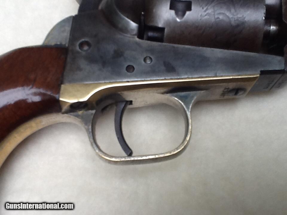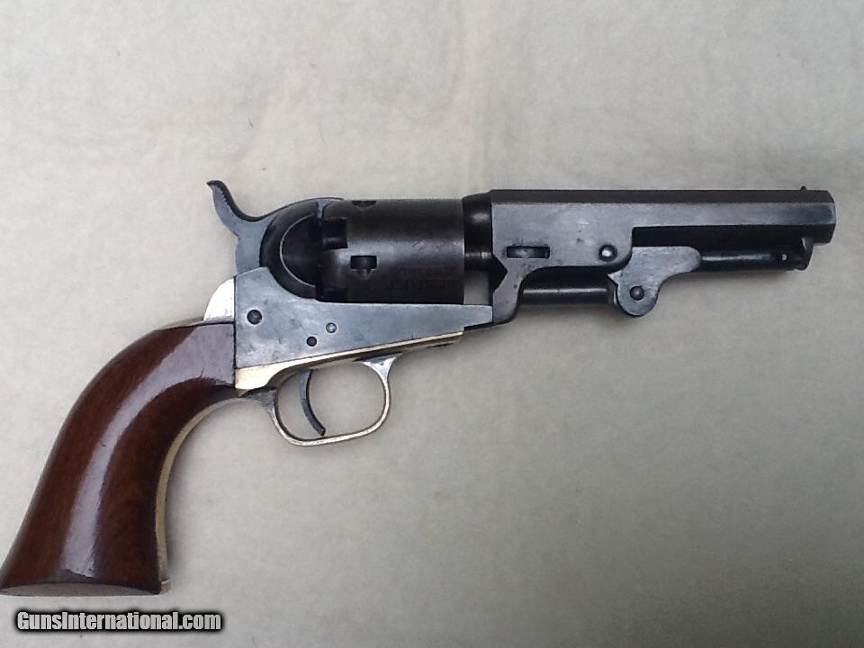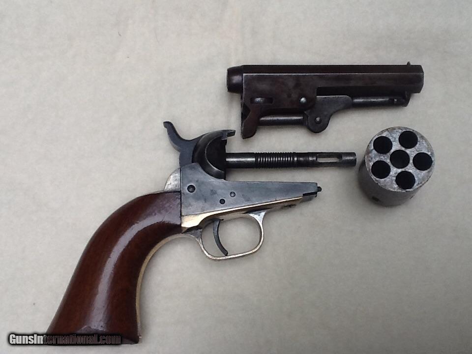 Description: COLT MODEL1849 Pocket 31 Caliber with 4 " barrel. This early version pocket was made in 1851 as indicated by the serial number, and has the first style loading cut out in the barrel and the small trigger guard. All serial numbers match including the wedge and cylinder. The cylinder stagecoach scene is sharp, and the 5 safety pins on the rear are all present. The barrel address is the two line early New York City version. All the metal is rust and pit free and faded to blue. The brass grip frame has trace silver remaining. Bore condition and cylinder chambers are as new. The walnut grips have original varnish and no cracks. Please examine the photos closely to determine physical condition. N.J. residents will have to comply with state law. Shipping will be $25.00 in the CONUS? SOLD |