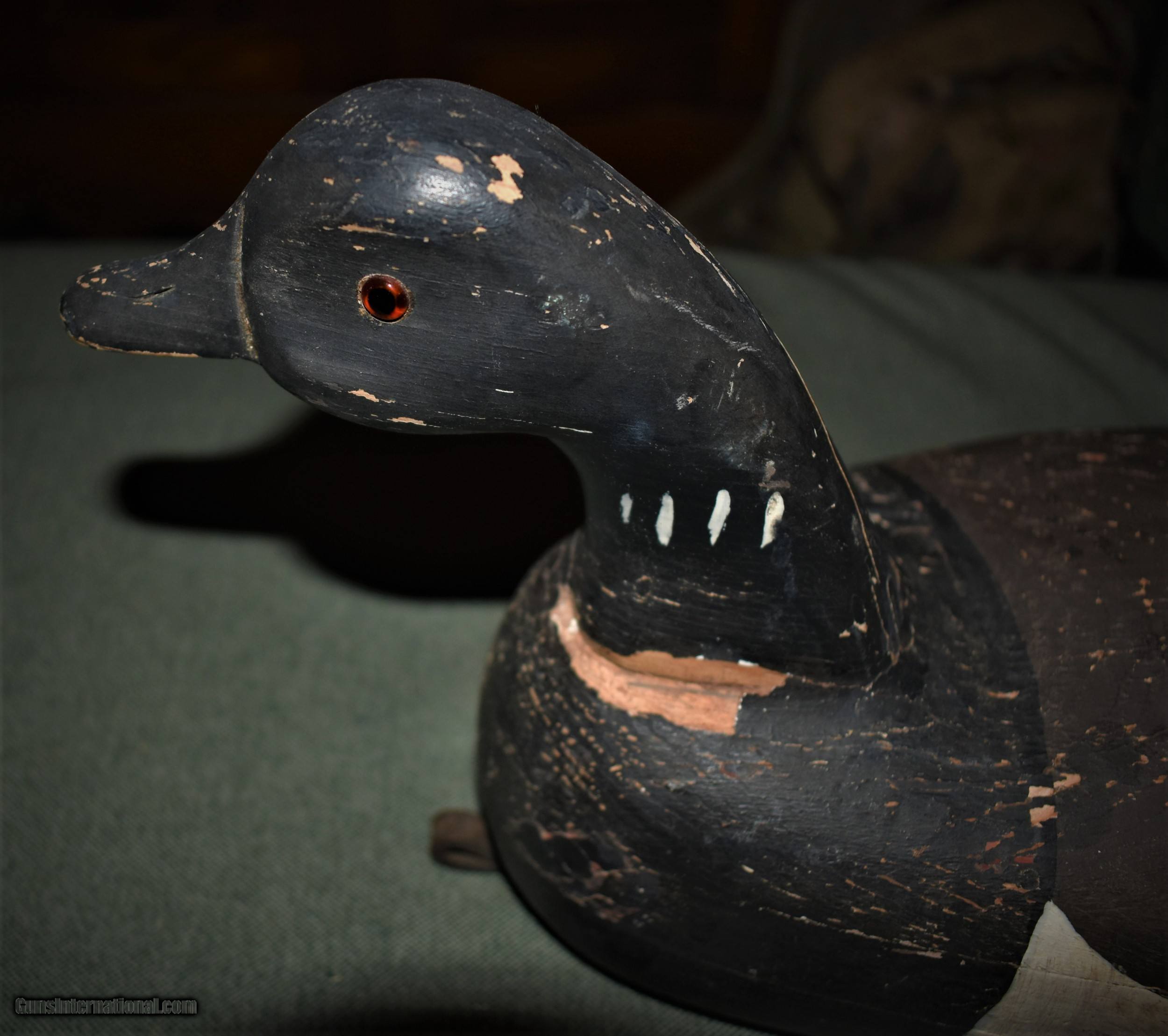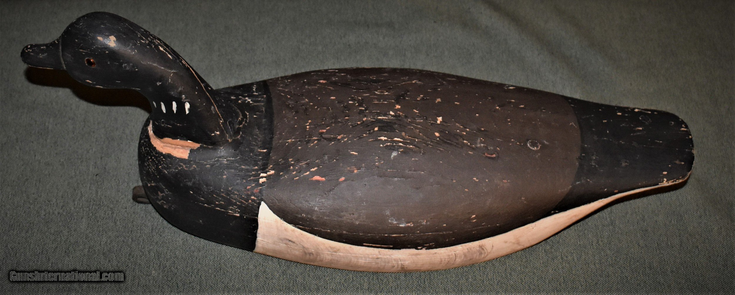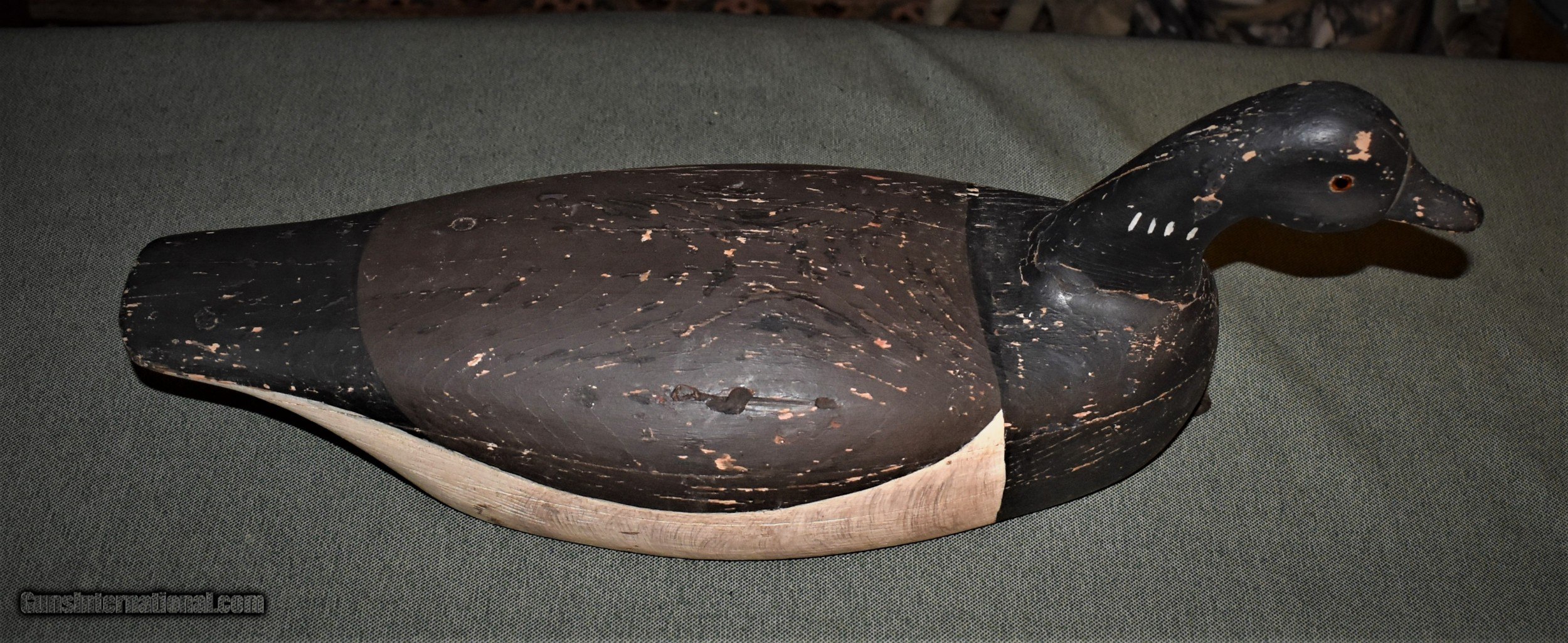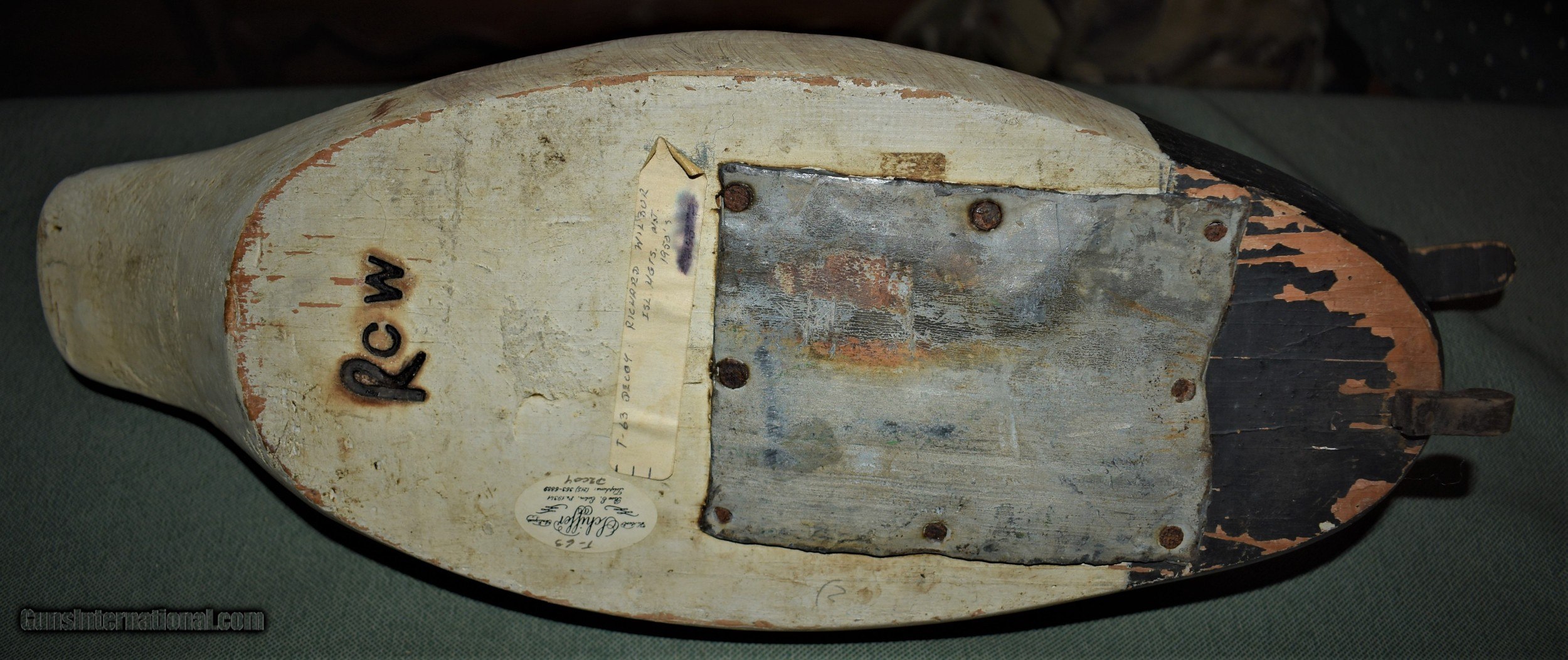 Description: A hollow body brant decoy in the swimming position stamped WCR. There is an old piece of tape on the bottom that reads "Richard Wilbur Isl Hgts, NJ 1950".Also a sticker from Schiffer Antiques Easton,Pa. The decoy retains its original paint and shows some use. The paint is chipped in a few places but is still vivid and well done. There is some of the neck filler missing on the right side of where the neck meets the body but the head is on tight. Ther is an age crack on the back of the neck that is stable.This is obviously a working bird,but very hard to find in any decent condition. A nice addition to any collection and a fine bird for the mantle in your gun room or duck club. SOLD |