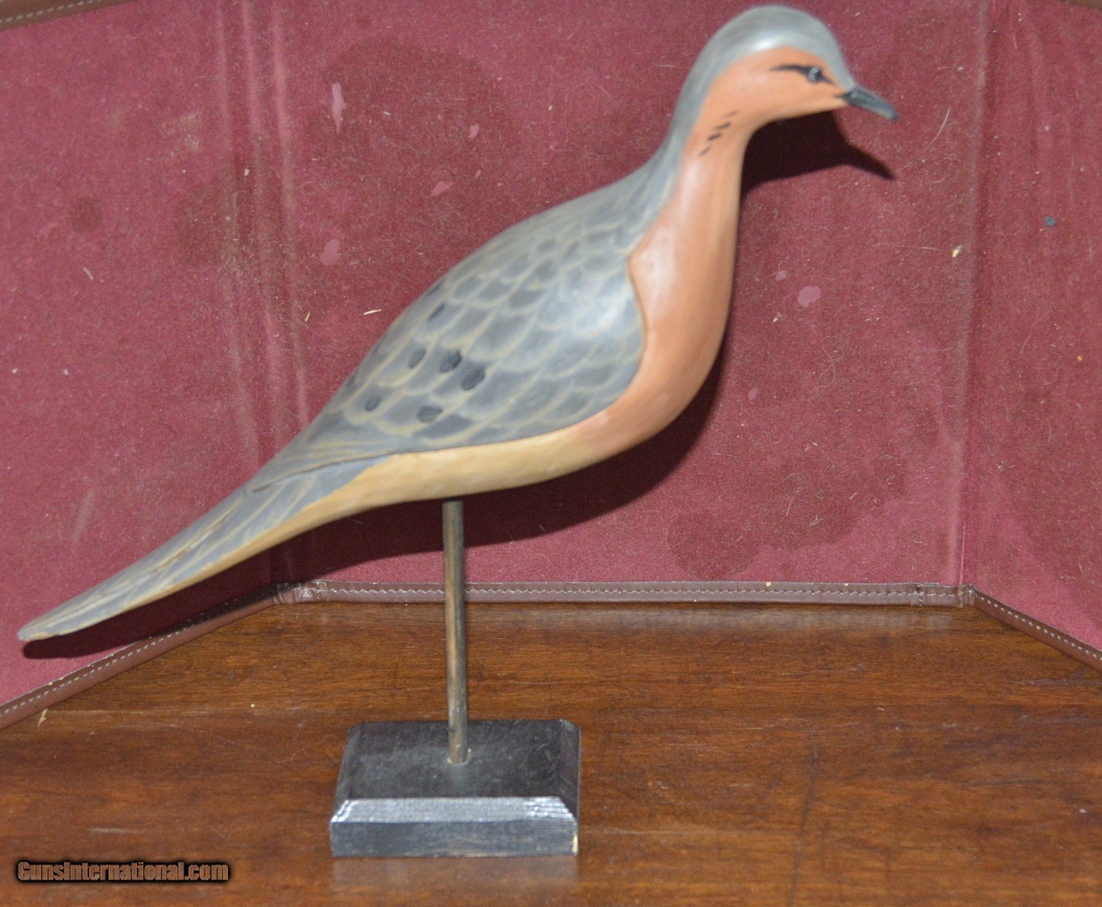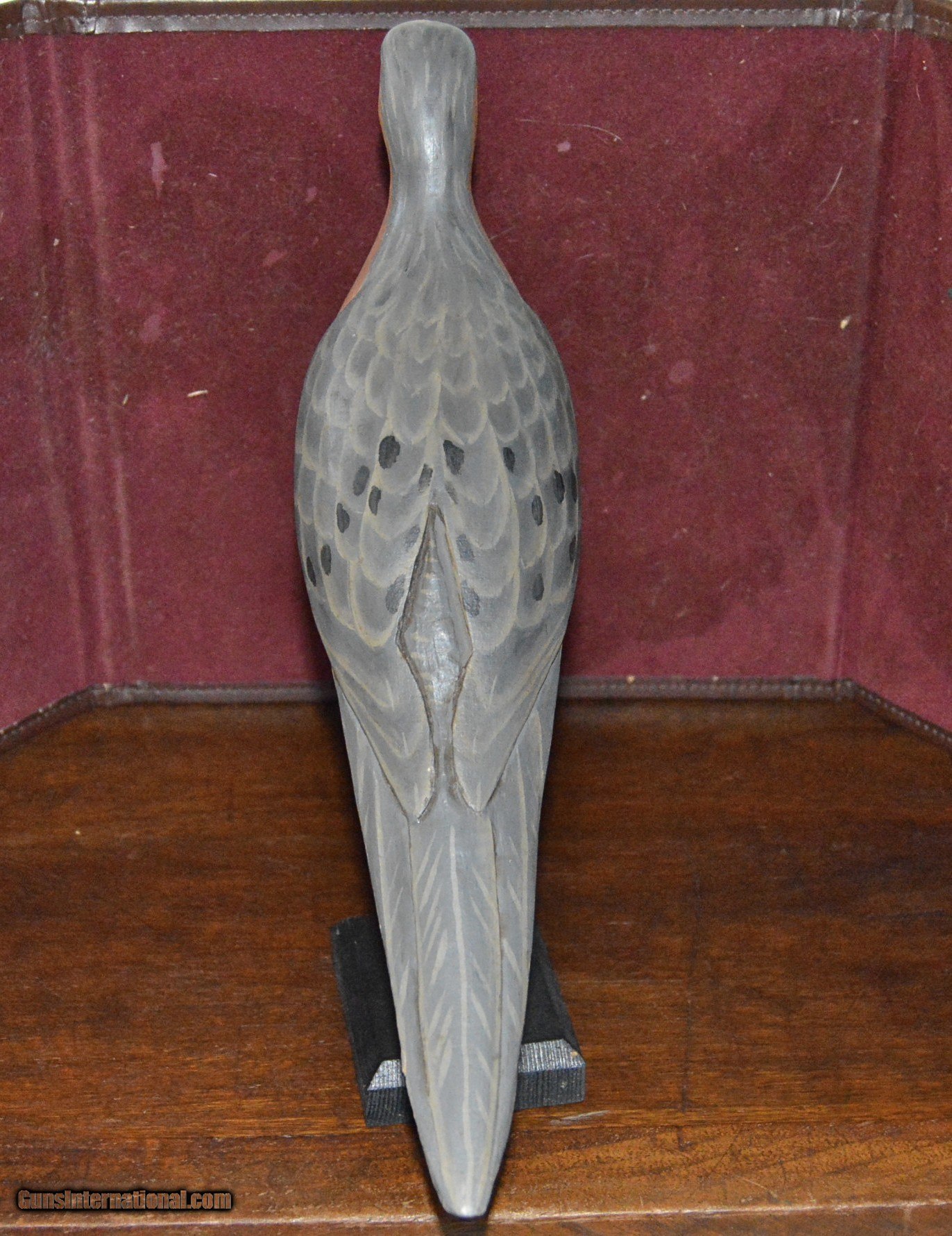 Description: A hand carved contemporary carrier piegeon decoy.Beautifully carved and painted.Feather details are carved into the back.The carvers initials KI are carved on the underside of the tail.An unusual addition to your den or gun room. SOLD |