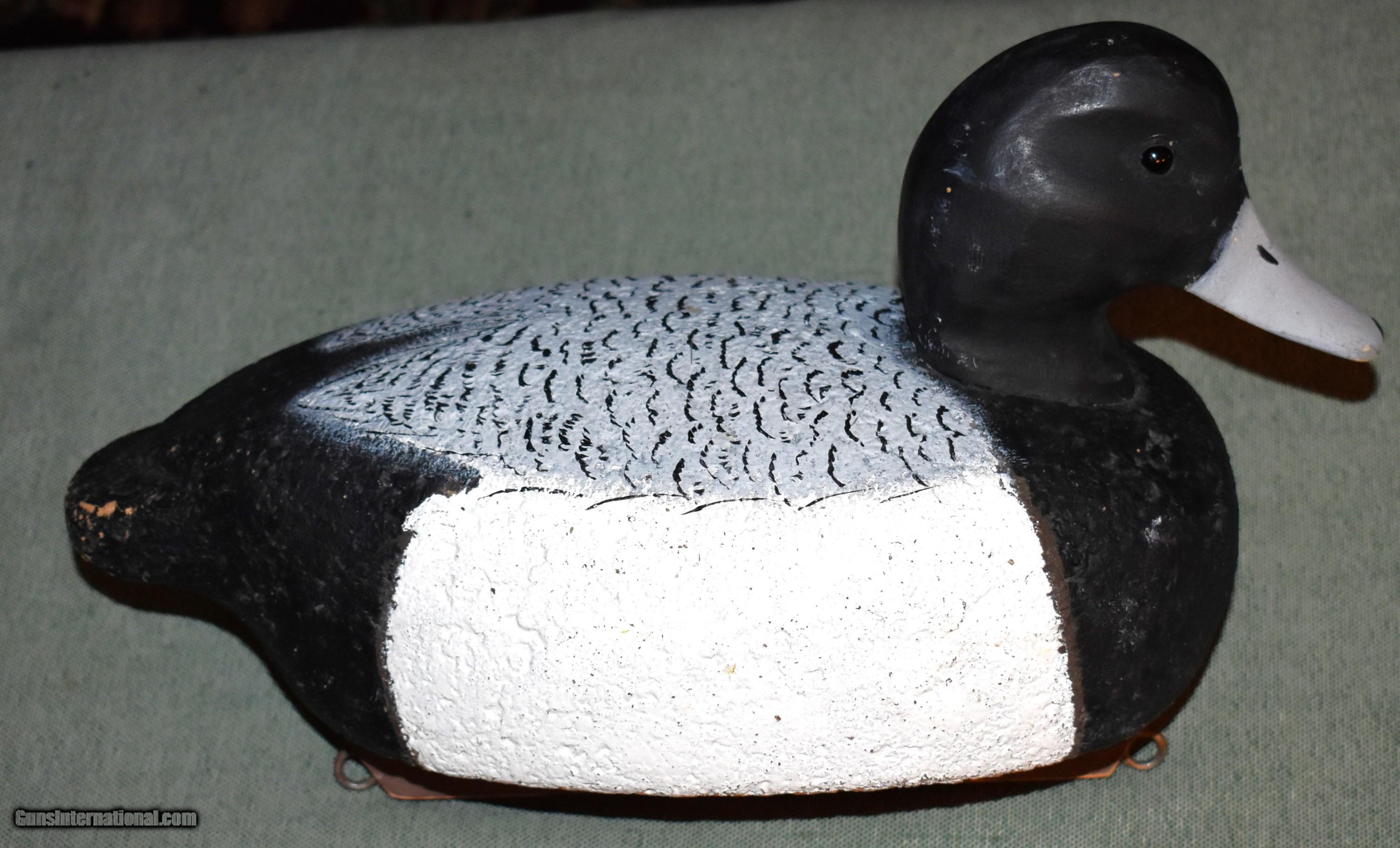 Description: A drake bluebill signed by Tim Mcintyre. Carved head with glass eyes and cork body. Great feather detail painting. Appears to be unused. A great addition to your gun room or den. Overall length is 13". SOLD |