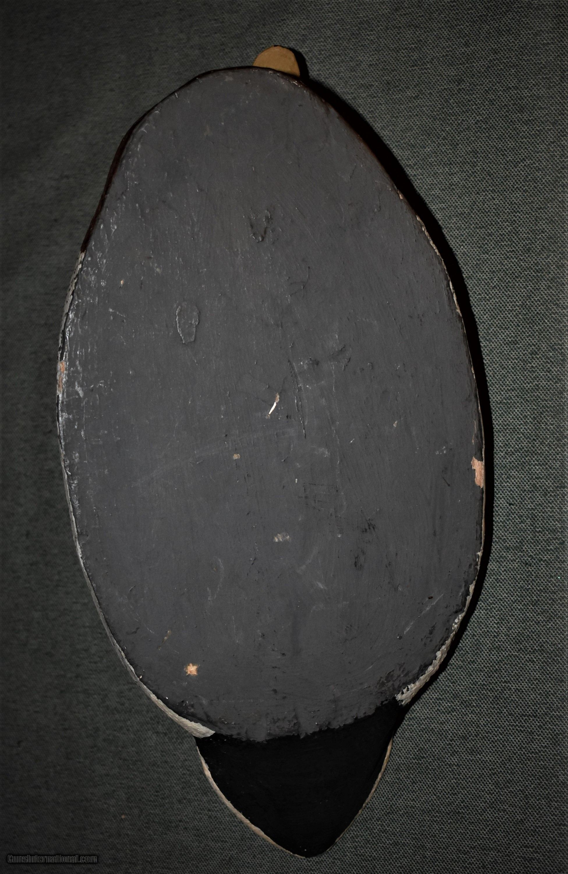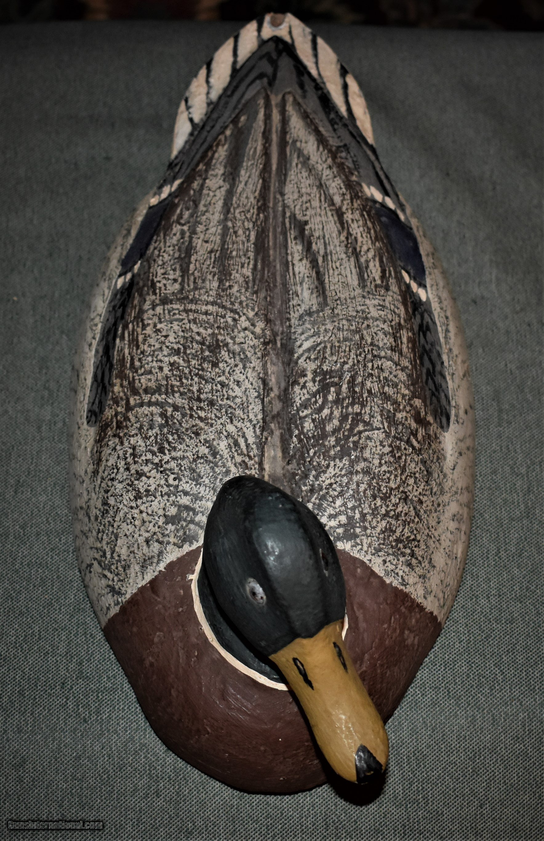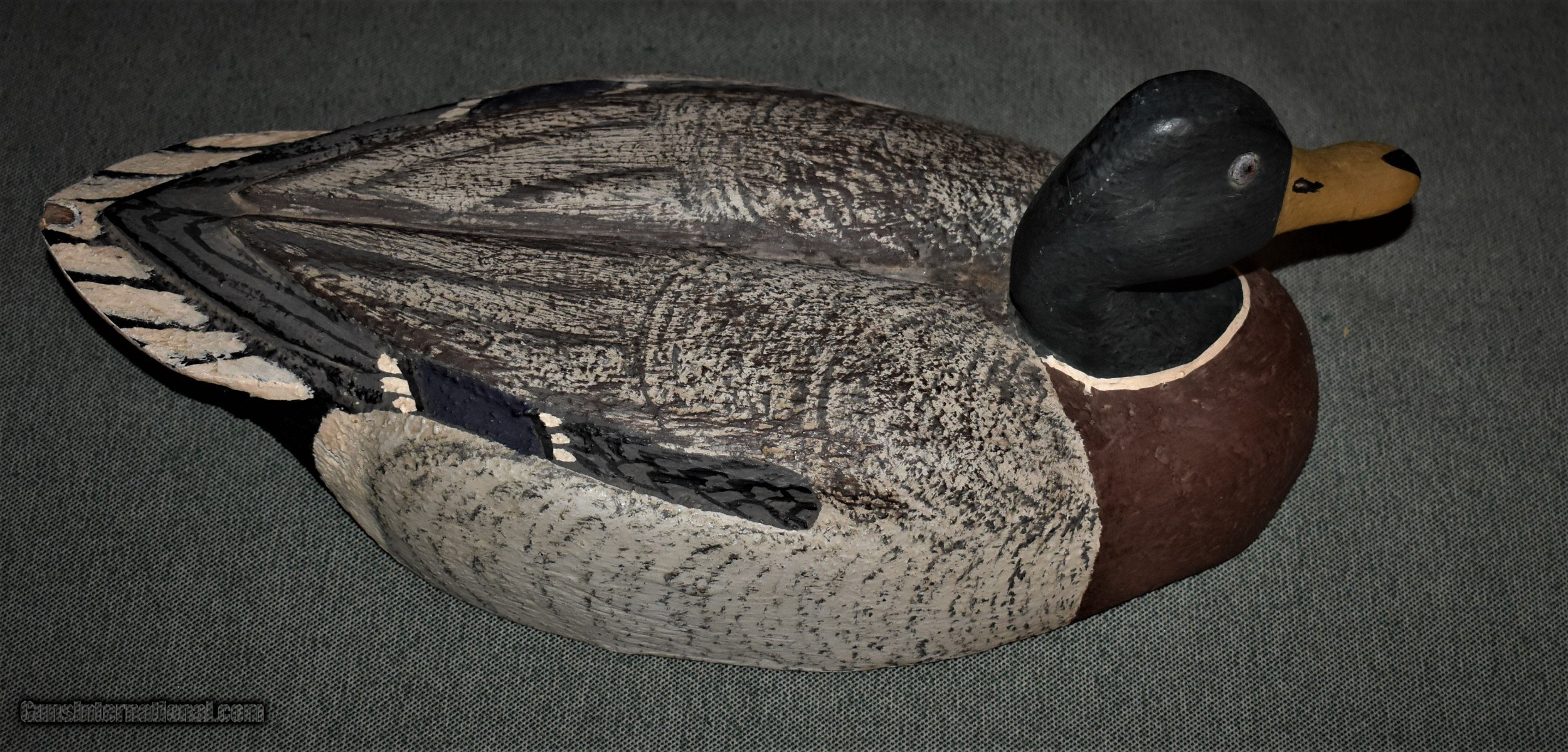Description: A hand carved mallard drake by an unknown maker. Circa 1960s or 1970s. Hollow body construction and excellent paint job. Turned head and glass eyes.Carved feather detail. A very nice addition to the gun room,den,or hunting lodge. SOLD |