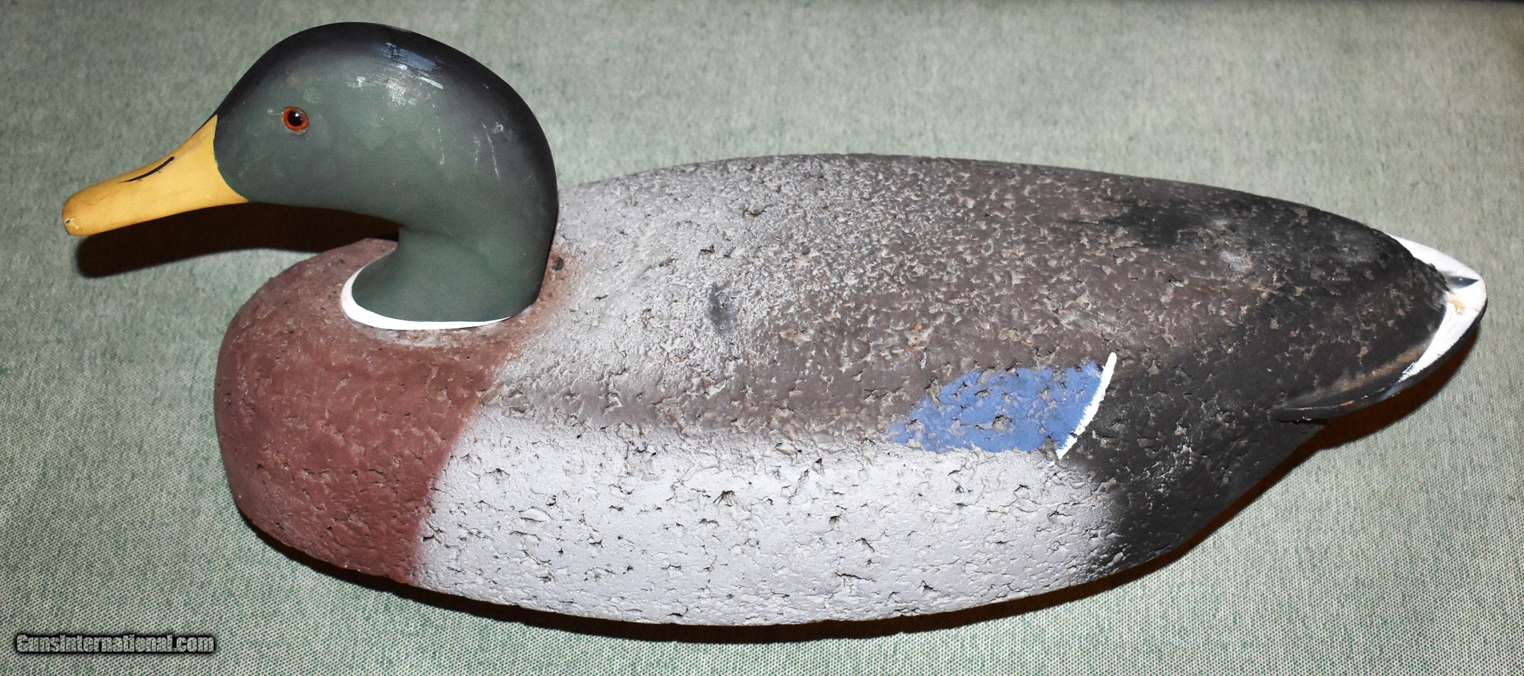 Description: A drake mallard LL Bean coastal cork body magnum decoy. Carved head with glass eyes and carved tail. overall length is 19". Excellent condition showing little use. These were some of the first "magnum" oversized decoys commercially available. A nice addition for gunroom,den,or hunting cabin. SOLD |