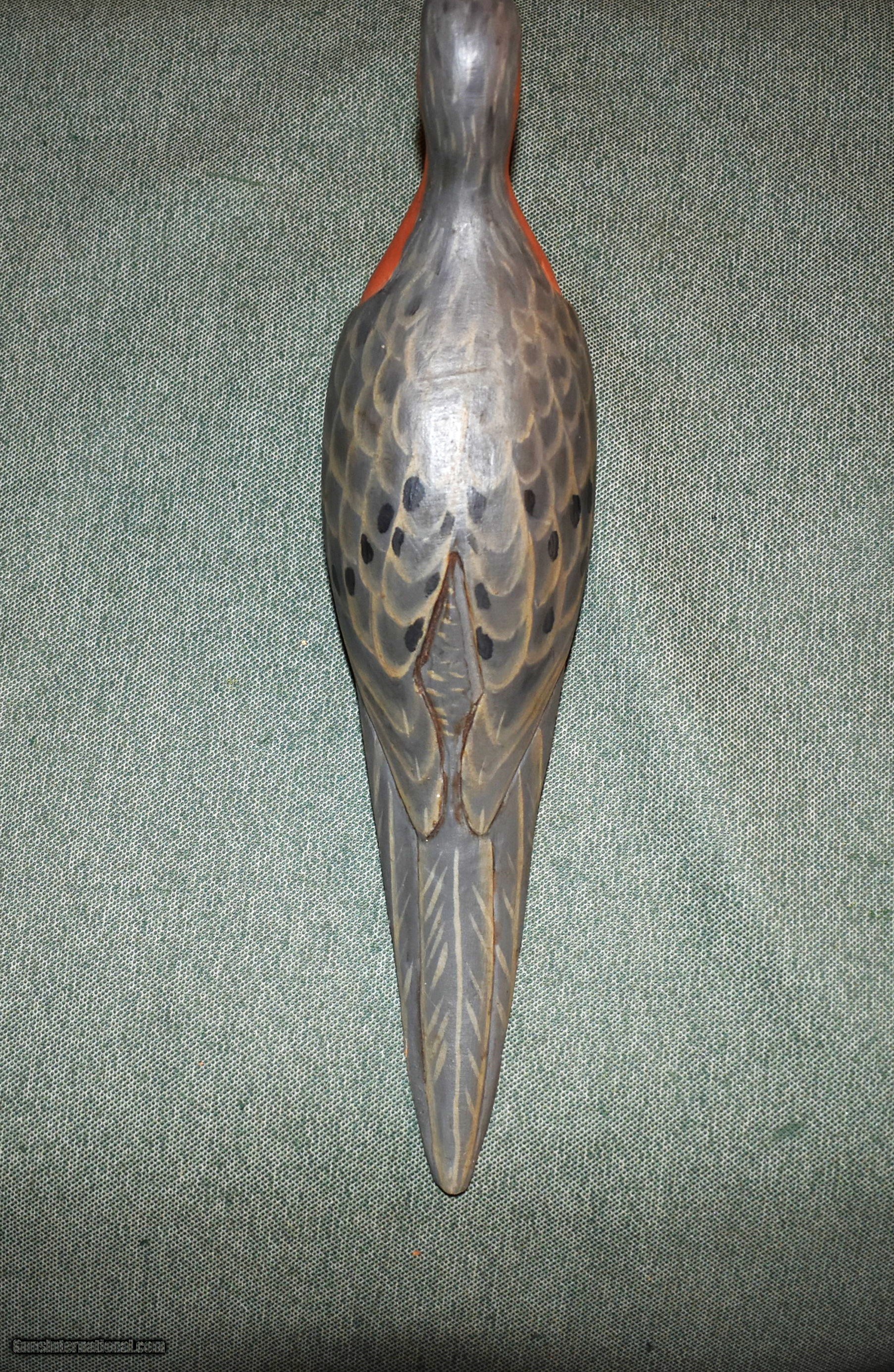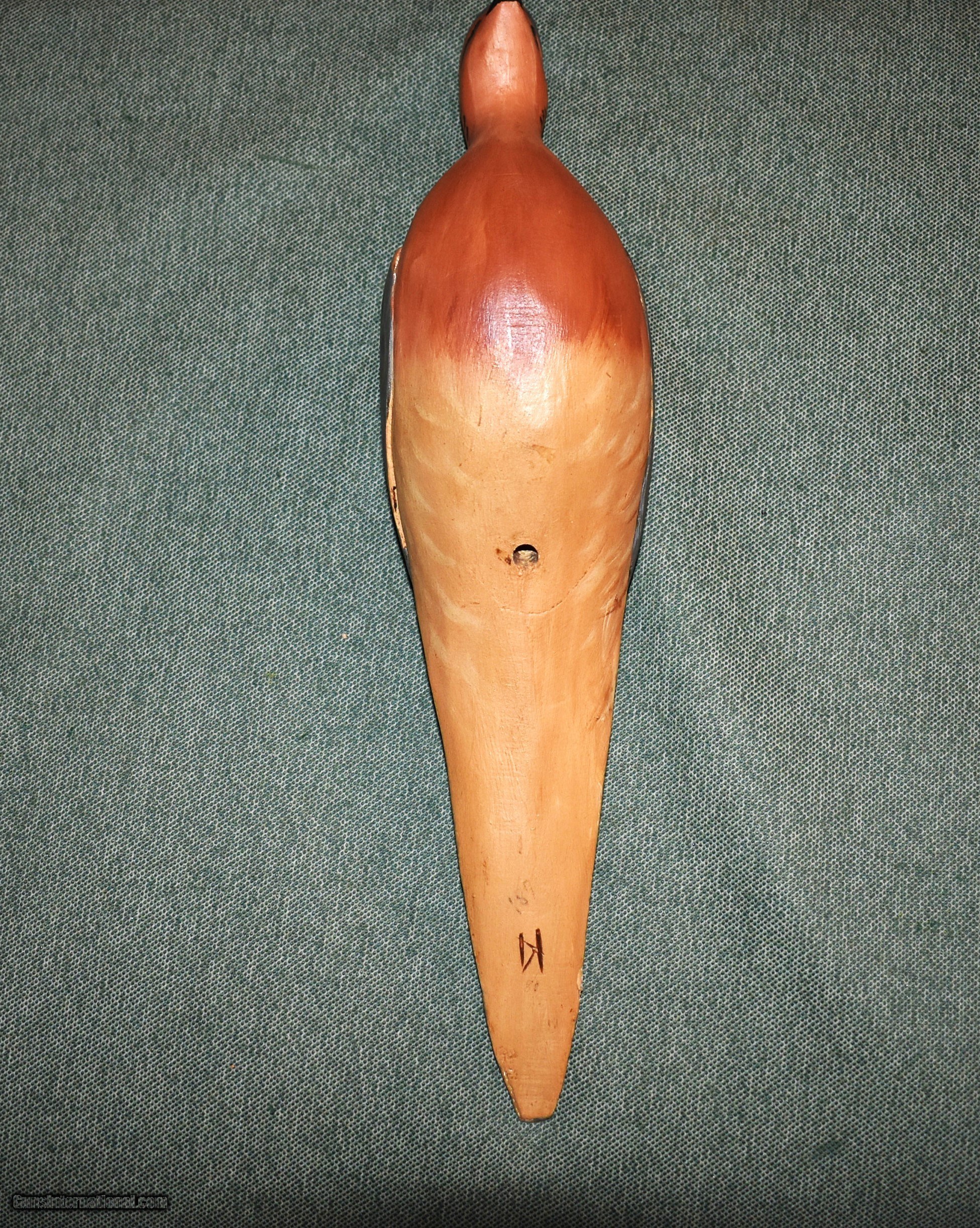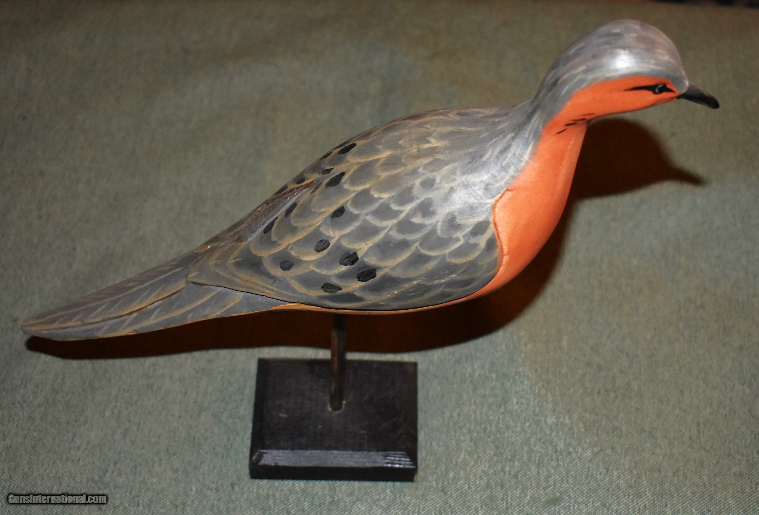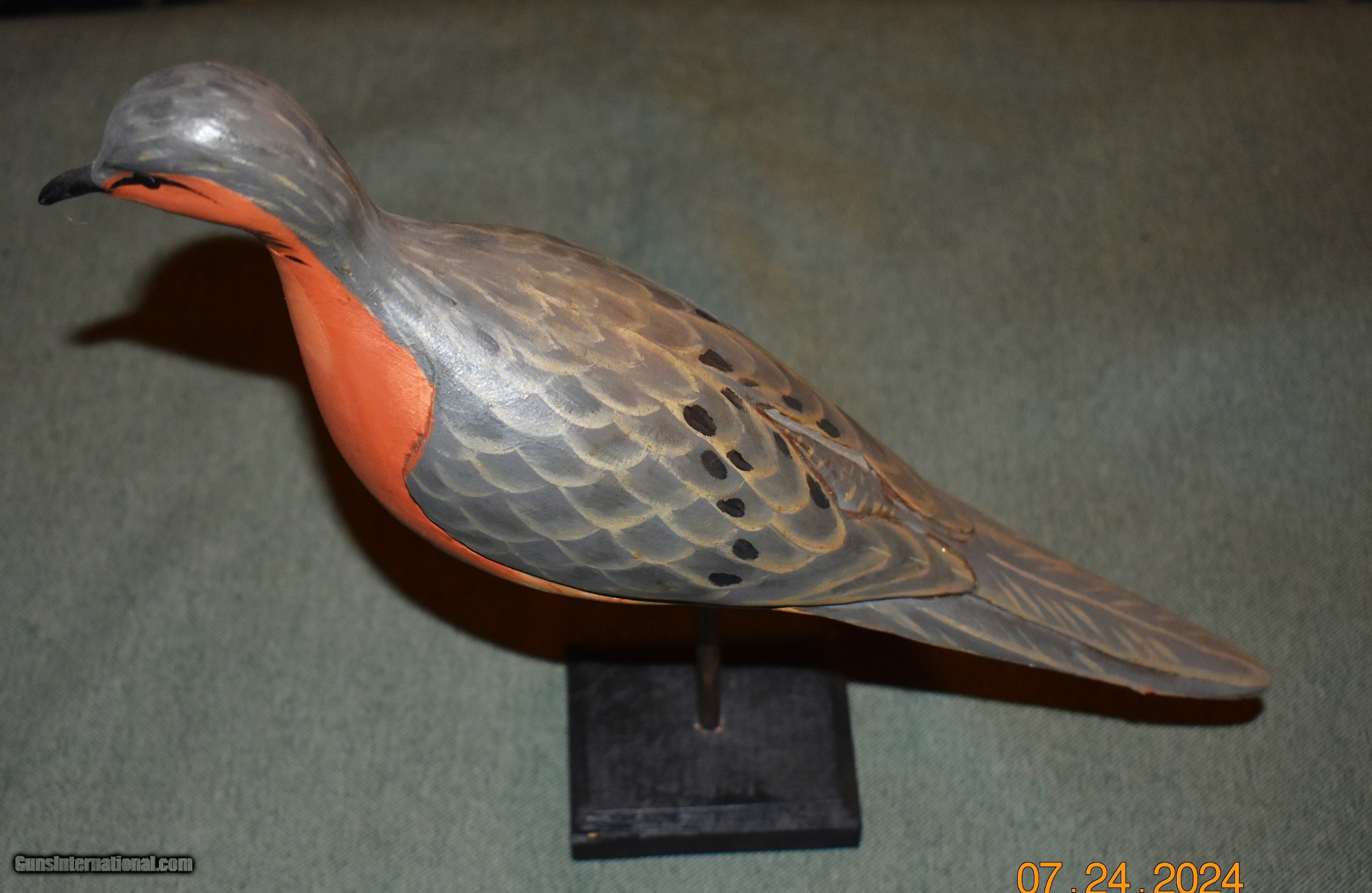Description: Contemporary hand carved passenger pigeon decoy. Signed KI under the tail. Beautifully hand painted feather detail. A unique decoy that would look great in the den or gun room. Price includes shipping. SOLD |