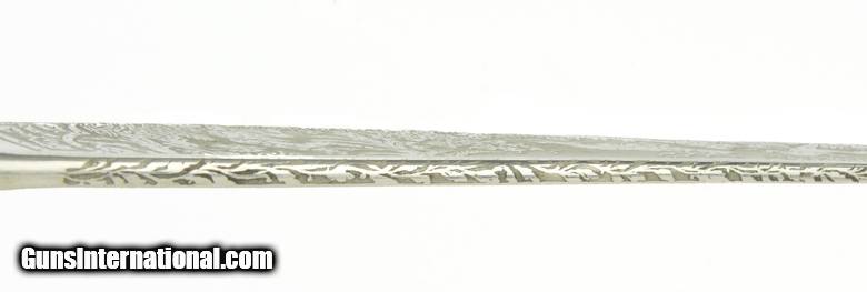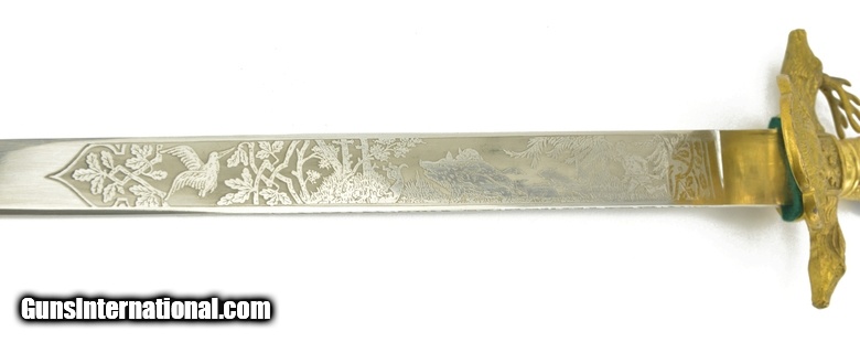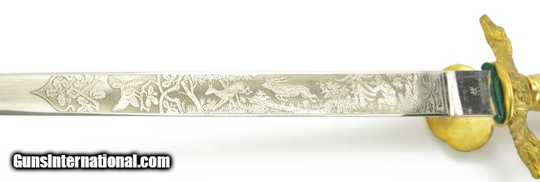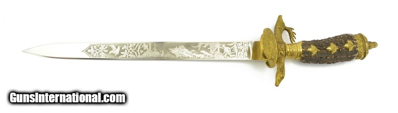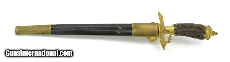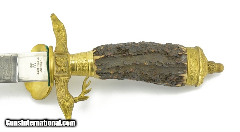 Description: German Hunting Dagger. (Hirschfanger) Imperial period of WWI or possibly earlier. Blade length is 13”. Overall length is 20 ½”. Manufactured by J. A. Henckels, Solingen (A company founded in 1731). Hilt is Staghorn mounted in gilted brass pommel cap, a dog and stag crossguard, and a boar attacked by dogs on the langet. The staghorn is also accented with oak leaves and acorn stubs. The blade is beautifully etched with scenes of a stag chasing a doe and a hunter poised to fire his rifle. The reverse is a scene of a boar being taken by four dogs with a hunter in pursuit, all in a woodland setting. The scabbard is excellent and has a pocket side knife with a stag handle. This is a very fine Hirschfanger that would be a pleasure to own.