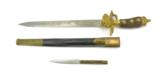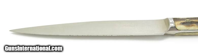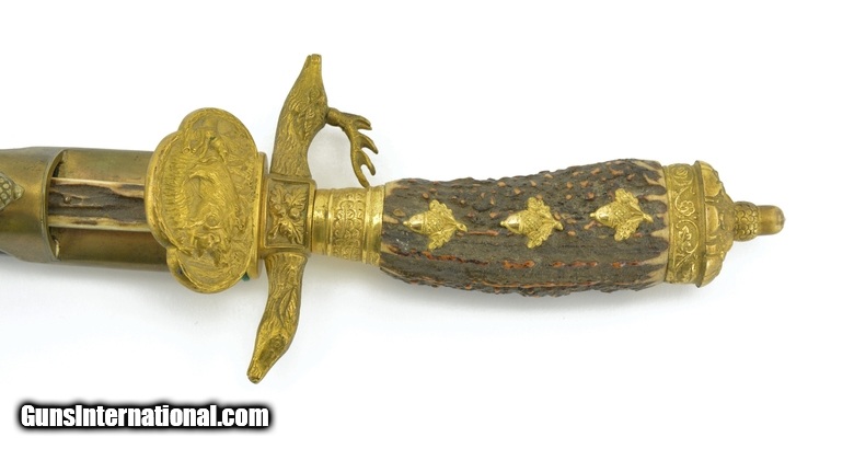 German Hunting Dagger. (Hirschfanger) Imperial period of WWI or possibly earlier. Blade length is 13”. Overall length is 20 ½”. Manufactured by J. A. Henckels, Solingen (A company founded in 1731). Hilt is Staghorn mounted in gilted brass pommel cap, a dog and stag crossguard, and a boar attacked by dogs on the langet. The staghorn is also accented with oak leaves and acorn stubs. The blade is beautifully etched with scenes of a stag chasing a doe and a hunter poised to fire his rifle. The reverse is a scene of a boar being taken by four dogs with a hunter in pursuit, all in a woodland setting. The scabbard is excellent and has a pocket side knife with a stag handle. This is a very fine Hirschfanger that would be a pleasure to own.