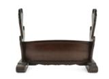 Description: Japanese Sword Stand. Shinshinto period. Brown, red, and black dusted lacquer jardiniers containing plants with long fronds with birds circling the jardiniers. Three position stand. SOLD |