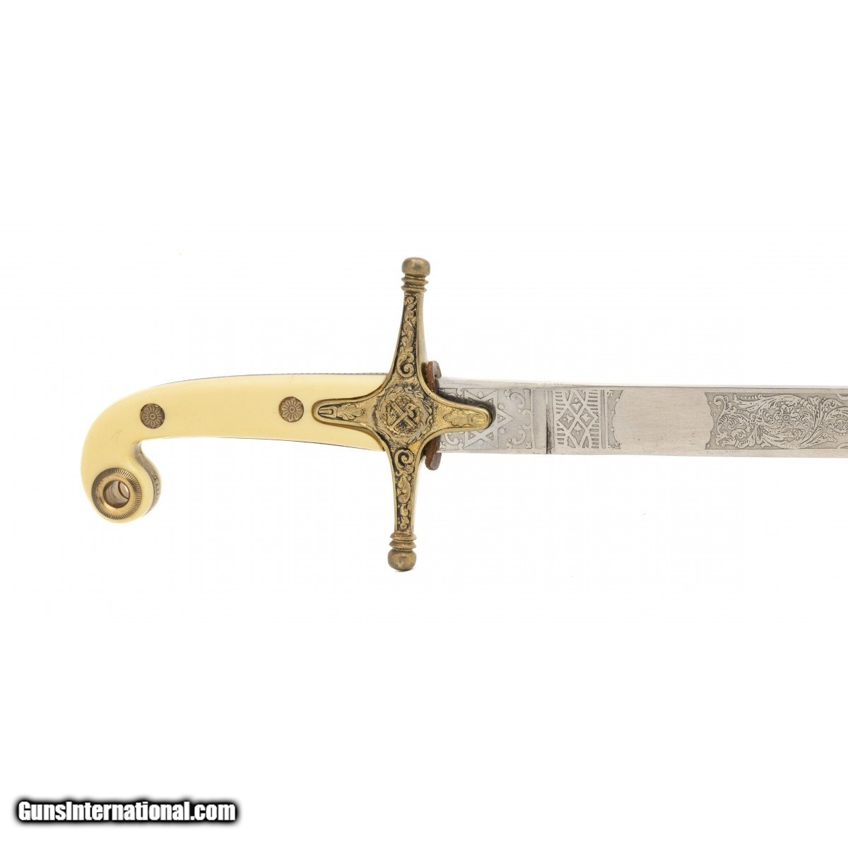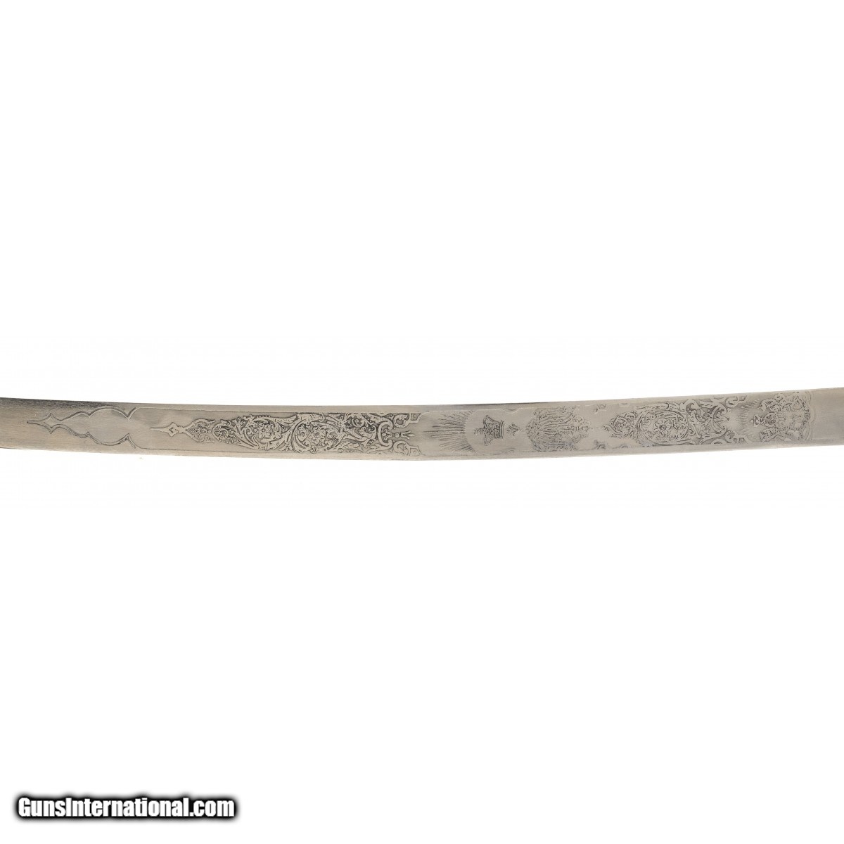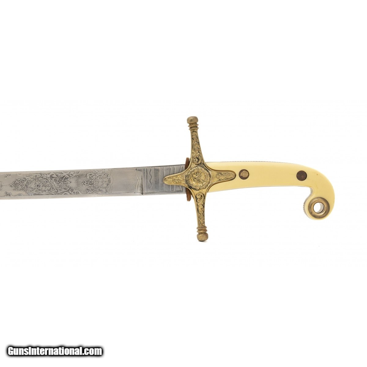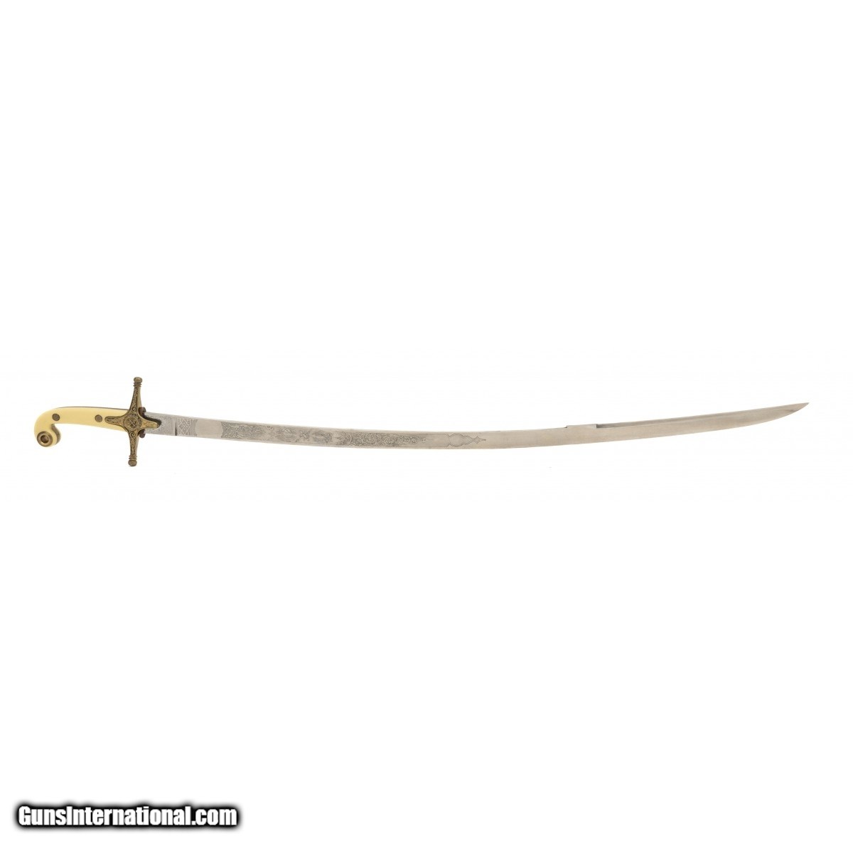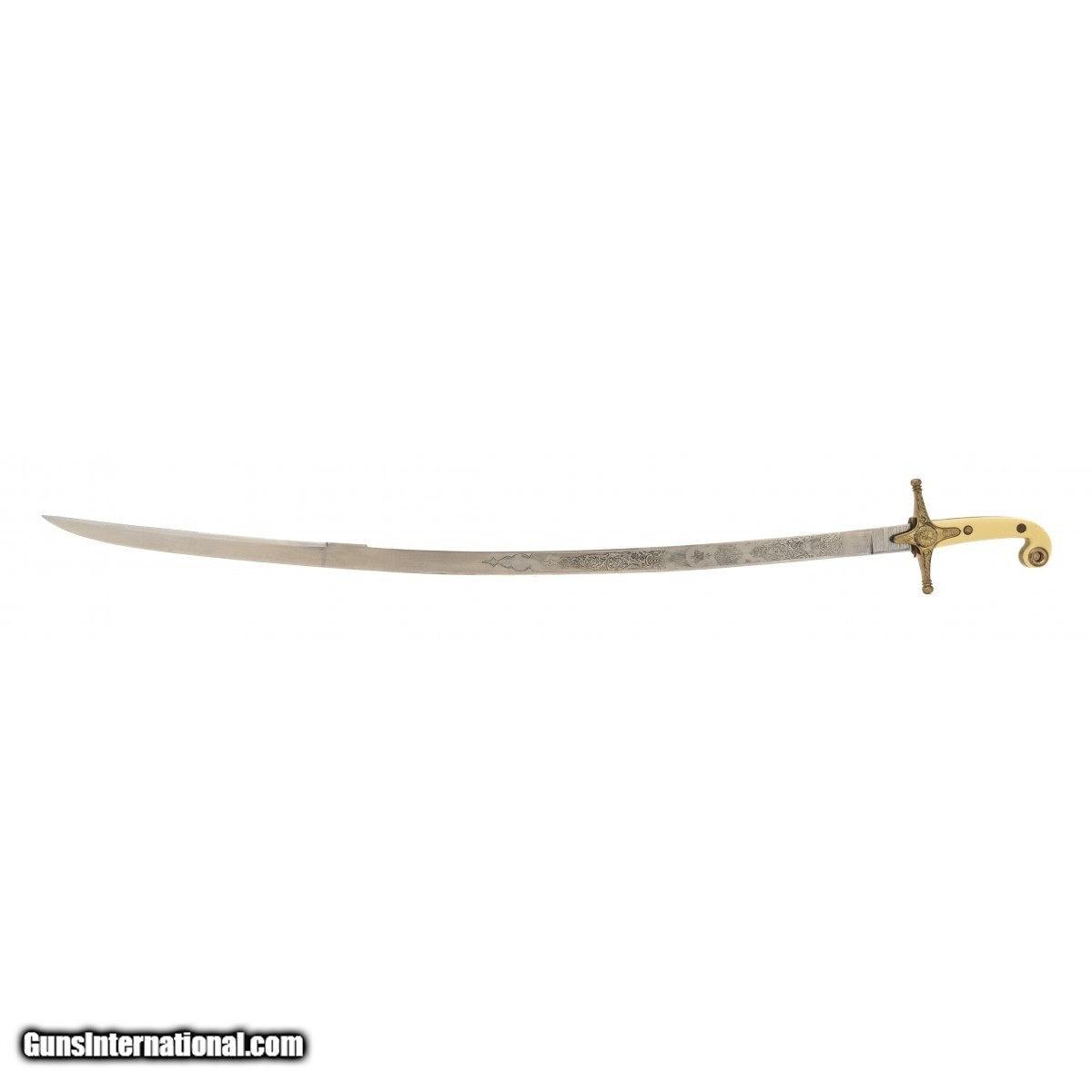 British Mameluke sword in the style of the Egyptian Mameluke swords. When occupying foreign countries, the British forces chose to wear swords in keeping with the local military in solidarity with the local soldiers. These swords had blades etched in various designs. This model has the Seal of the English Crown, crossed sabers and floral motifs. We approximate this sword to be from 1882-1914 during the period of British occupation of Egypt.