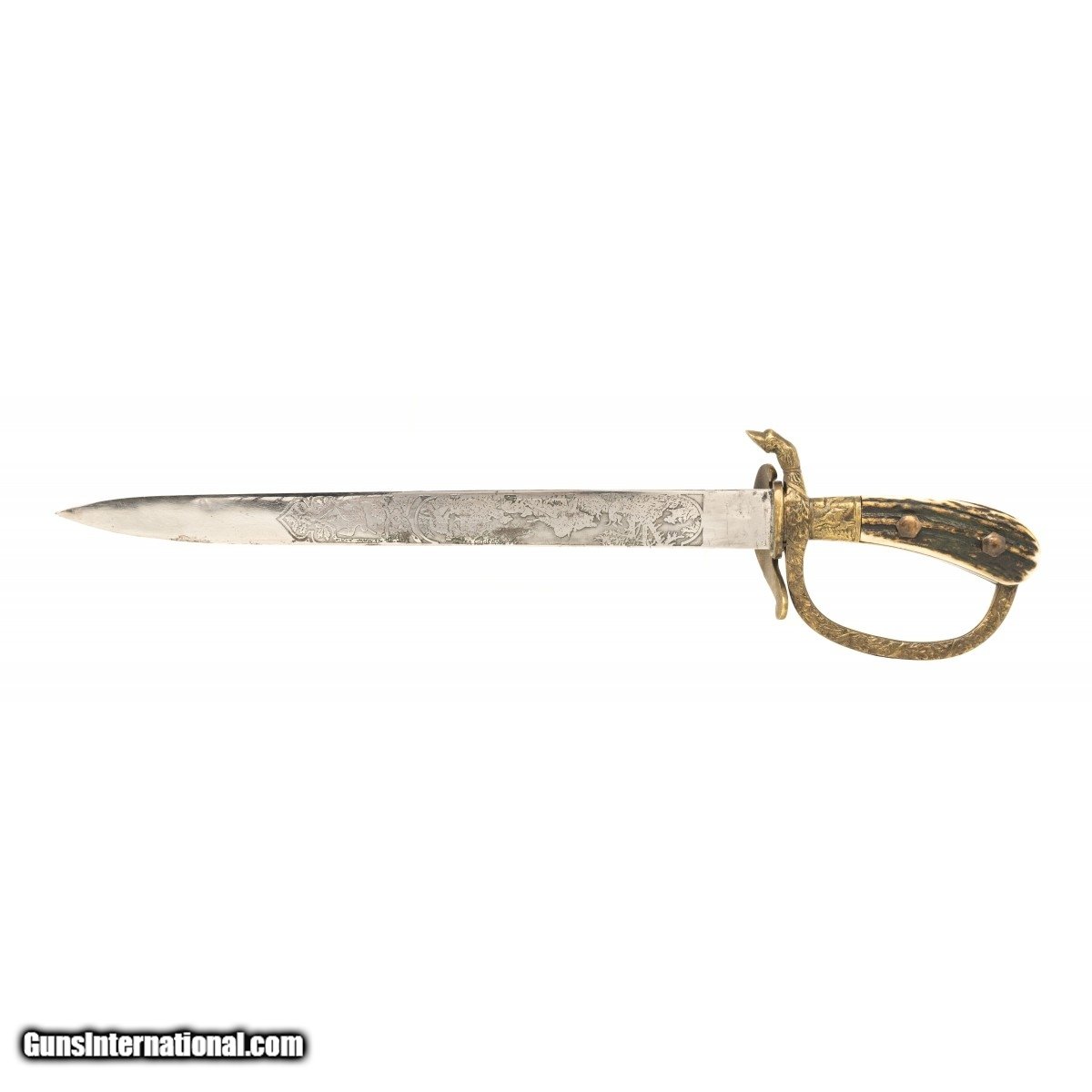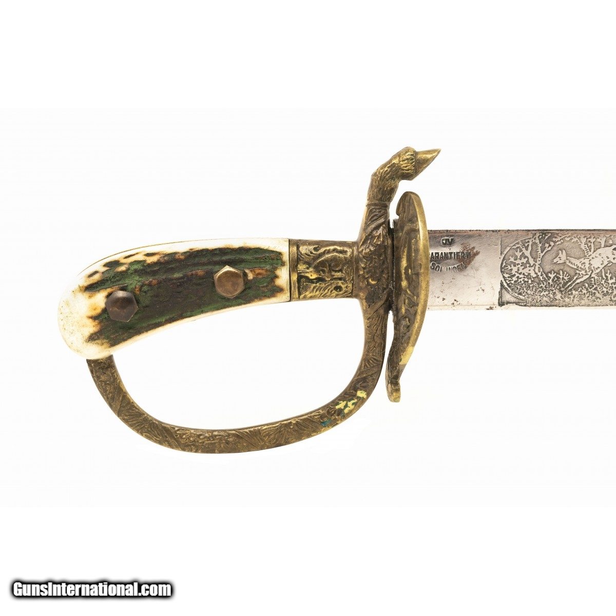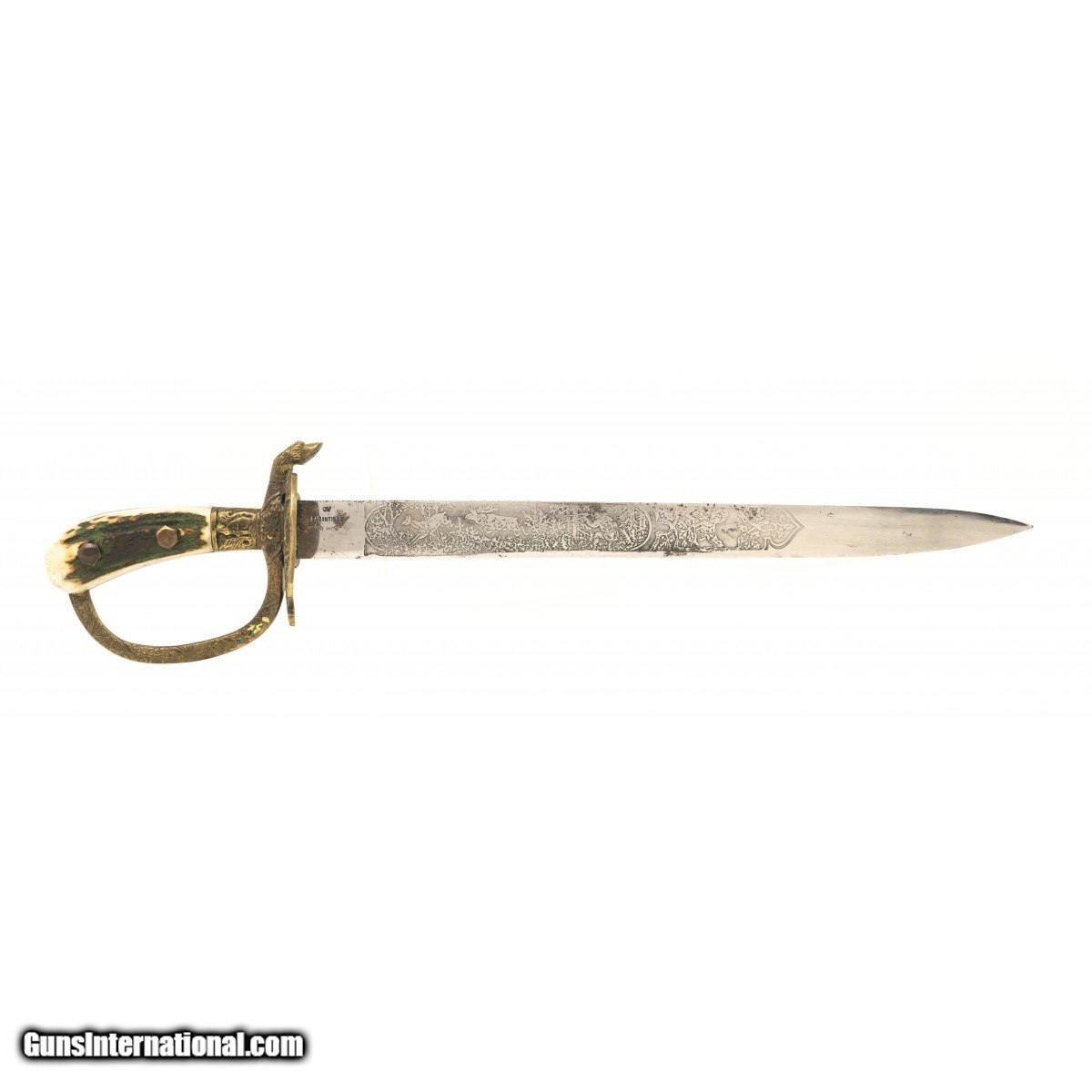 Description: " German hunting dagger by J.V. Garantiert. Blade is etched with various game scenes. Stag grips are excellent. Quillion is a hoof. Leather scabbard is very good with an acorn for the stud. Very good overall condition. Reasonably priced. SOLD |