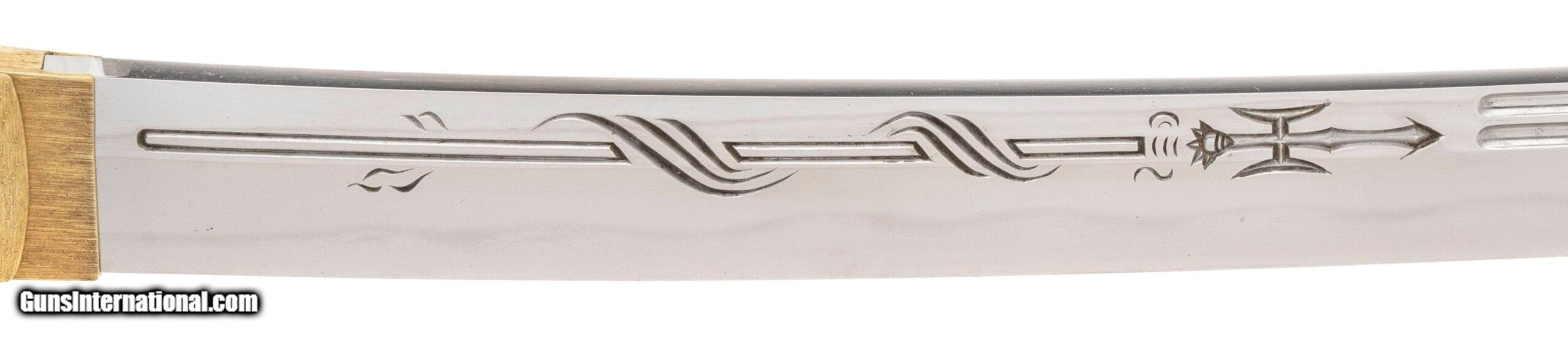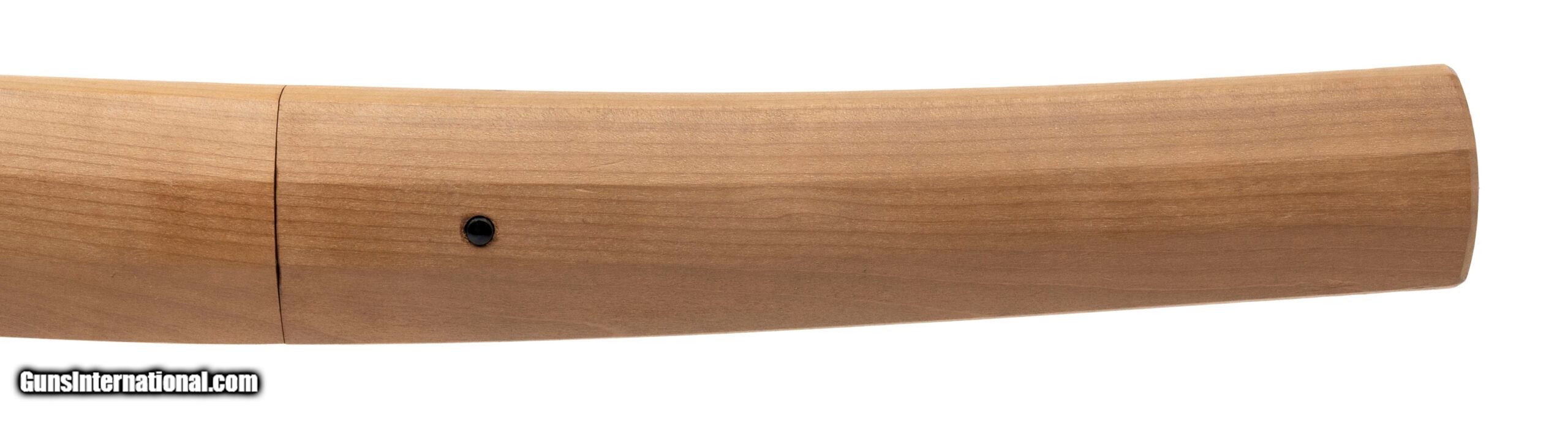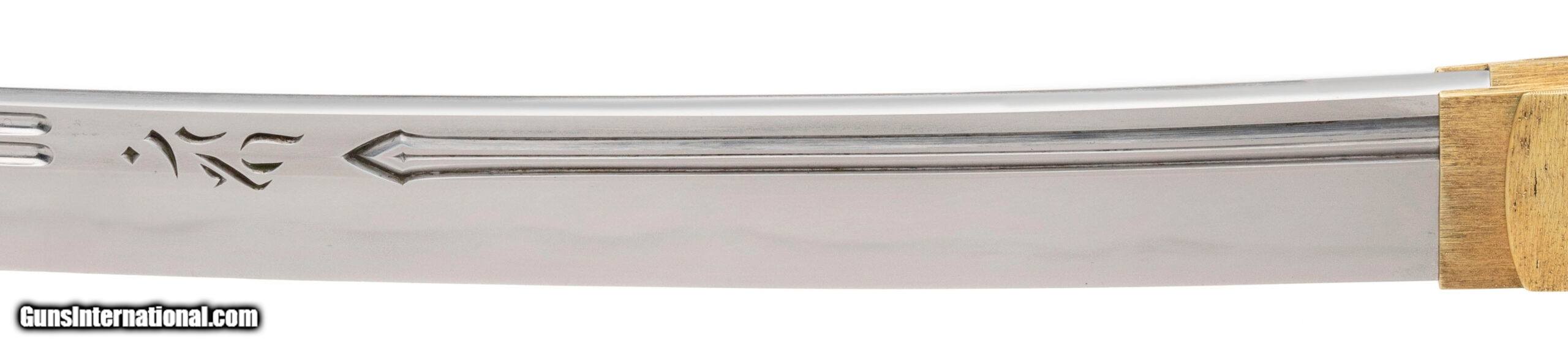Description: "A fine modern gendaito signed by Toyozumi Mitsunori (Kawachi no Kami) and dated July 1984 (Showa 59). The tang inscription further notes the blade was made for Mr. Yamano Gentaro, with the horimono carved in collaboration with Mitsunori himself. The blade measures 22 5/8 inches (57.5 cm), mounted in plain shira-saya. It features a bright gunome-midare hamon, well-executed bo-hi with soe-bi, and a bold horimono (stylized ken motif with bonji) carved into the ji. The kissaki is medium length with a clean boshi, and the blade remains in excellent polish with no visible flaws. This sword represents a high-quality late 20th-century commission, blending traditional forging with decorative horimono, Price: $7,500.00 Contact Seller |