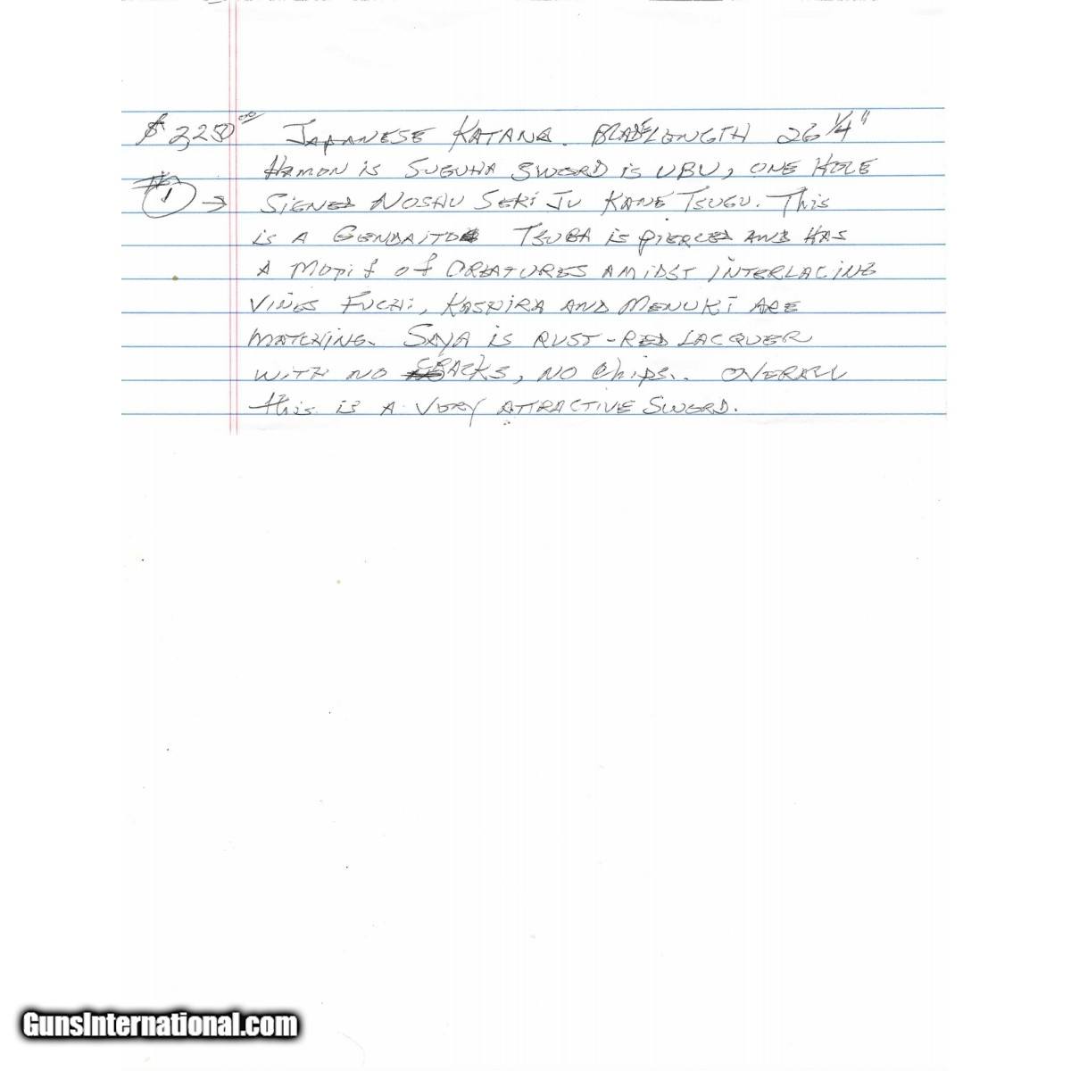 Description: "Blade Length is 26 ¾". Tang is Signed Noshu Seki Ju Kane Tsugu. This sword comes with a hand written write up from Japanese sword expert Mike Clark. SOLD |