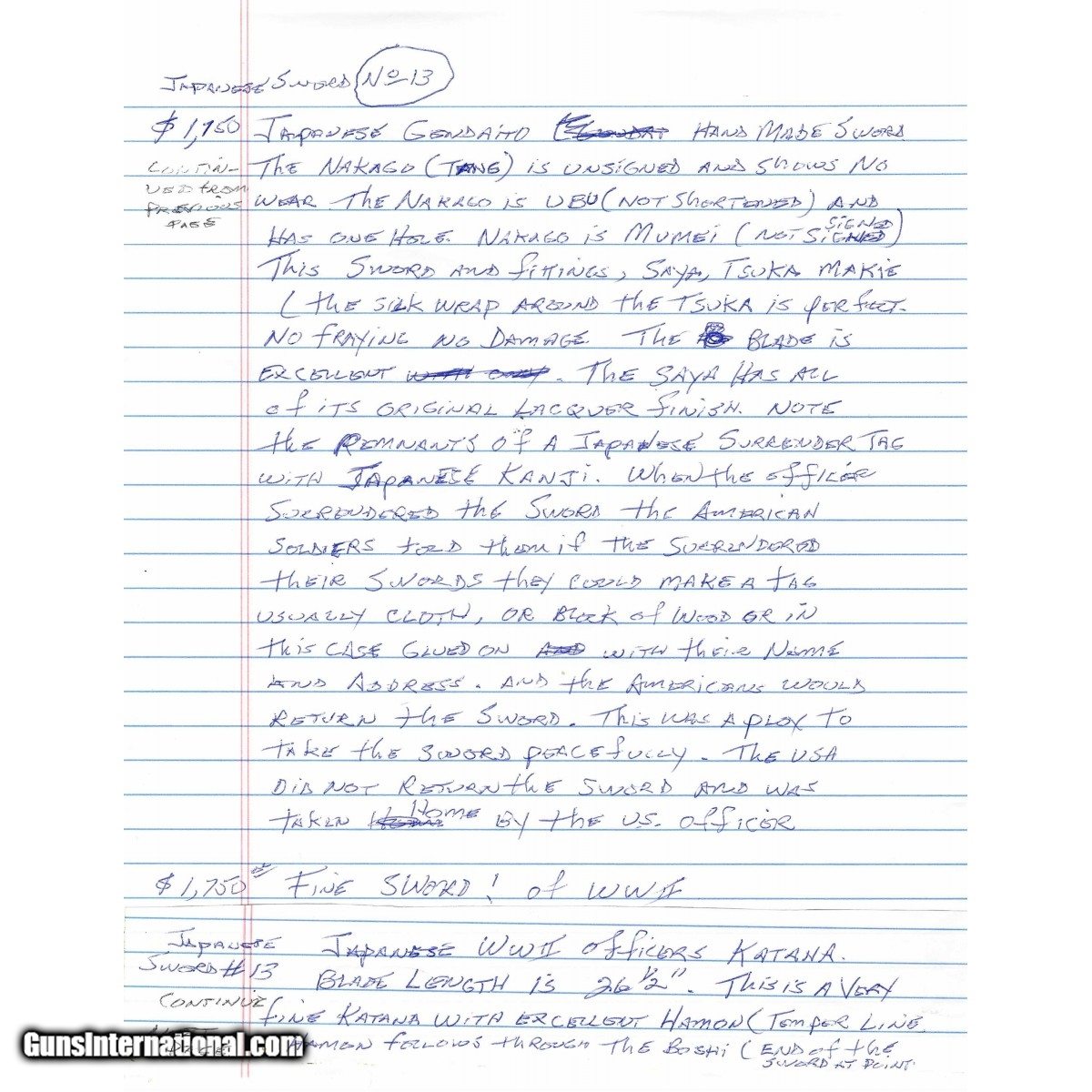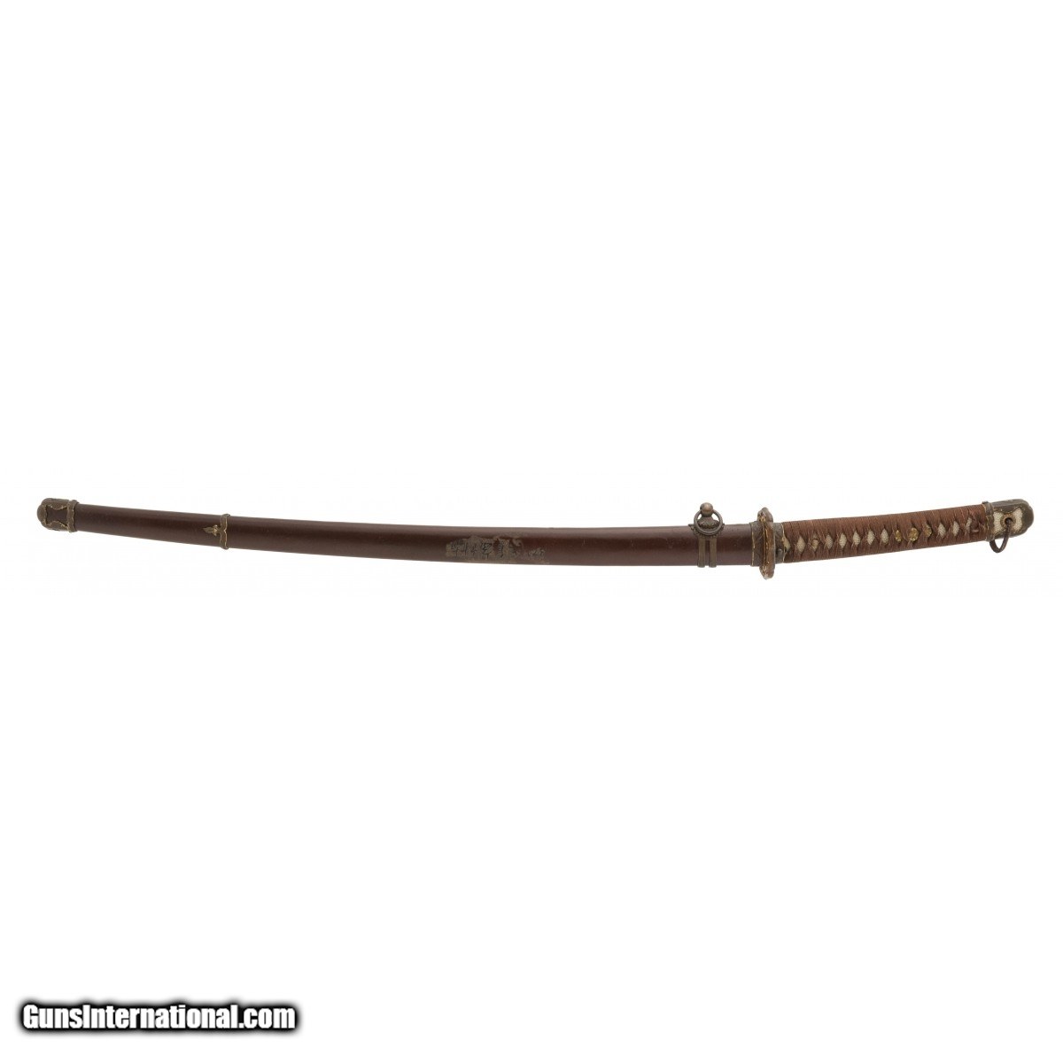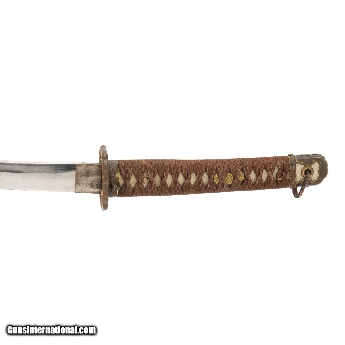 Description: "Blade length is 26 ½", Blade is unsigned and tang is not shortened. This is a handmade WWII era officer’s sword also known as a gendaito. This sword comes with a hand written write up from Japanese sword expert Mike Clark. SOLD |