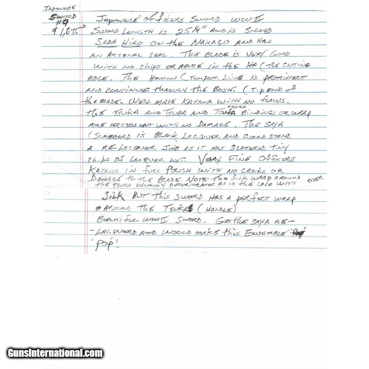 Description: "Blade length is 25 ¼". Tang is signed Sada Hiro. This is a WWII officers sword. This sword comes with a hand written write up from Japanese sword expert Mike Clark. SOLD |