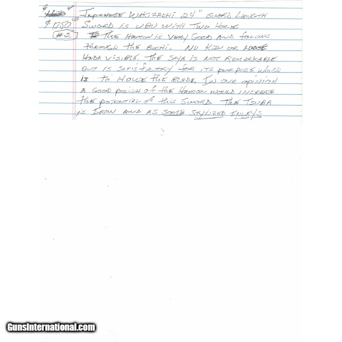 Description: "Blade length is 24" Sword is unsigned with 2 holes, so it was shortened and remiounted from a longer blade. This sword comes with a hand written write up from Japanese sword expert Mike Clark. SOLD |