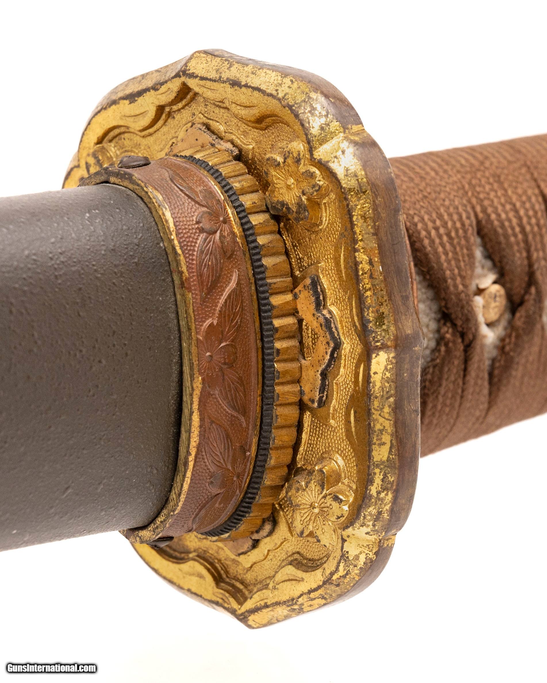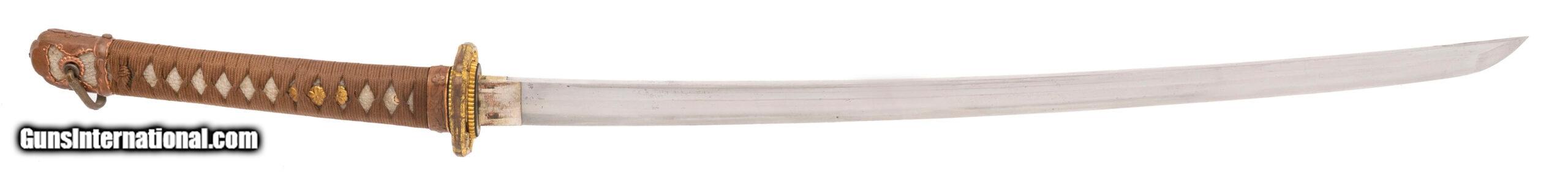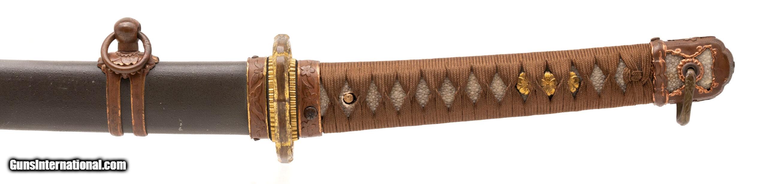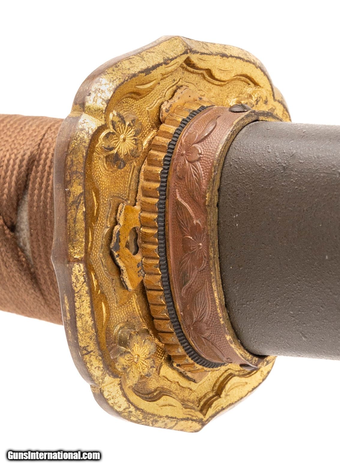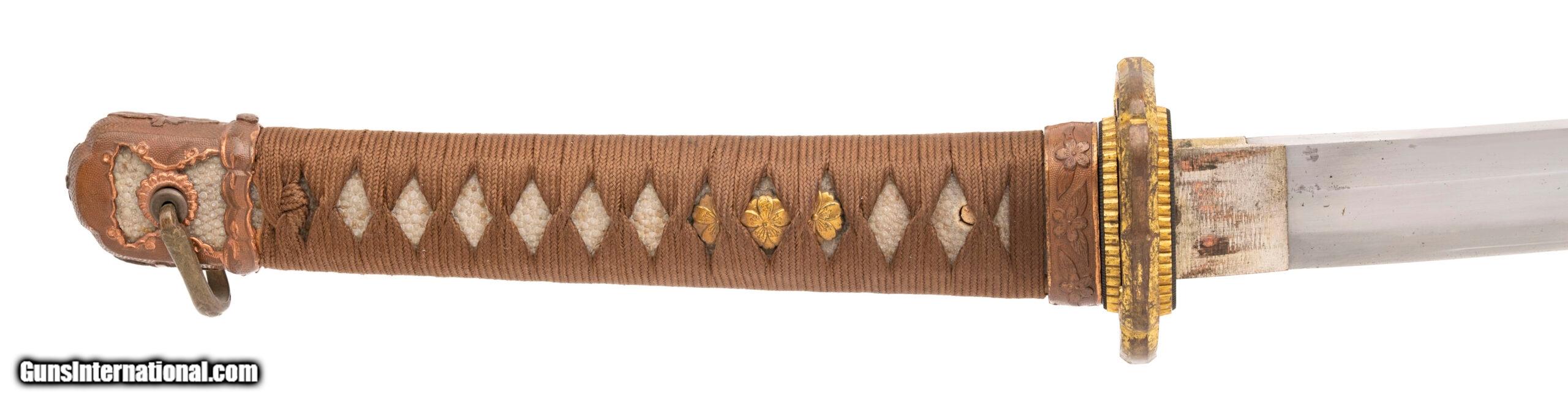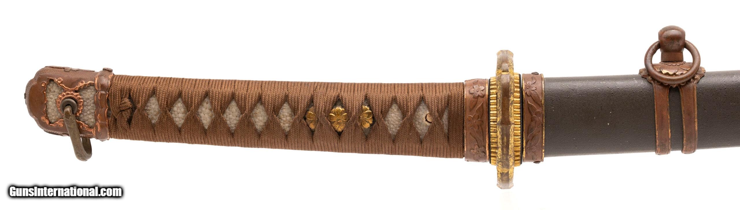 Description: "This is a World War II-era Japanese officer’s sword (shin-gunto), signed Munetsugu (??? – Munetsugu made this) with gold-inlaid mei, and dated Showa 19 (1944) on the reverse. The blade measures 24.5 inches in length and is forged in the shinogi-zukuri style with a bright polish, visible grain (hada), and a tempered edge line (hamon). The presence of the gold-inlaid signature indicates a higher-grade, special-order blade rather than a standard arsenal piece. Mounted in complete Imperial Japanese Army officer fittings, including a regulation brown-lacquered steel saya, gilt-brass tsuba with sakura motif, and a well-preserved tsuka with brown silk wrap over ray skin and floral menuki. Condition: Very good overall, with light handling marks on the blade and honest wear to the mounts. A desirable signed and dated gendaito from the final year of WWII, with the added distinction of an inlaid signature. SOLD |
