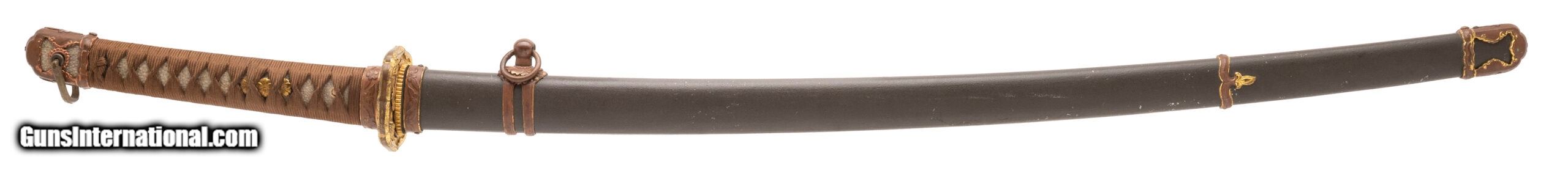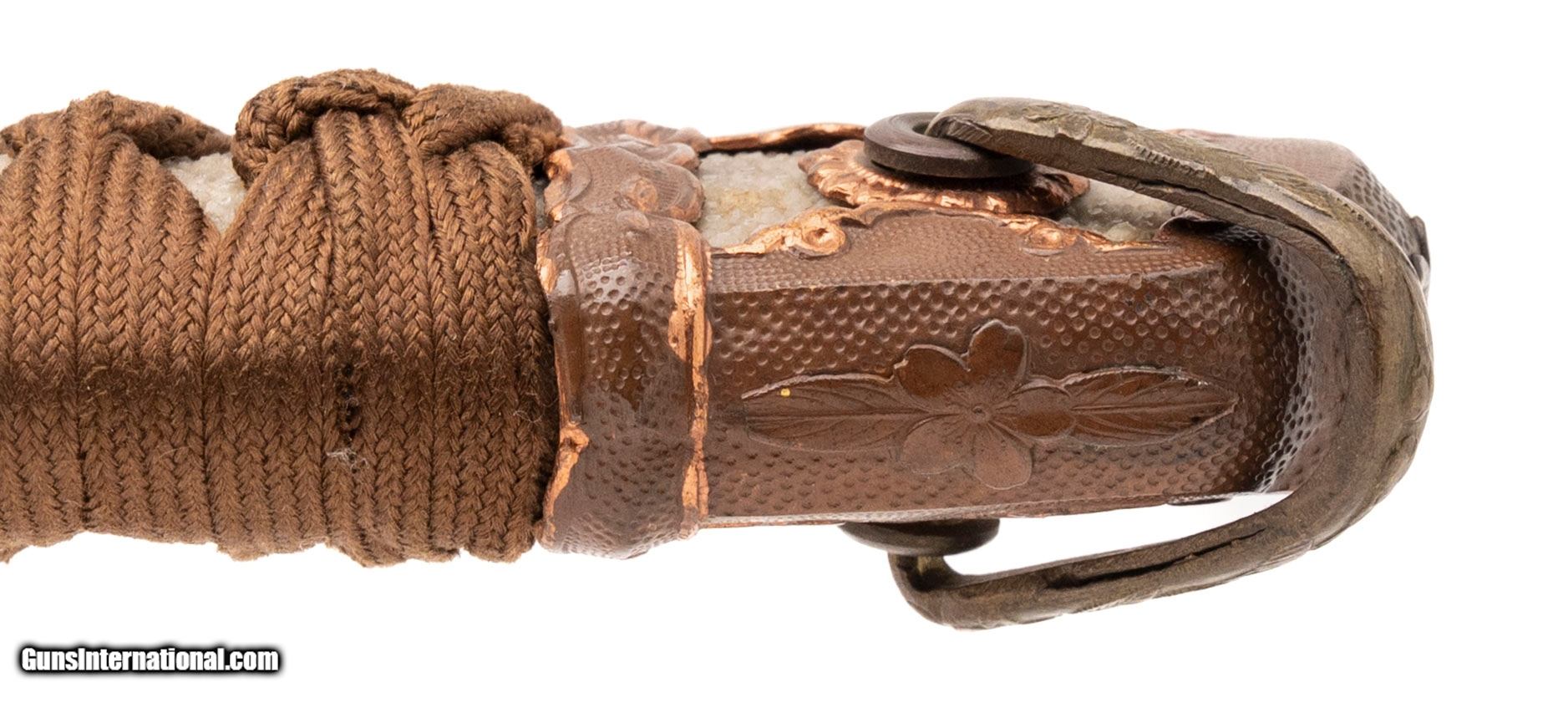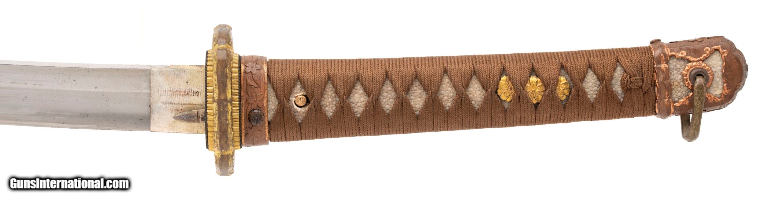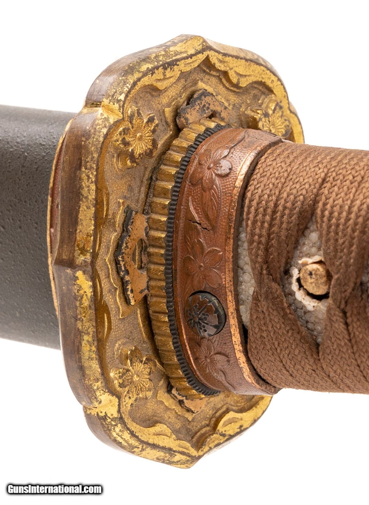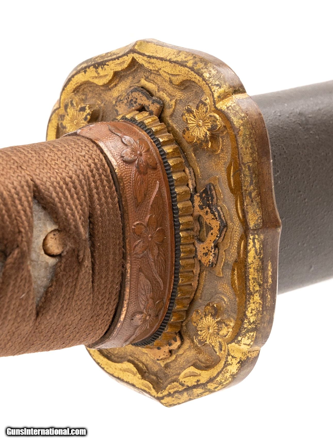Description: "This is a World War II-era Japanese officer’s sword (shin-gunto), signed Munetsugu (??? – Munetsugu made this) with gold-inlaid mei, and dated Showa 19 (1944) on the reverse. The blade measures 24.5 inches in length and is forged in the shinogi-zukuri style with a bright polish, visible grain (hada), and a tempered edge line (hamon). The presence of the gold-inlaid signature indicates a higher-grade, special-order blade rather than a standard arsenal piece. Mounted in complete Imperial Japanese Army officer fittings, including a regulation brown-lacquered steel saya, gilt-brass tsuba with sakura motif, and a well-preserved tsuka with brown silk wrap over ray skin and floral menuki. Condition: Very good overall, with light handling marks on the blade and honest wear to the mounts. A desirable signed and dated gendaito from the final year of WWII, with the added distinction of an inlaid signature. SOLD |