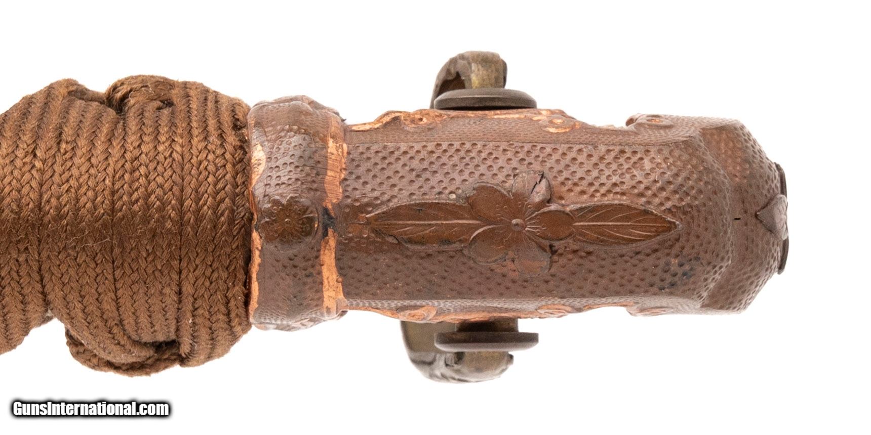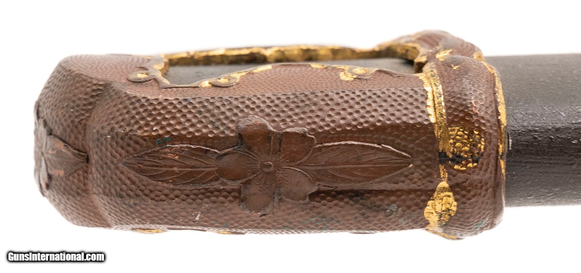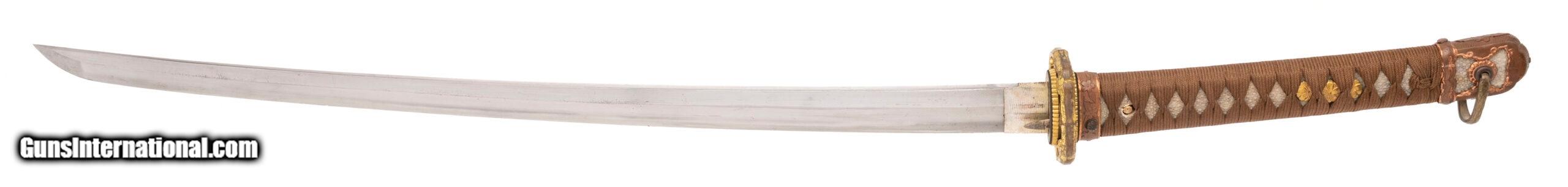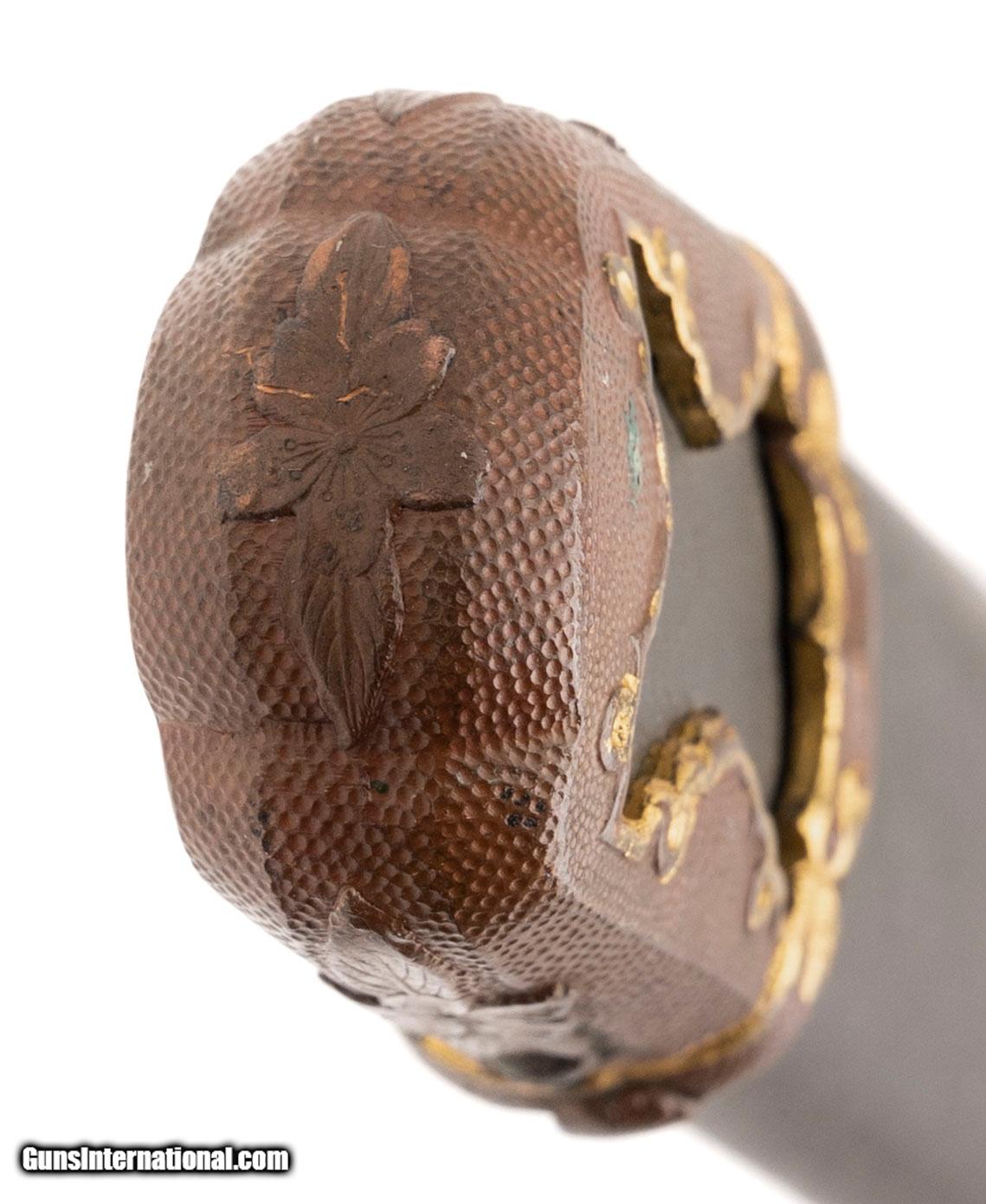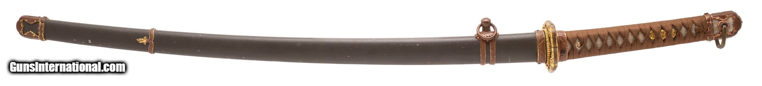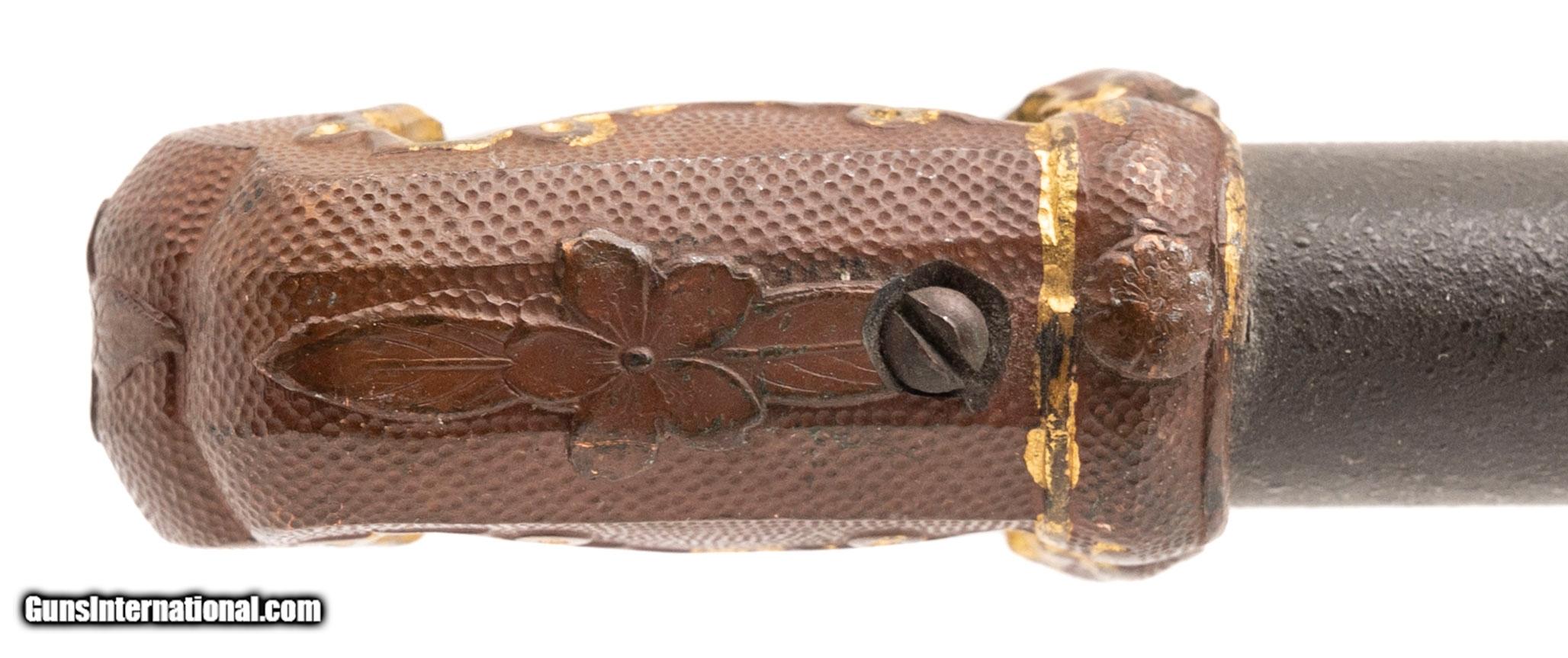Description: "This is a World War II-era Japanese officer’s sword (shin-gunto), signed Munetsugu (??? – Munetsugu made this) with gold-inlaid mei, and dated Showa 19 (1944) on the reverse. The blade measures 24.5 inches in length and is forged in the shinogi-zukuri style with a bright polish, visible grain (hada), and a tempered edge line (hamon). The presence of the gold-inlaid signature indicates a higher-grade, special-order blade rather than a standard arsenal piece. Mounted in complete Imperial Japanese Army officer fittings, including a regulation brown-lacquered steel saya, gilt-brass tsuba with sakura motif, and a well-preserved tsuka with brown silk wrap over ray skin and floral menuki. Condition: Very good overall, with light handling marks on the blade and honest wear to the mounts. A desirable signed and dated gendaito from the final year of WWII, with the added distinction of an inlaid signature. SOLD |
