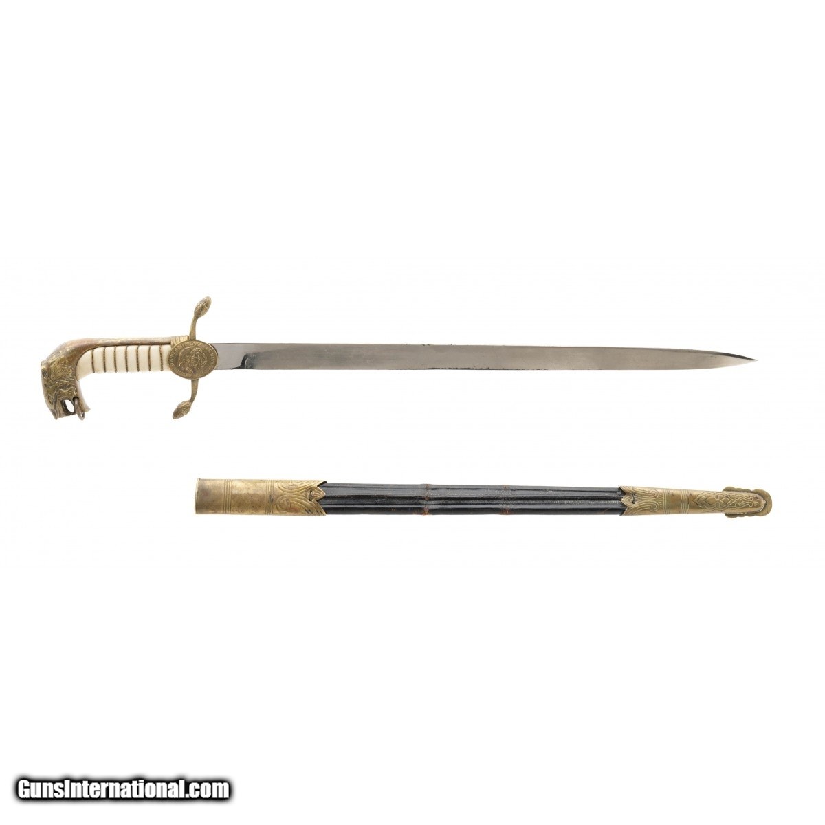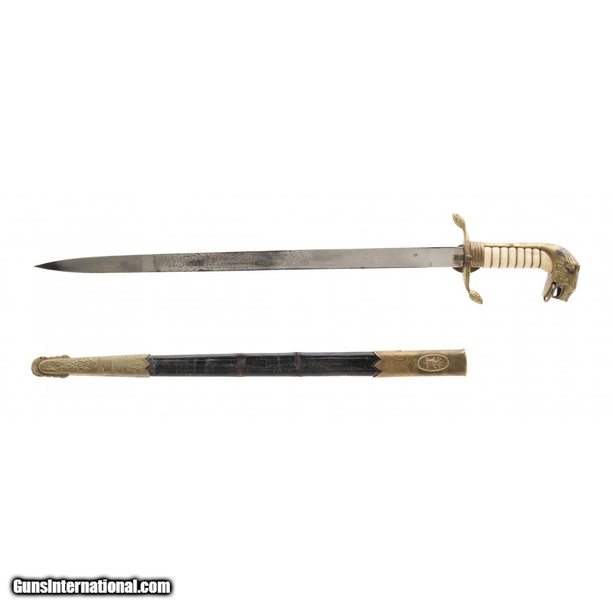 Description: " Rare Mexican Military Academy Short Sword for cadets in good condition. The Medallion on the crossguard is marked""Academia Militarizada Mexico D.F. Tacubaya. The Seal of Mexico with eagle killing a snake.Below on the fitting for the throat is an oval medallion of a shield with crossed cannons and lighting bolts.The sword is secured to the scabbard with a button catch to secure the crossguard to the throat fitting.The scabbard has some creasing to the black leather. But no breakage.The grip is a white cast material held to the hilt by double strand brass wire.The pommel is cast in the figure of a Lion or Jaguar. SOLD |