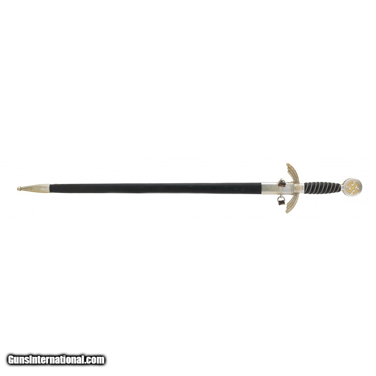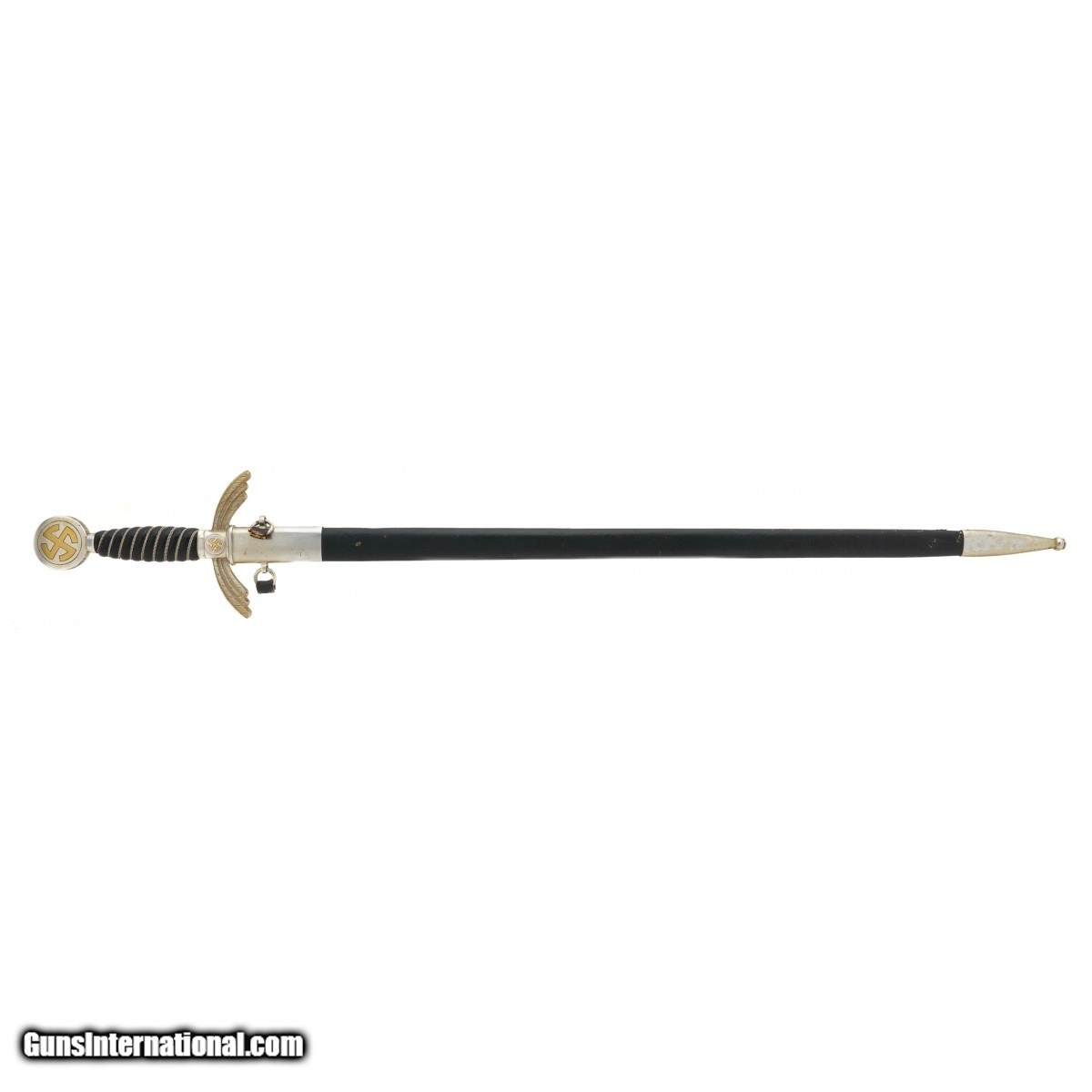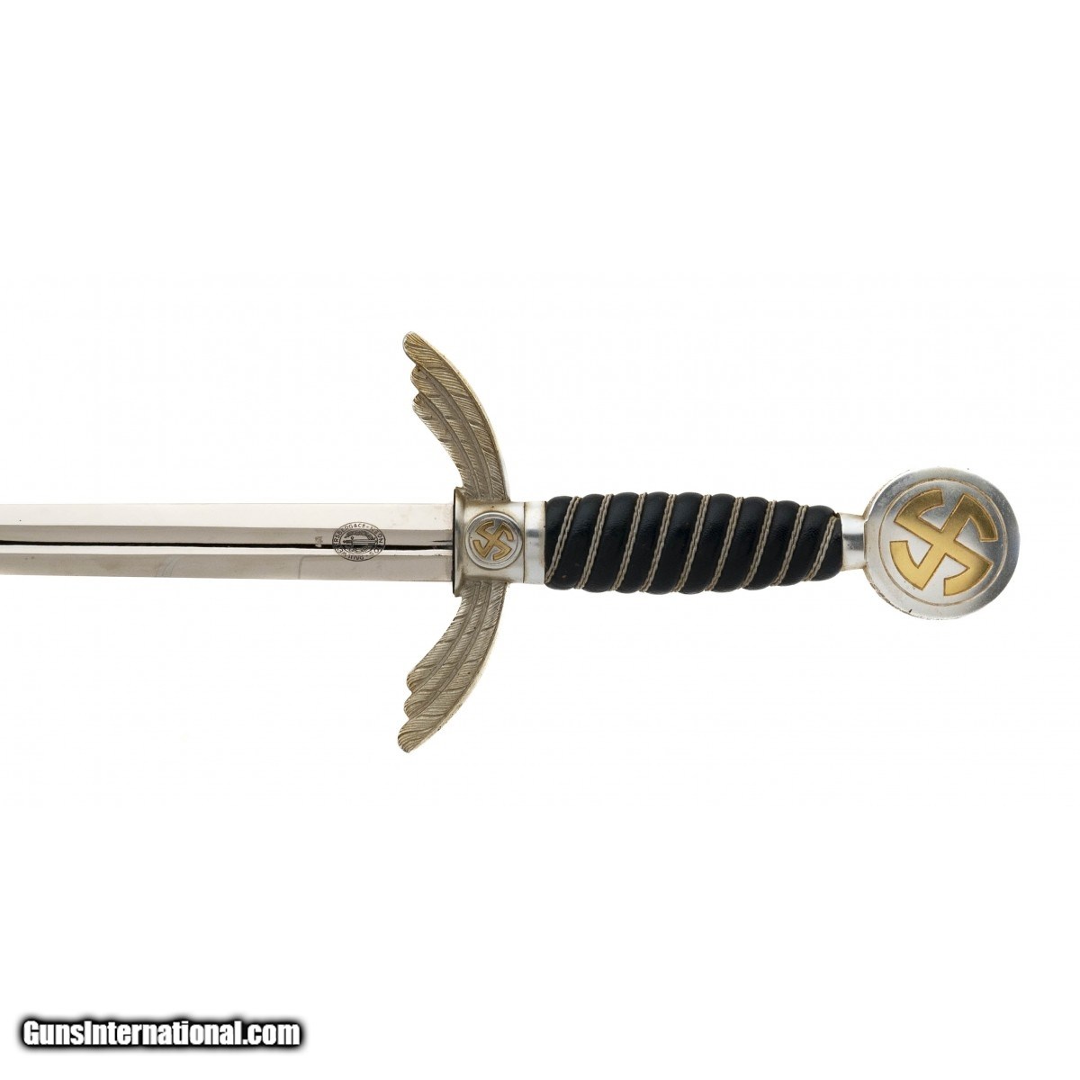 Description: " WWII German Luftwaffe Officers Sword in Excellent Condition. Mint Blade by Paul Weyersberg & Co. Solingen. Blue grip leather and wire wrap intact. Gold on Swastikas still present. Blue Leather Near End of Scabbard Has Split. SOLD |
