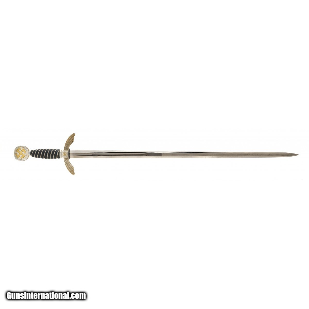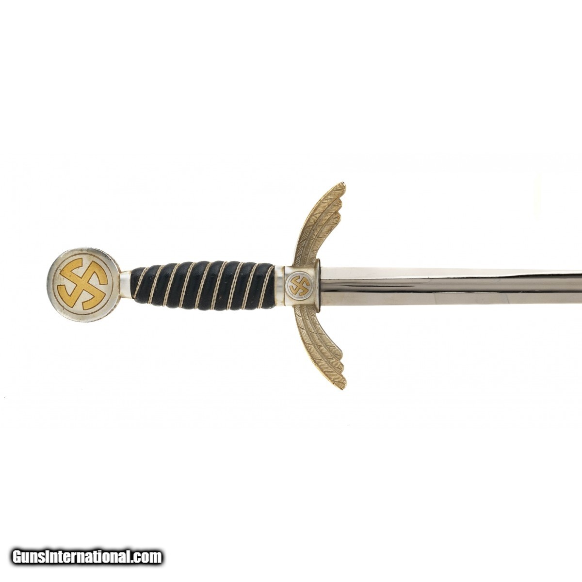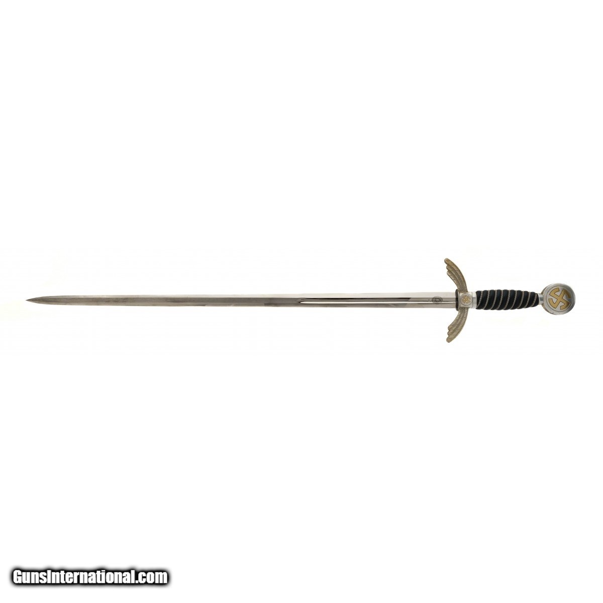 Description: " WWII German Luftwaffe Officers Sword in Excellent Condition. Mint Blade by Paul Weyersberg & Co. Solingen. Blue grip leather and wire wrap intact. Gold on Swastikas still present. Blue Leather Near End of Scabbard Has Split. SOLD |