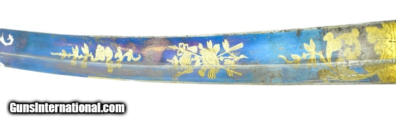 Description: U.S. Eagles Head Officers Saber. Circa 1820’s-1830’s. 30” Blade with fire blue finish, gilt floral motifs, panoply of arms, Back is marked “JL & Co.”. Eagle head pommel. Checkered ivory grip. Scabbard has dents and dings; blade comes out easily. A fine piece of American history SOLD |