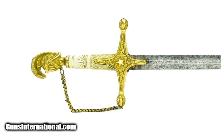 Description: U.S. Militia Officers Sword. Circa 1840’s-1850’s. Helmet head pommel with ivory grips. Knuckle guard consists of two chains from pommel to quillion. Blade is approximately 30” with floral motif. Approximately 37½” overall length. Scabbard is very good plus, no dings or dents, and has an eagle clutching shield and arrows. A handsome militia officers sword! SOLD |