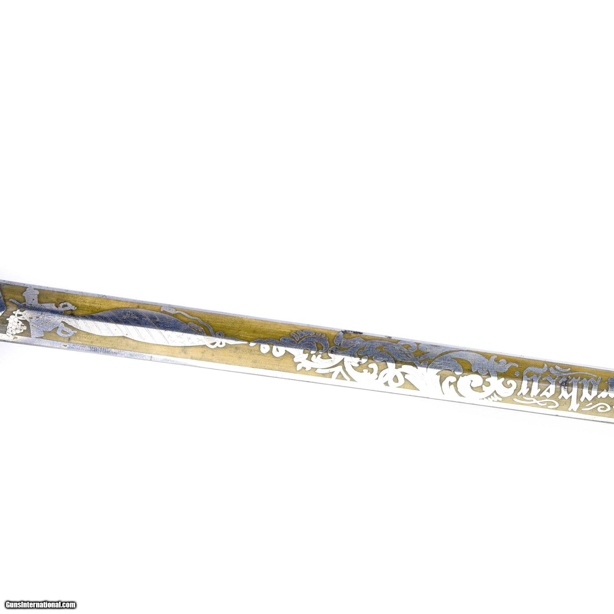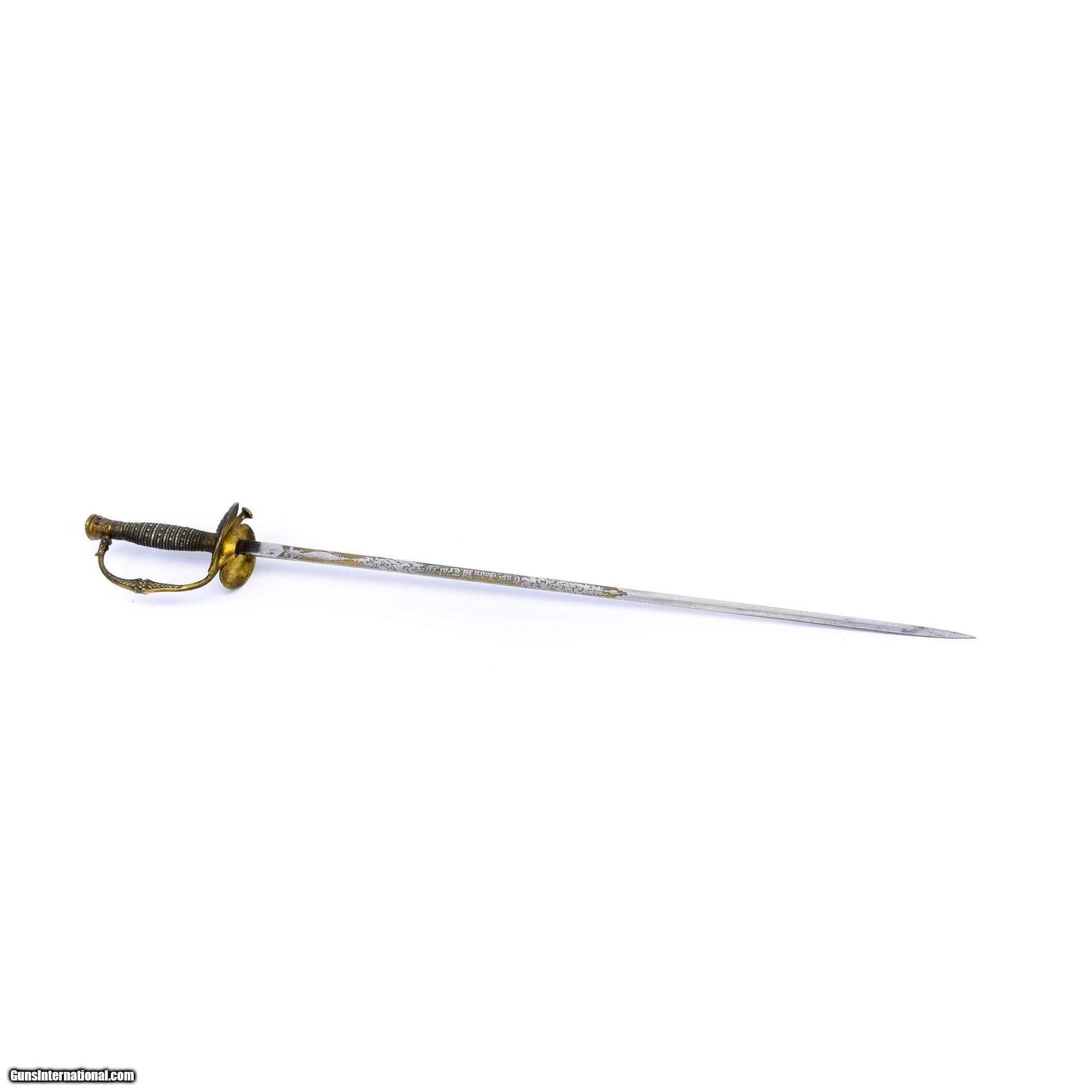 Description: Model 1860 U.S. Staff and Officer's Sword and Scabbard. Excellent condtition, gold wash on the hilt with ornate metal grip. Good scrabbard with gold gilt and exceptionally ornate mounts. Likely post Civil War. PERIOD: Circa 1860 ORIGIN: American infantry SIZE: 34 3/4" L 28" blade SOLD |