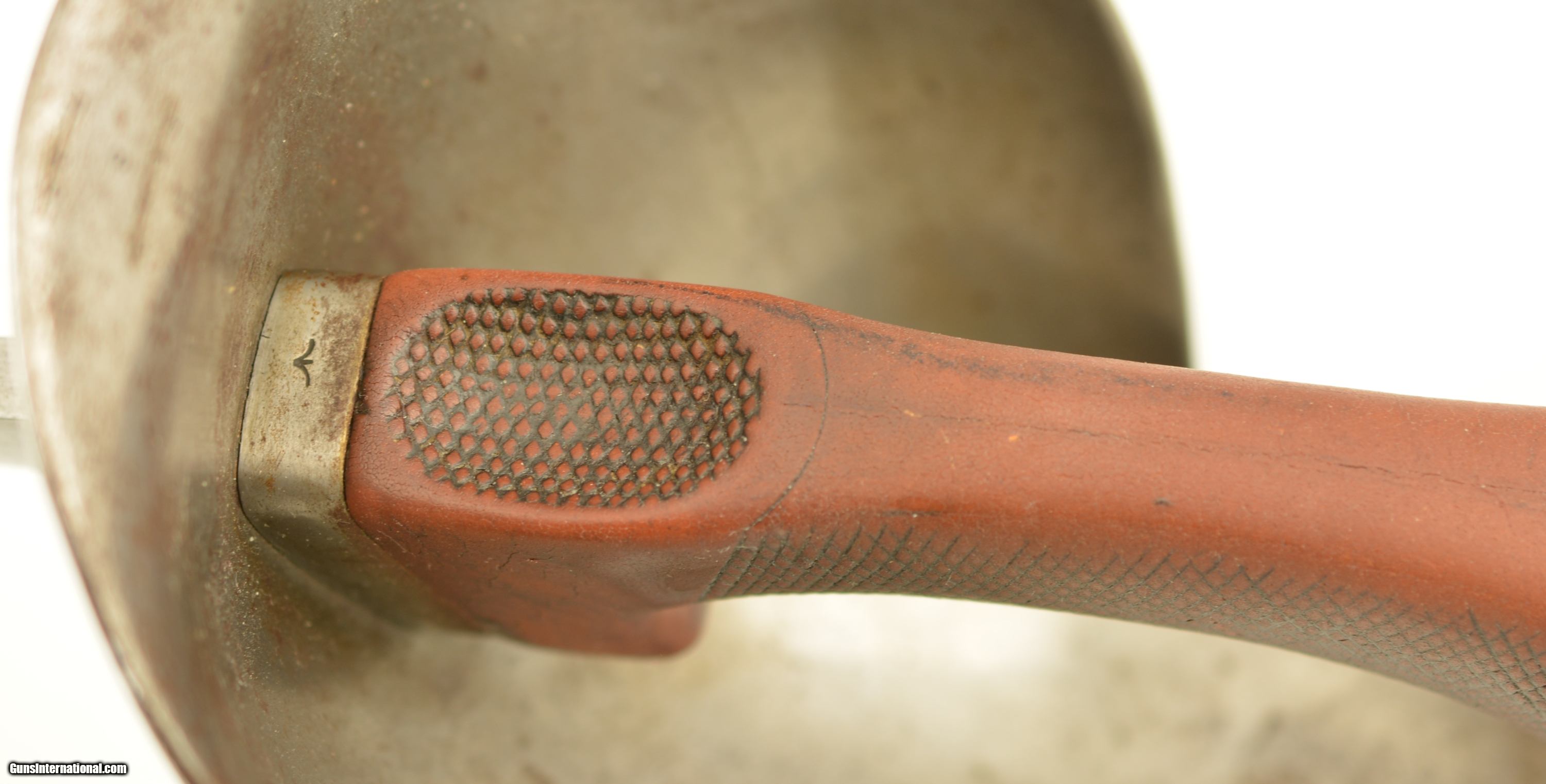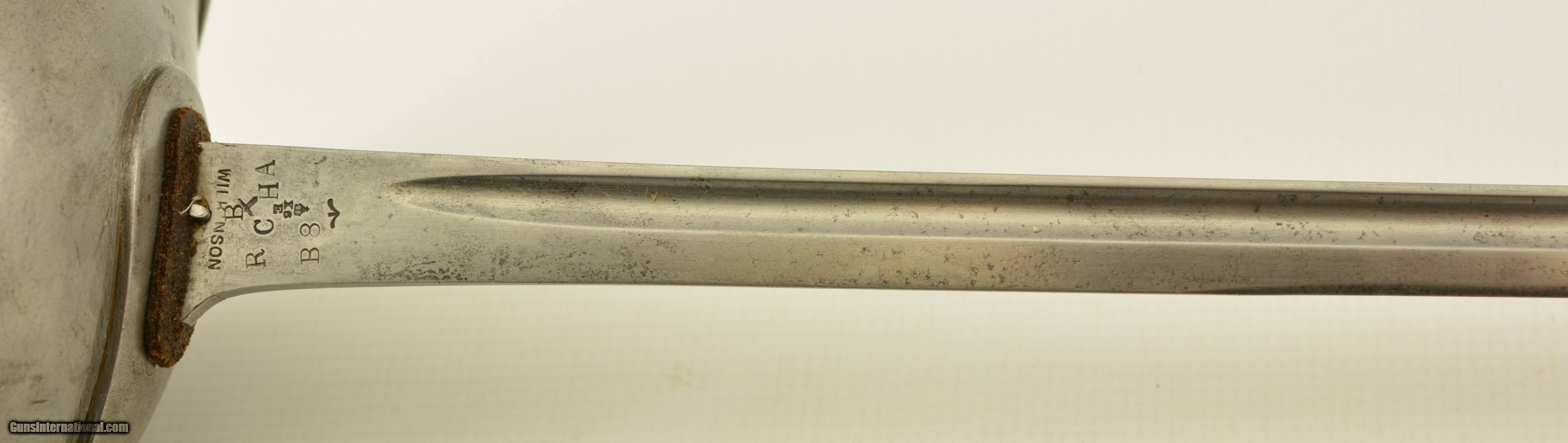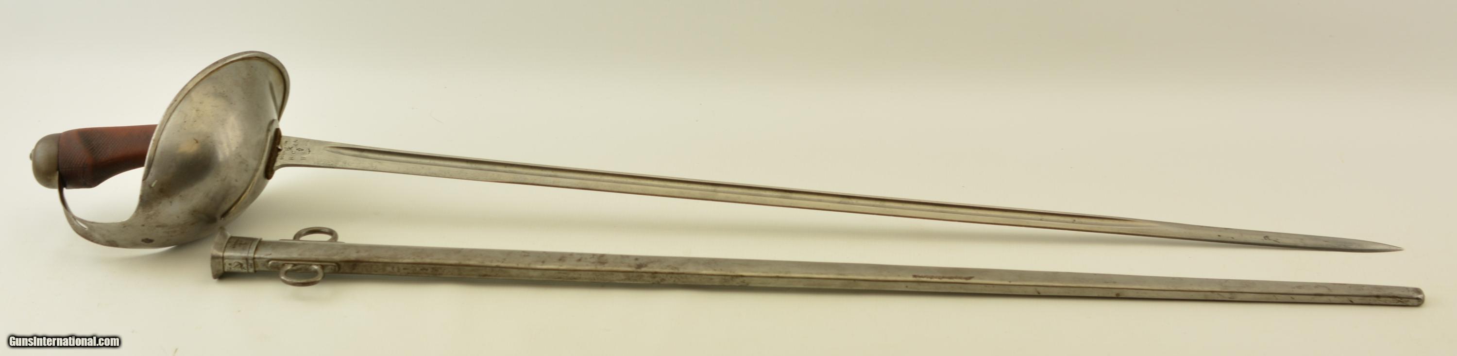 Description: This is a Wilkinson-made sword that measures 42 1/4" overall, with a 35" straight, thrusting blade having long, single fullers. The blade has an overall dull, pewter gray patina with thin freckling along the entire length. The ricasso is dated “10 ’15" on the reverse, “WILKINSON" with Broad Arrow and unit stamps on the obverse: “RCHA / B8" (Royal Canadian Horse Artillery, Battery 8). The cup-type guard has an overall matching gray patina with spots of mild surface oxidation throughout, as well as a struck out issue stamp on the interior: “RCHA / 8 / 7. 19". The ruddy-brown composite grip has some surface crazing, and wear to the knurling and checkering. The domed pommel has a darker brown patina with matching appearance on the exposed capstan nut. The steel scabbard has an identical mottled gray-brown patina with no dents or major blemishes. Further struck out issue markings are present at the throat: “PLDG / 197" (Princess Louise Dragoon Guards); and “RMC RE" (Royal Military College). This is a fine example of a seldom seen, Canadian marked Pattern 1908 Cavalry Sword overall. SOLD Manufacturer: British Model: Sword |