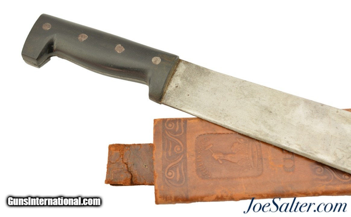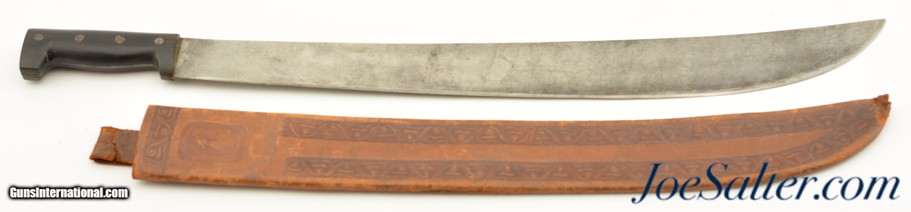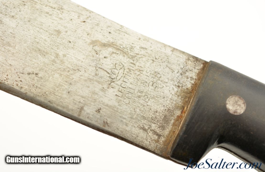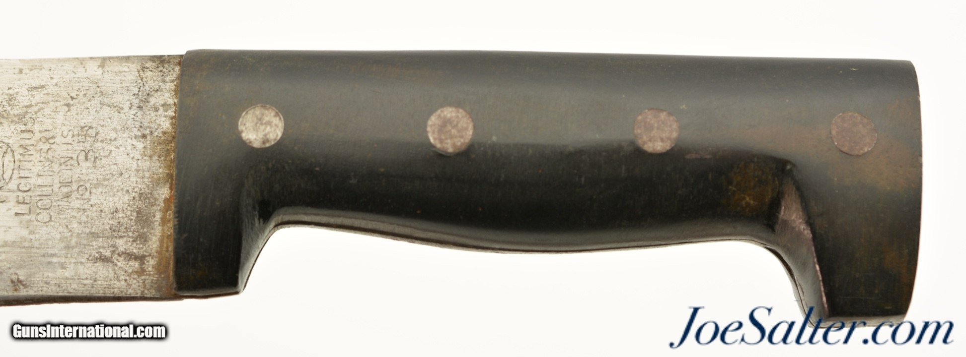 Description: This is a #35 Collins & Co Legitimus Machete in very good condition. The blade is 22" and has some light oxidation, heaviest at the base that meets the handle. The cutting edge is relatively free of any damage. The handle is in fine condition, the 4 rivets are tight and correct. Come with the matching Collins & Co Legitimus #13 scabbard which is in very good condition with heavy tooling work and tight stitching with a cut in the belt loop. Over-all a very good example of a post war machete.; SOLD |