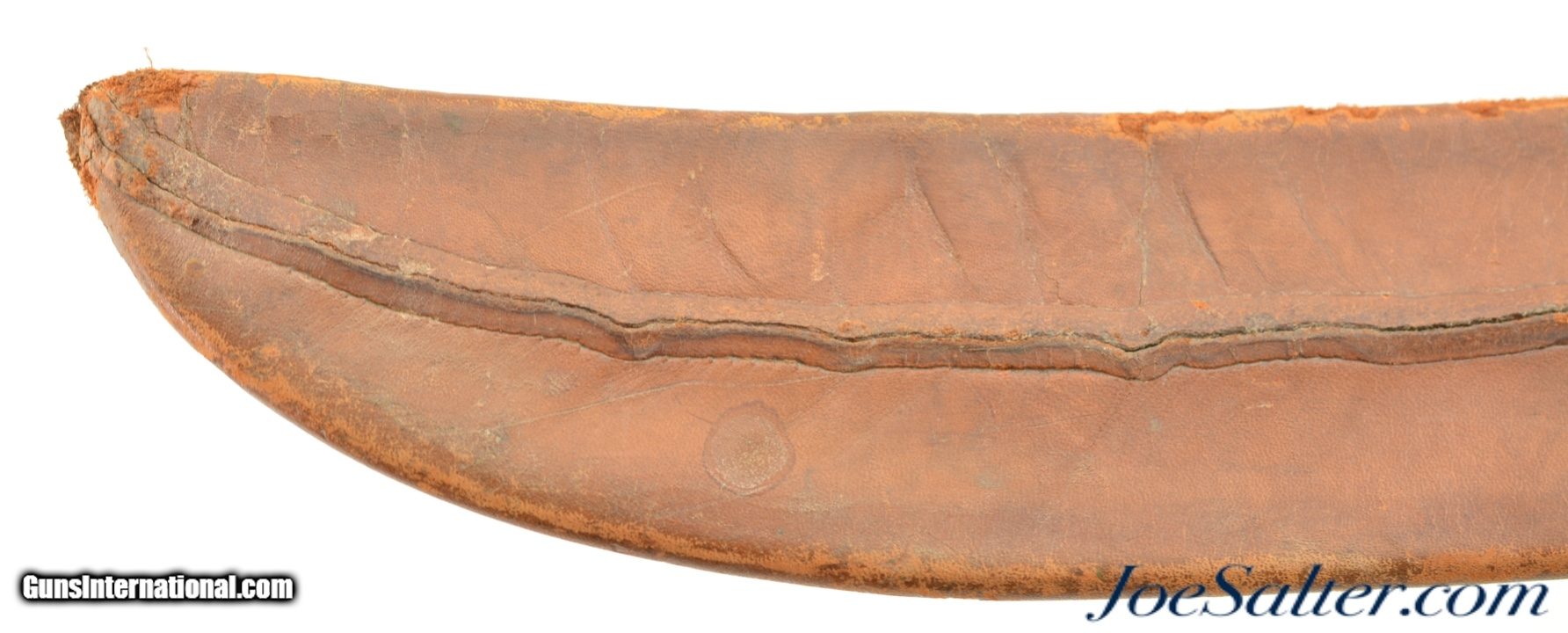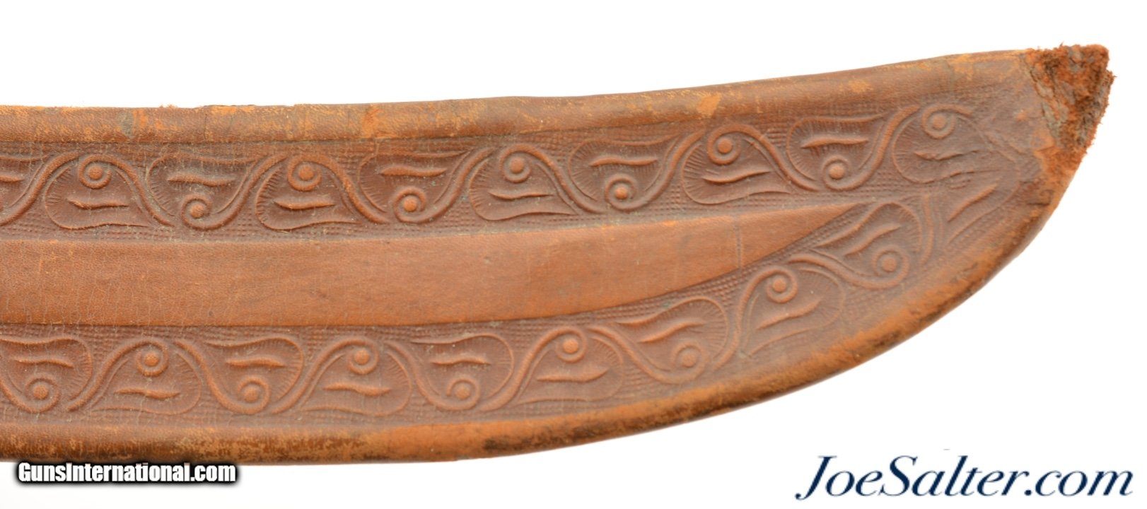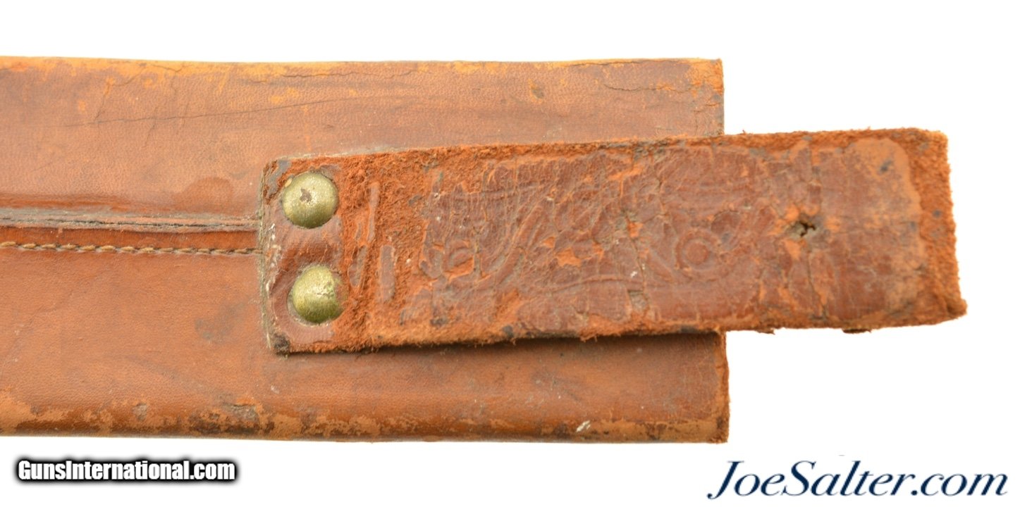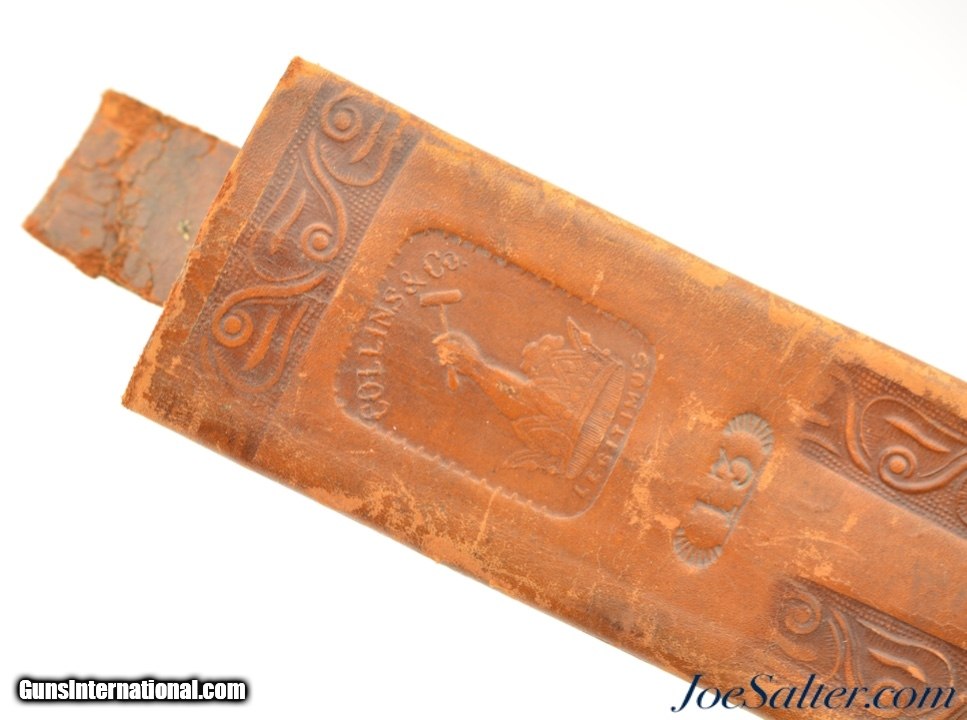 Description: This is a #35 Collins & Co Legitimus Machete in very good condition. The blade is 22" and has some light oxidation, heaviest at the base that meets the handle. The cutting edge is relatively free of any damage. The handle is in fine condition, the 4 rivets are tight and correct. Come with the matching Collins & Co Legitimus #13 scabbard which is in very good condition with heavy tooling work and tight stitching with a cut in the belt loop. Over-all a very good example of a post war machete.; SOLD |