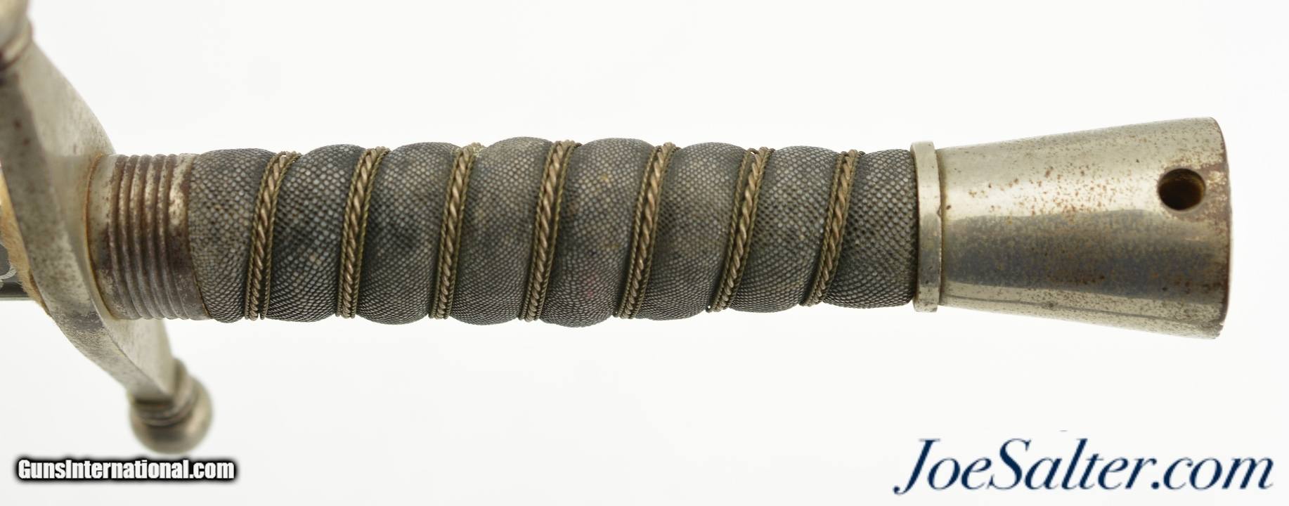 Description: This is a very handsome sword that measures 39 1/4" overall, with a 33" straight, double-edged blade with narrow single fullers and intricate etched panels on both faces. The blade retains nearly all of the bright original factory polish, with only some scattered small spots of mild freckling on either side, mostly concentrated towards the tip. The obverse panel has delicate filigree motifs flanking a crown with sunburst, the Scottish Thistle, and the HLI crest (rifle horn with HLI within the loop). The reverse has the crown with sunburst, George V cypher, and retailer marking on the long ricasso: "C. REEVES & Co. / LTD / WEST ST / REGENT ST / LONDON / & W &." The guard has straight quillons with orb-shaped finials, grooved ferrule, and slightly worn shagreen grip with intact braided wire wrap and plumb bob-shaped pommel. The sword is housed in the original metal scabbard that has retained 95-97% of a black paint finish with some scattered areas of flaking and freckling. This is a splendid example of a Scottish cross-hilt broadsword, and would make a wonderful item for display. SOLD |
