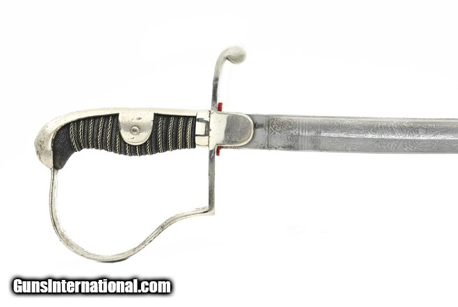 Description: German Pre-WWII NCO Dress sword. Ricasso is “Wh & C.” marked. Blade is approximately 32” and is etched with several panoply of arms. Scabbard is good with some minor dents. Wire wrap is excellent and ray skin grip is very good plus. Very good overall condition. SOLD |